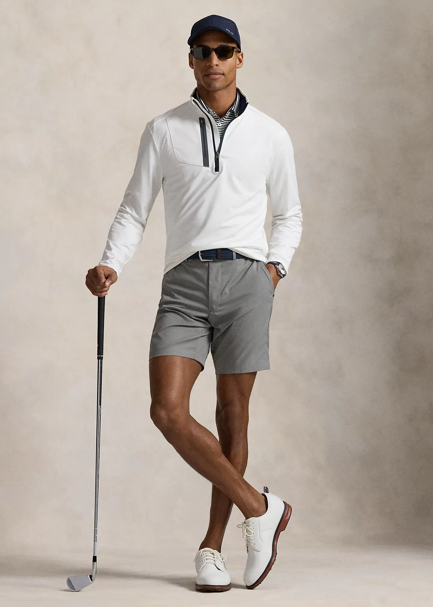 - Two front angled pockets. Right hip coin pocket. Concealed right-side on-seam zipped pocket. Two back welt pockets. Signature rivet at the front left pocket. “RLX” label at the back right pocket.