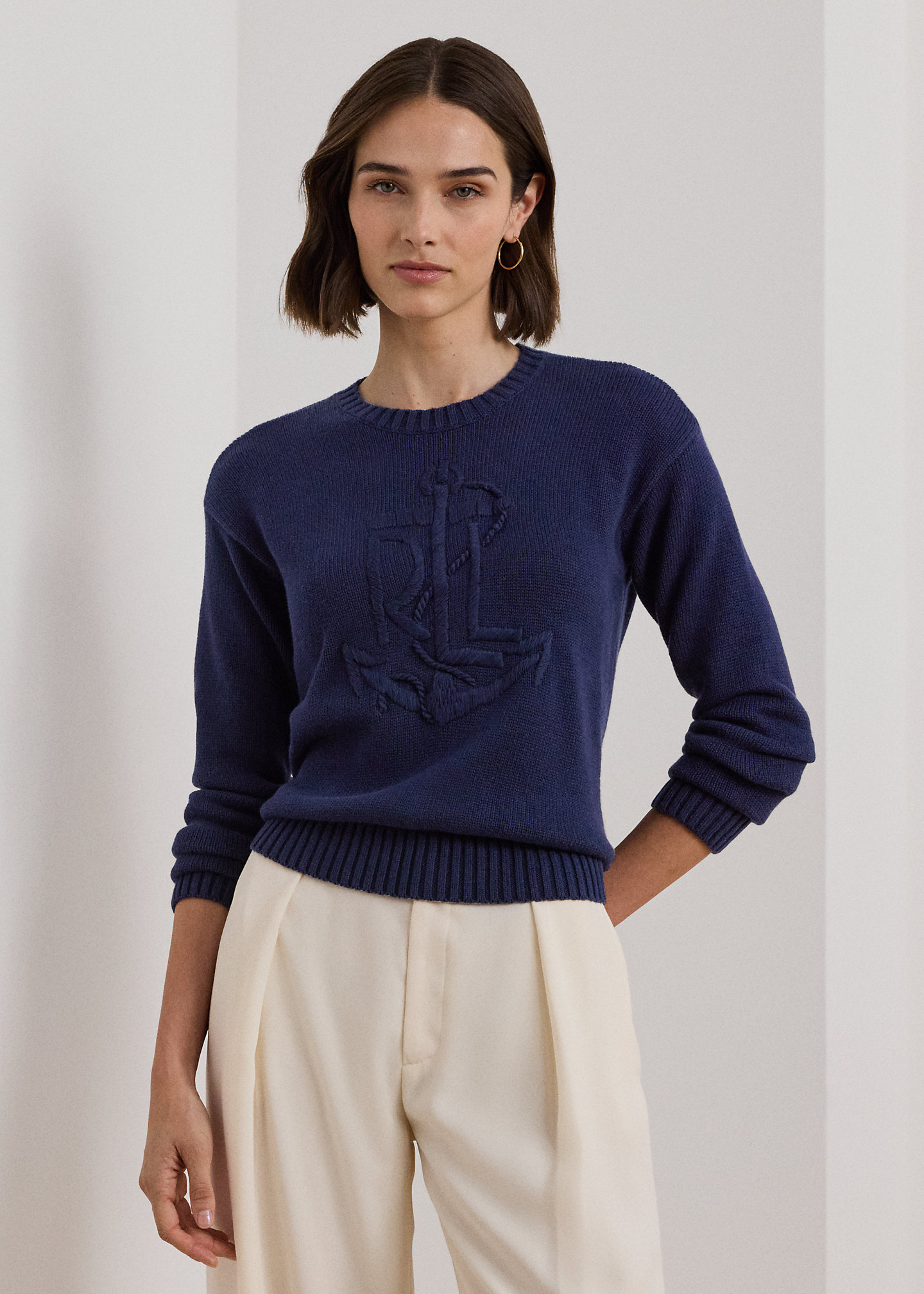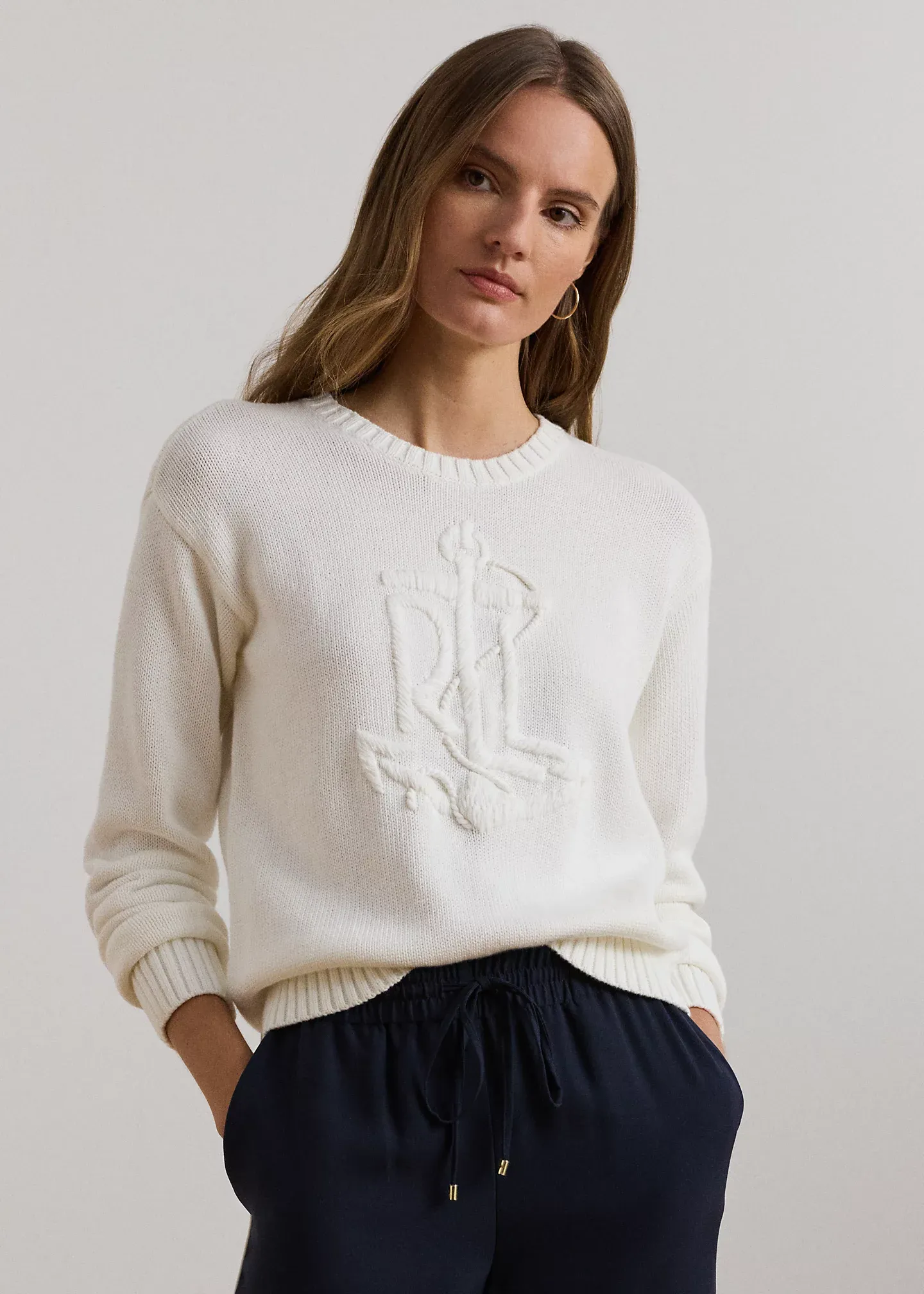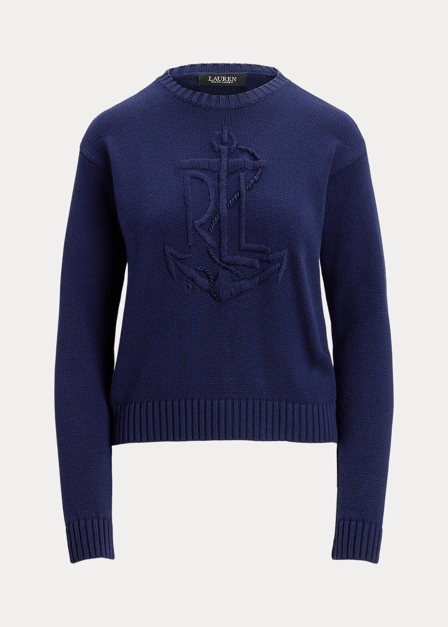 - Long sleeves with ribbed cuffs. Dropped shoulders. Hand-embroidered, oversize “LRL” logo with an anchor at the front. Ribbed hem.