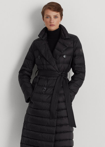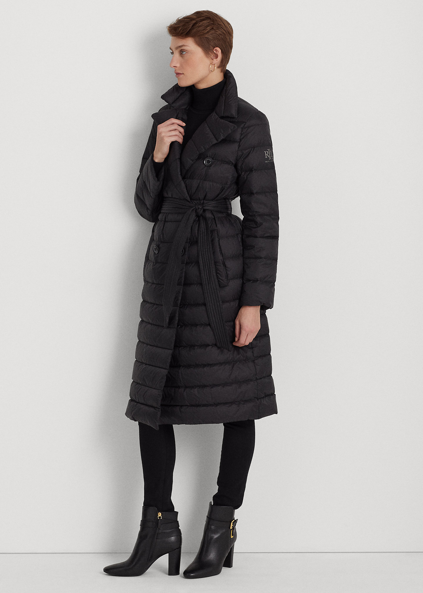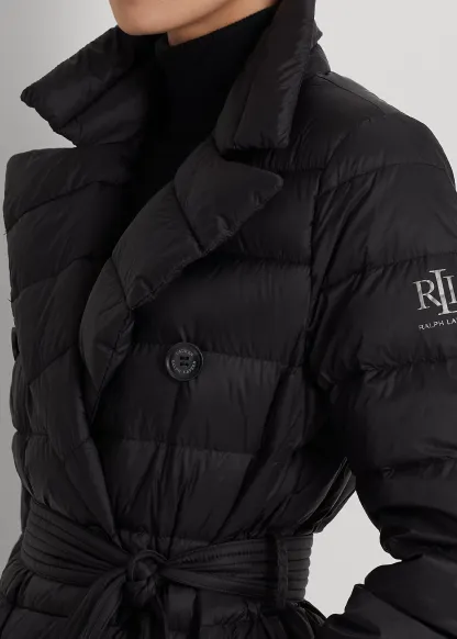 - Notch lapels. Double-breasted silhouette. "Lauren Ralph Lauren"–engraved horn-effect buttons.