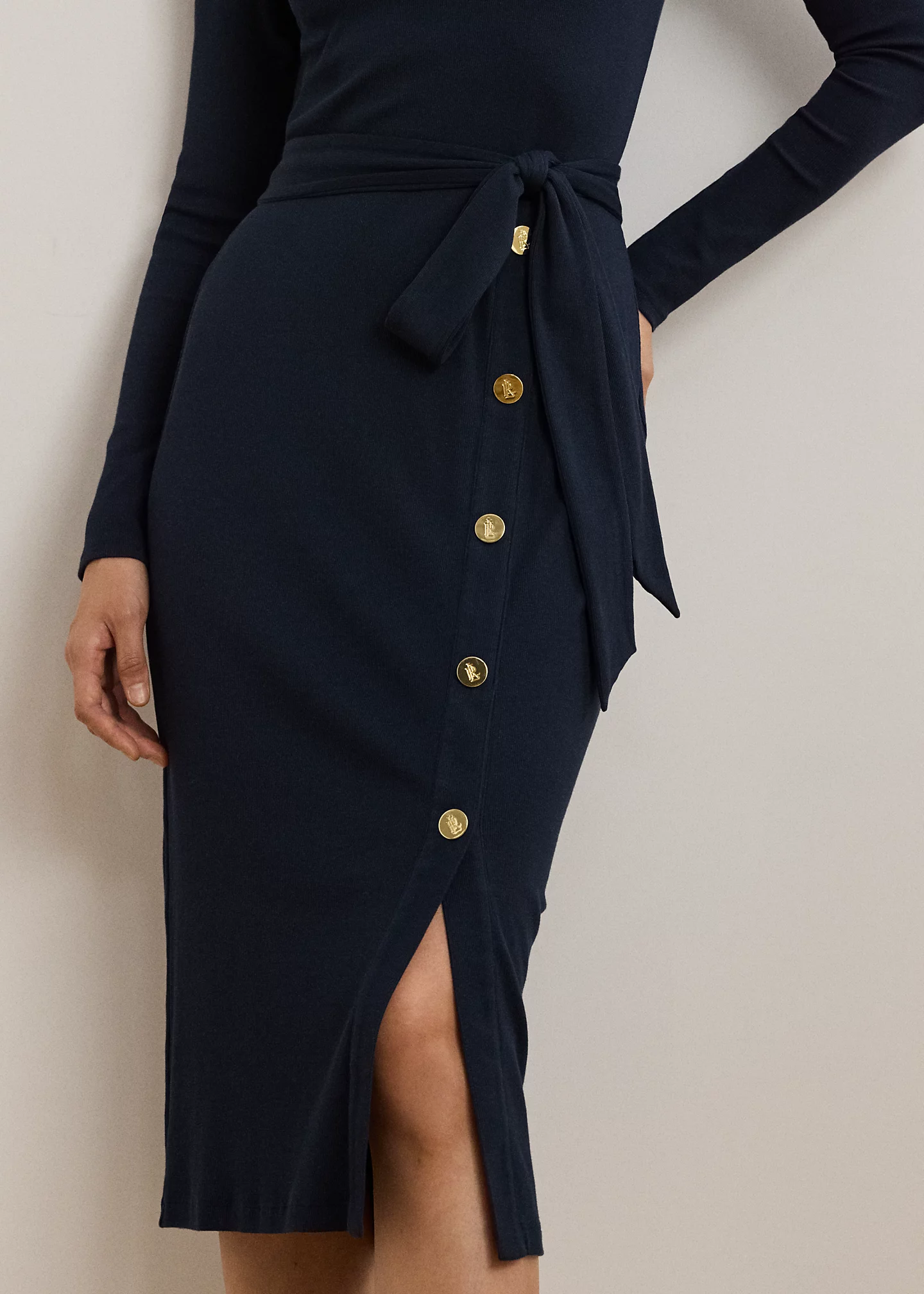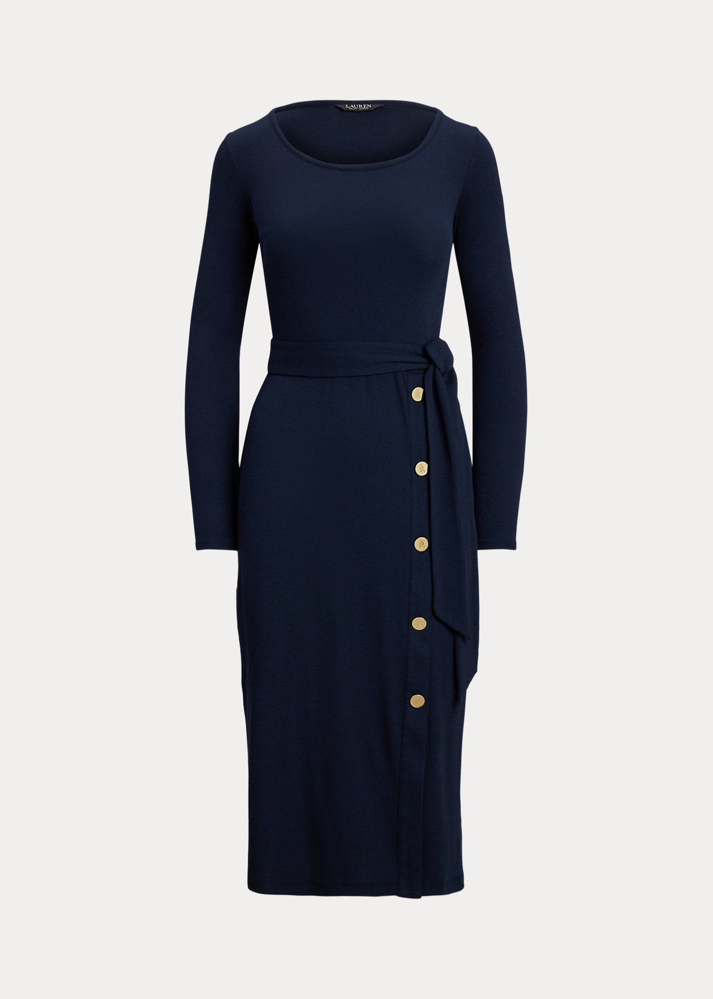 - Rounded neckline. "LRL"-engraved buttoned placket at the skirt.