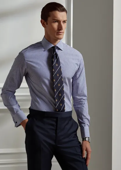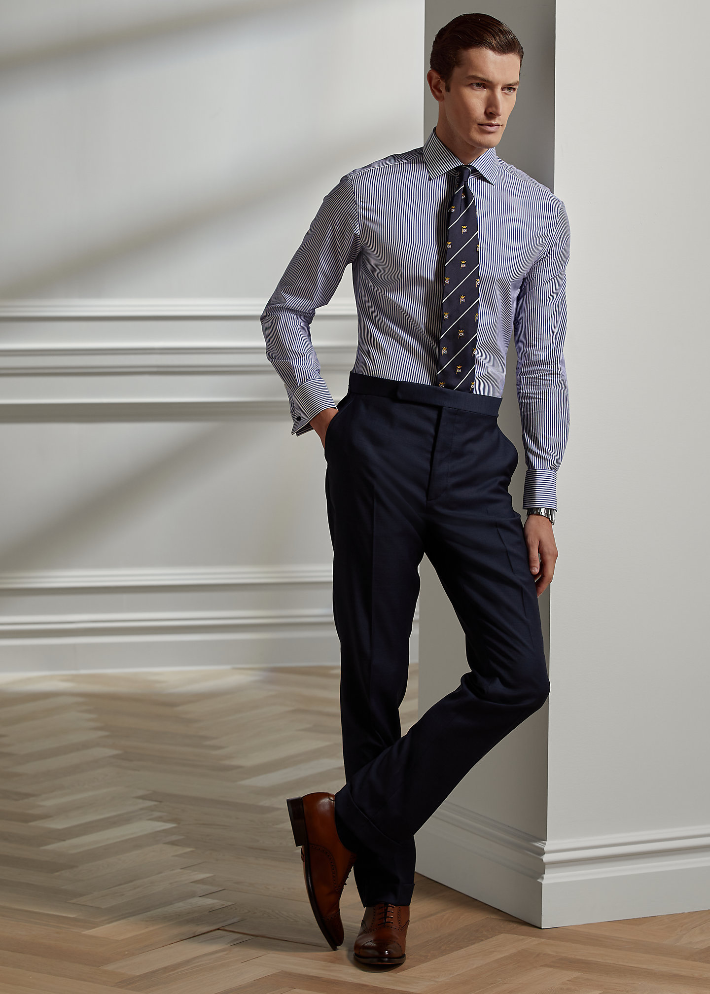 - Split pleated back yoke ensures smooth, contoured shoulders.