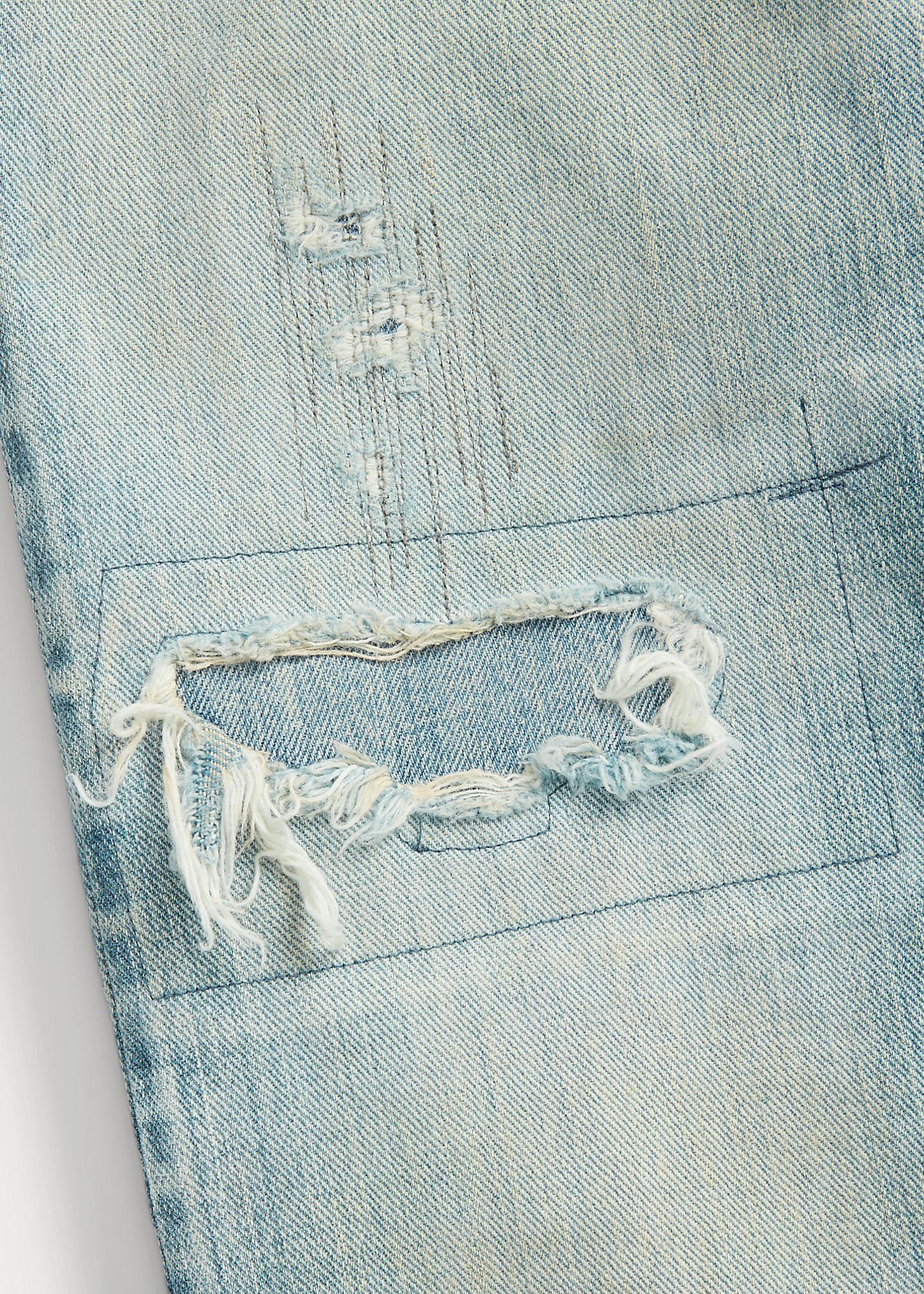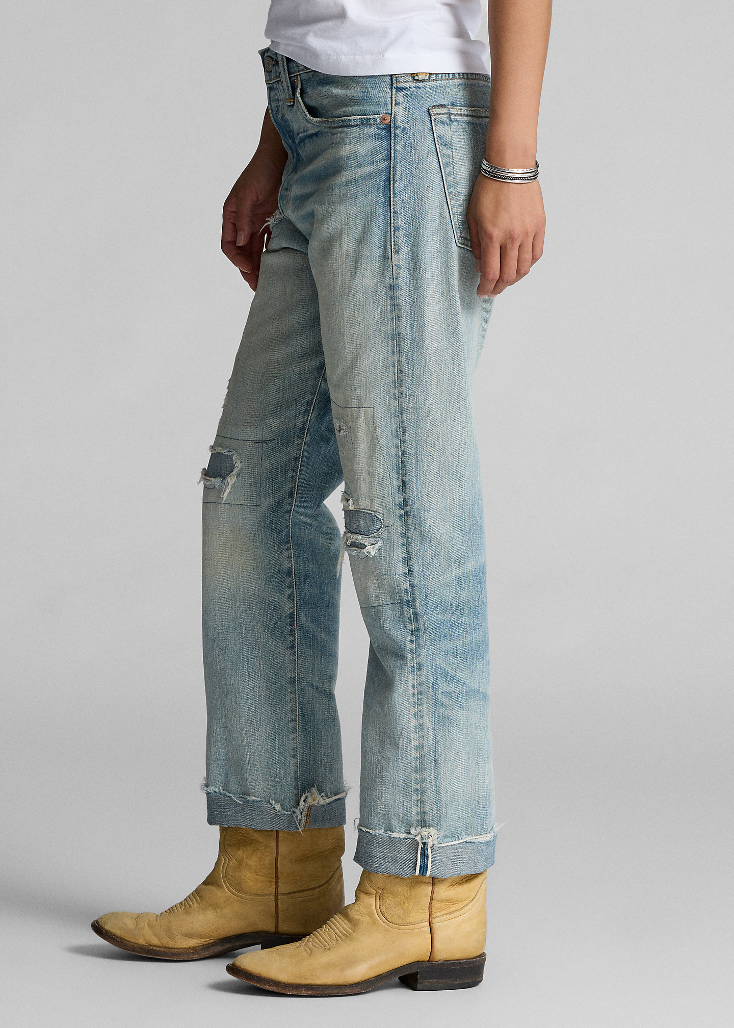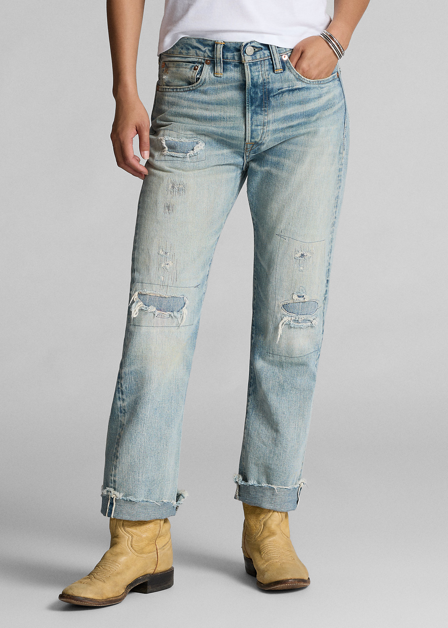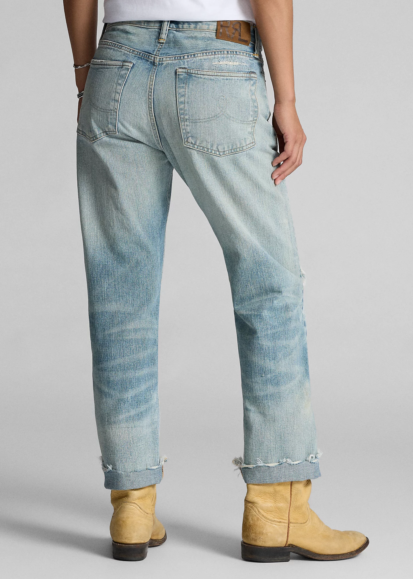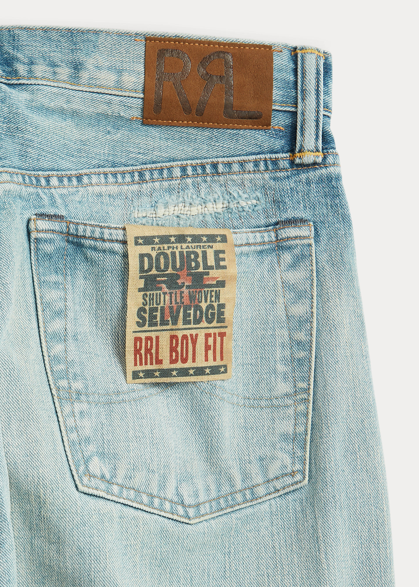 - Belt loops. Button fly with a signature buttoned closure. American-made buttons, copper-tone rivets, and washer burrs. Five-pocket styling. “RRL” embroidery at the coin pocket. “RRL”-debossed logo patch at the back right waist. Raw hems.