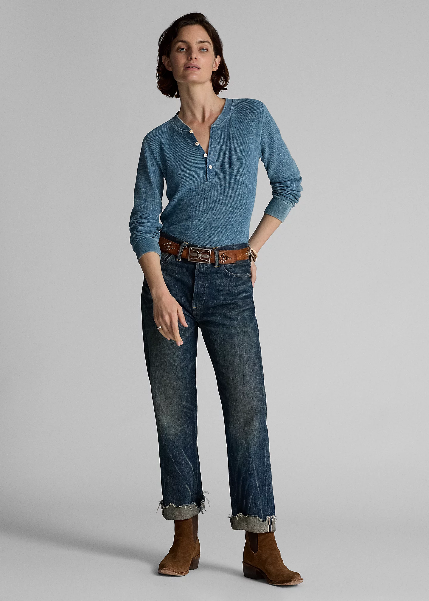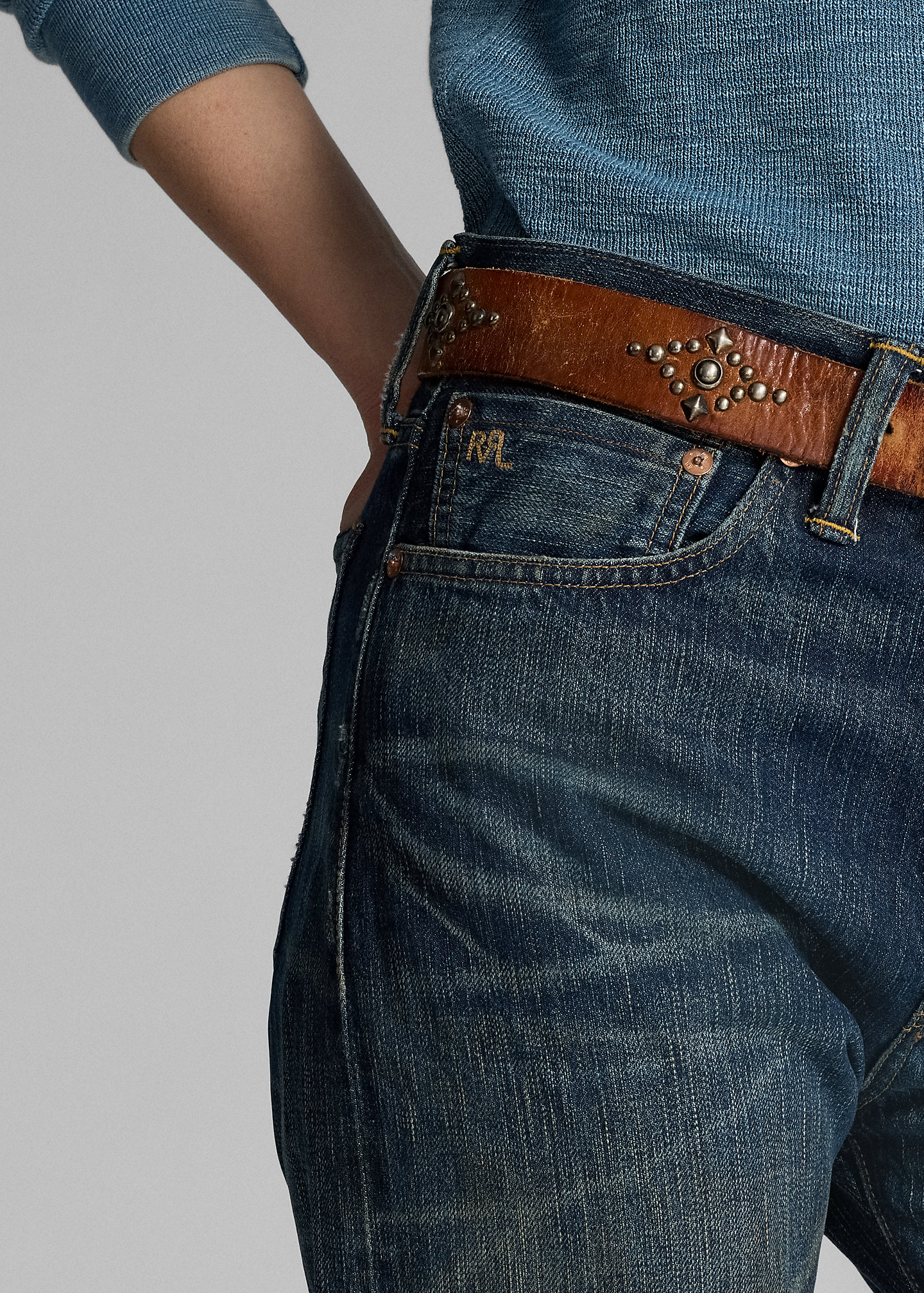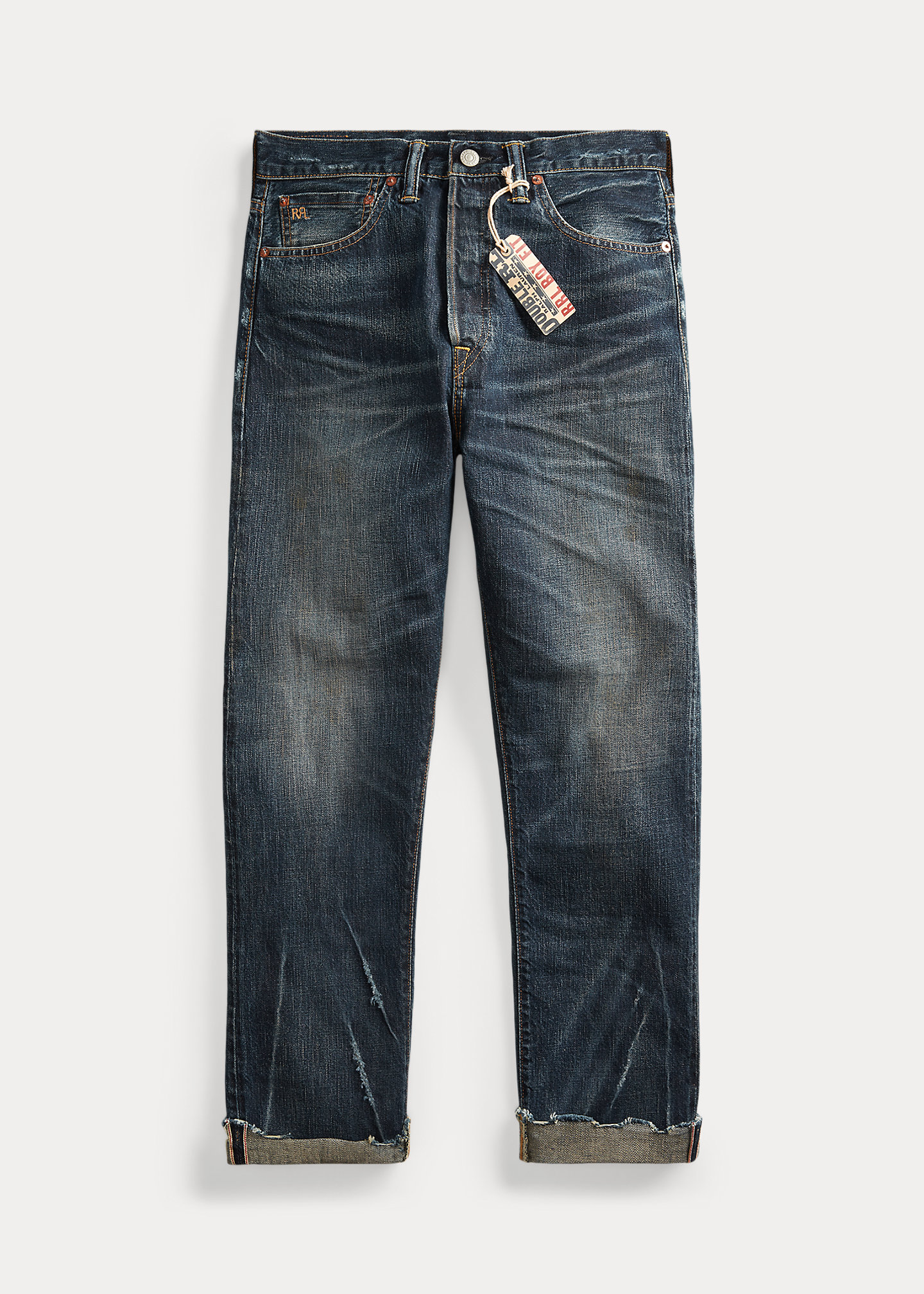 - “RRL”-debossed logo patch at the back right waist.