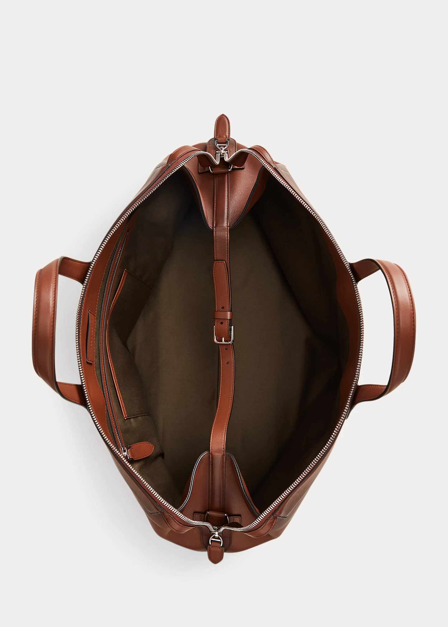 - Two-way extended top zip closure with calfskin zipper pulls and collar-stud keepers.