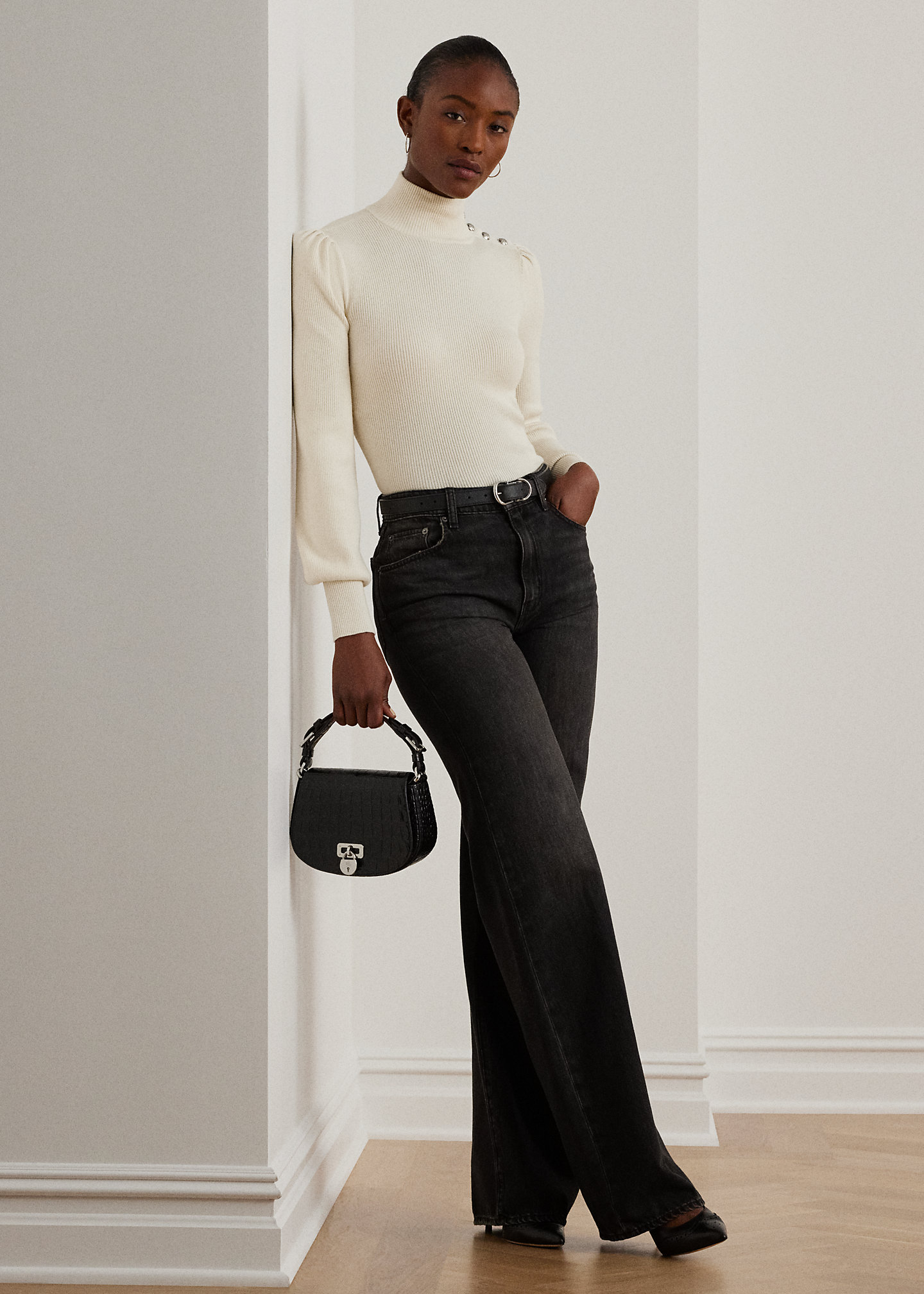 - Mockneck. Buttoned placket at the neck. Signature crest-embossed buttons.