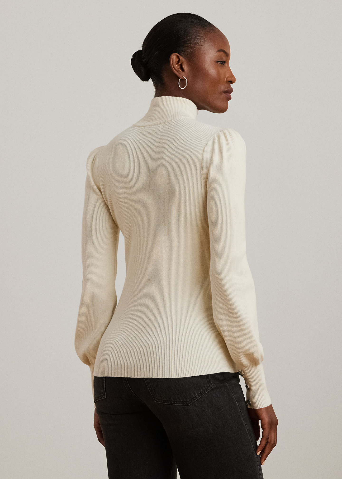 - Puffed long sleeves with buttoned cuffs. Shirring into the cuffs.