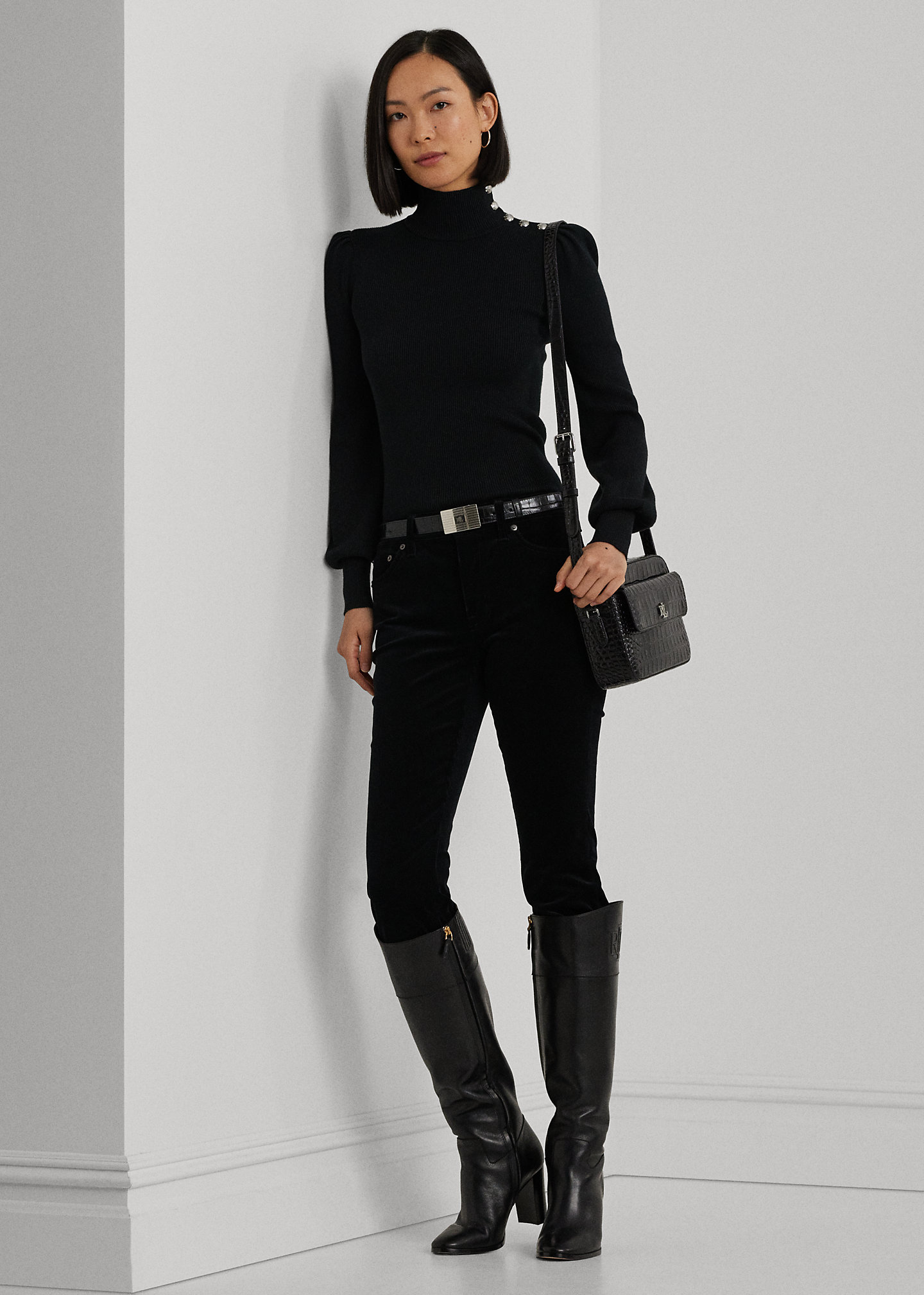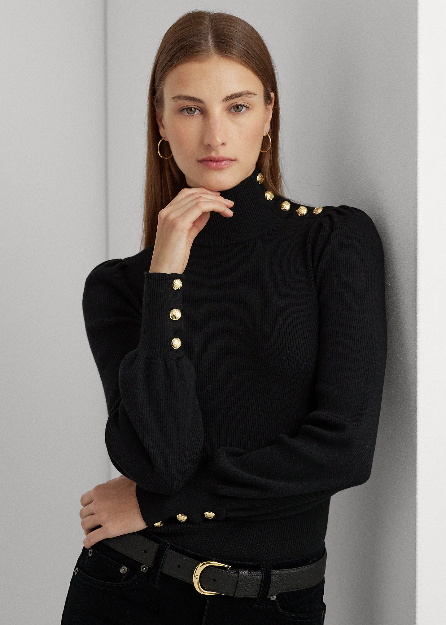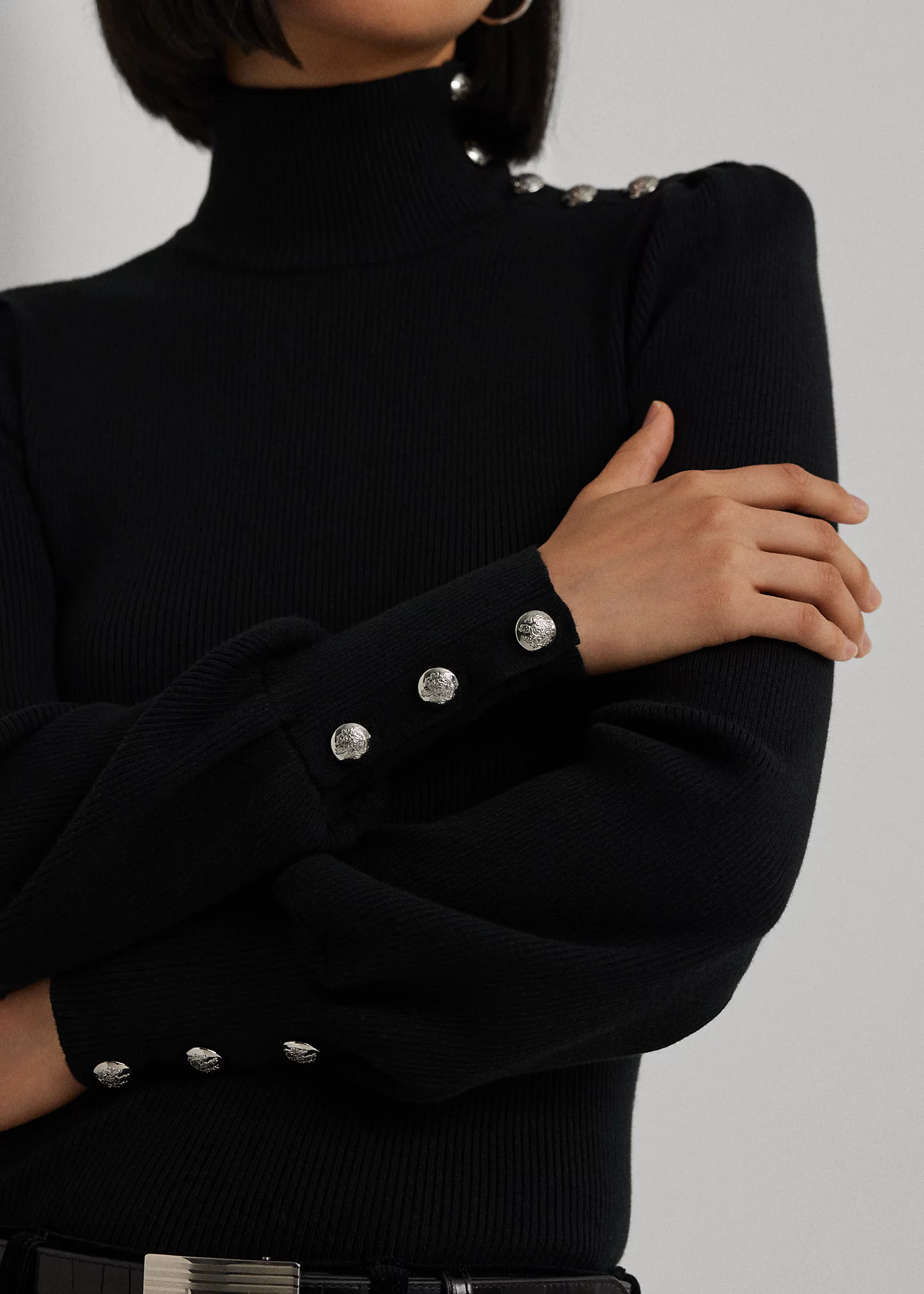 - Mockneck. Buttoned placket at the neck. Signature crest-embossed buttons.