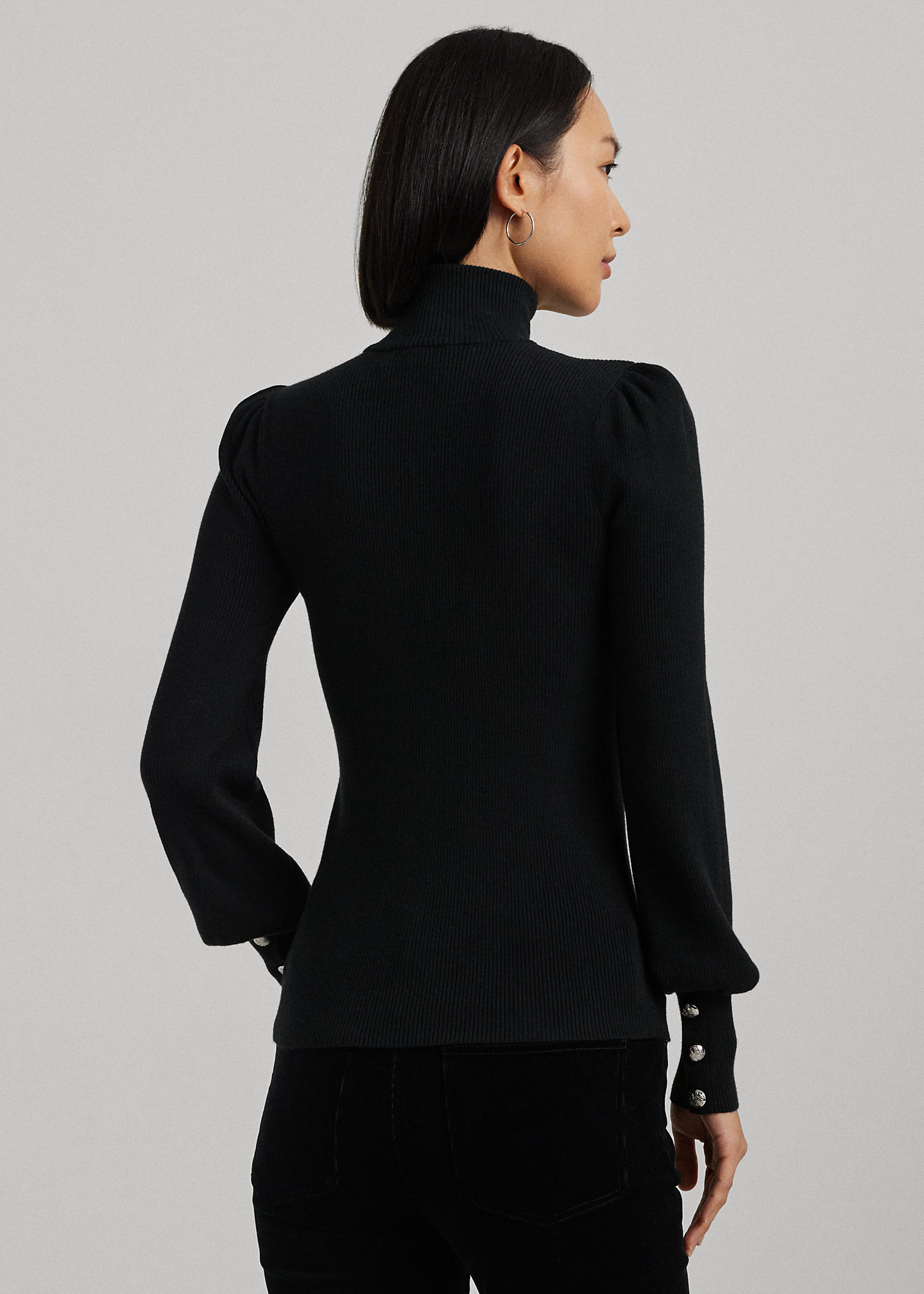 - Puffed long sleeves with buttoned cuffs. Shirring into the cuffs.