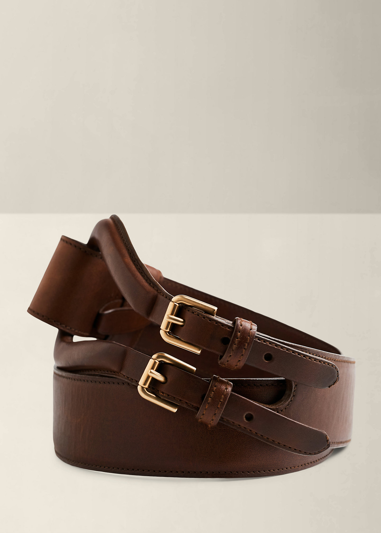 - Two polished gold-tone roller buckles. Two leather keepers.