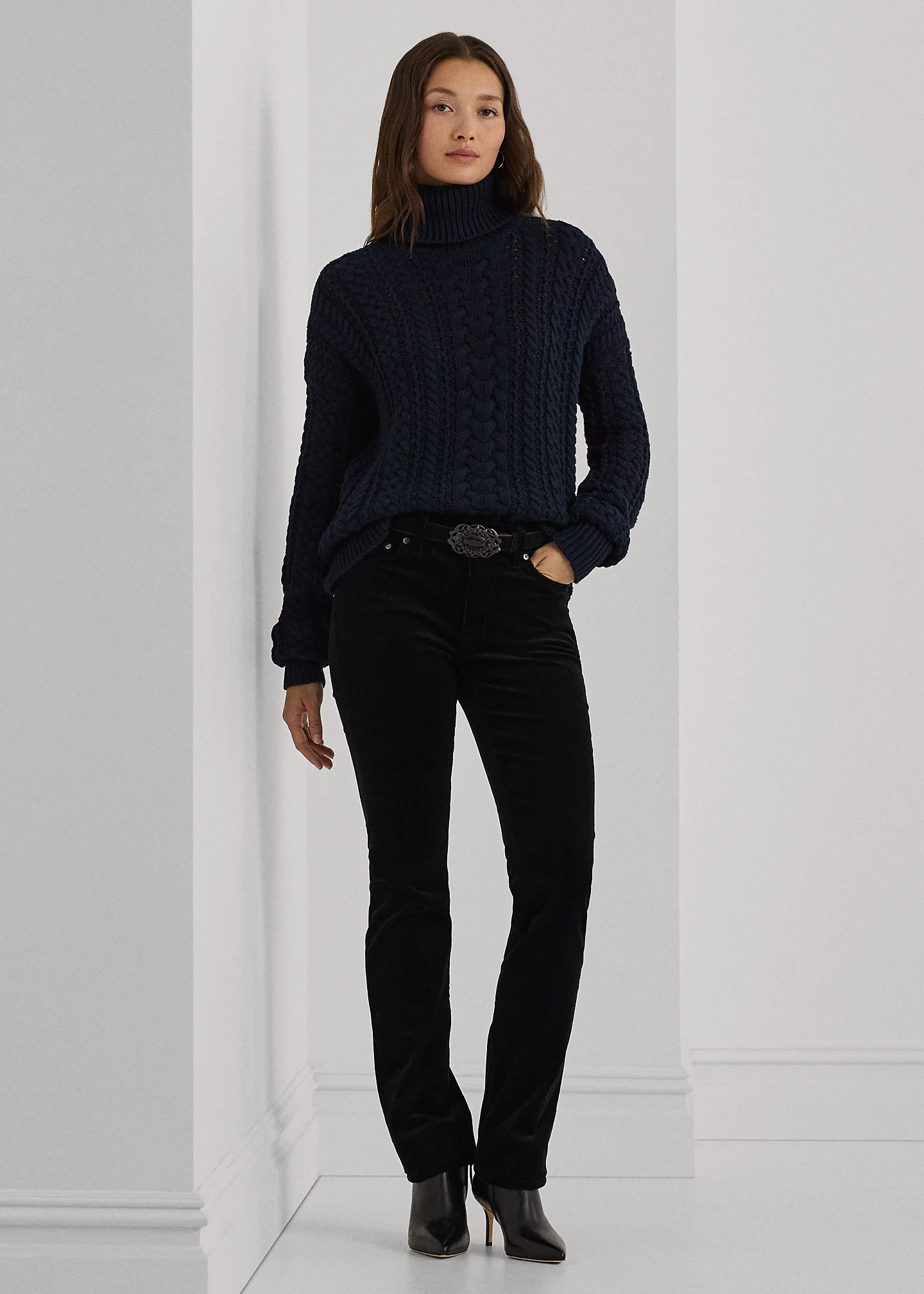 - Ribbed turtleneck.