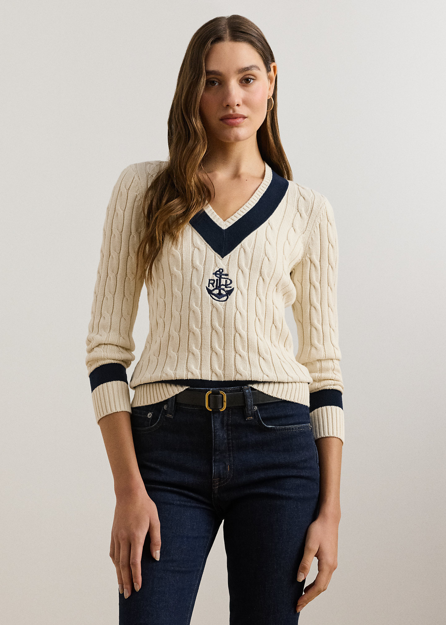 - Long sleeves with ribbed cuffs. “LRL”-embroidered logo with an anchor at the center chest. Ribbed hem.