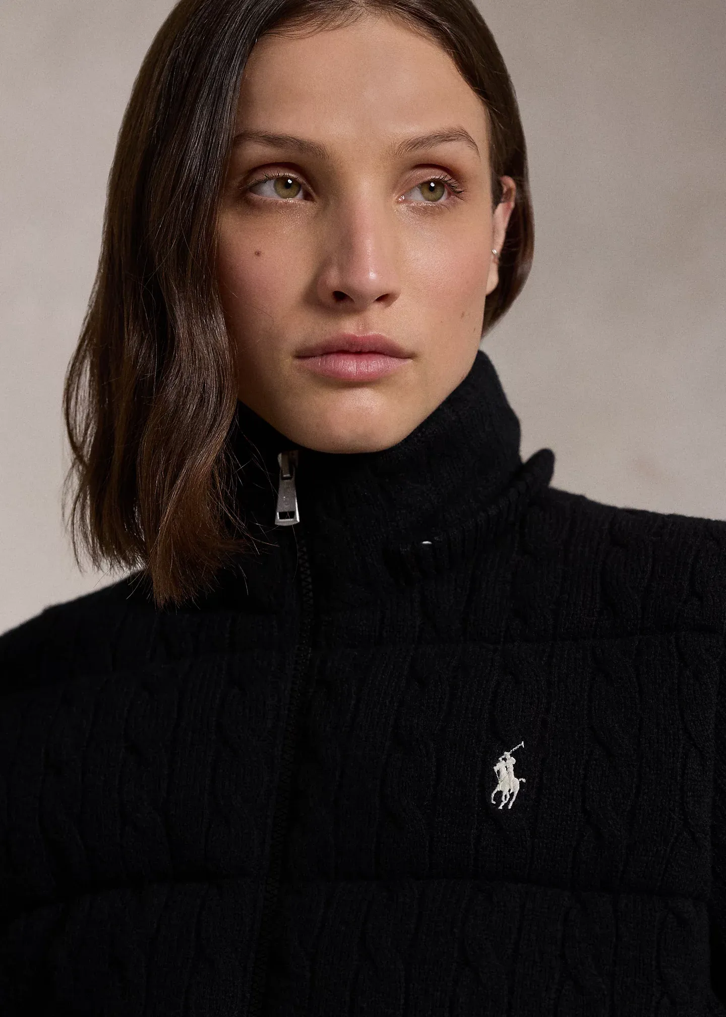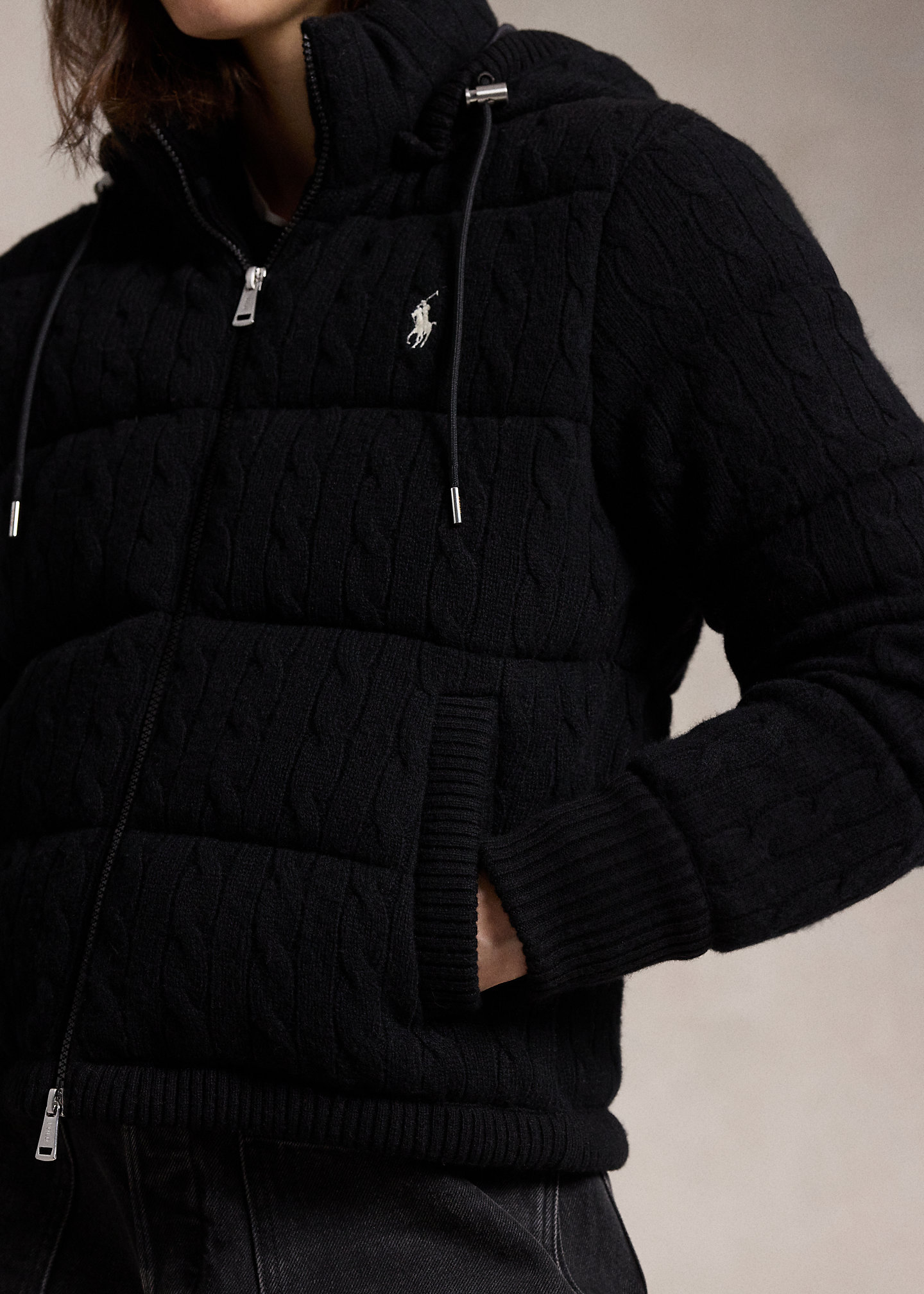 - Mockneck. Snap-off drawcord hood. Full-zip front. Long sleeves with rib-knit cuffs. Two front waist snapped pockets. Fully lined and filled. Signature embroidered Pony at the left chest.