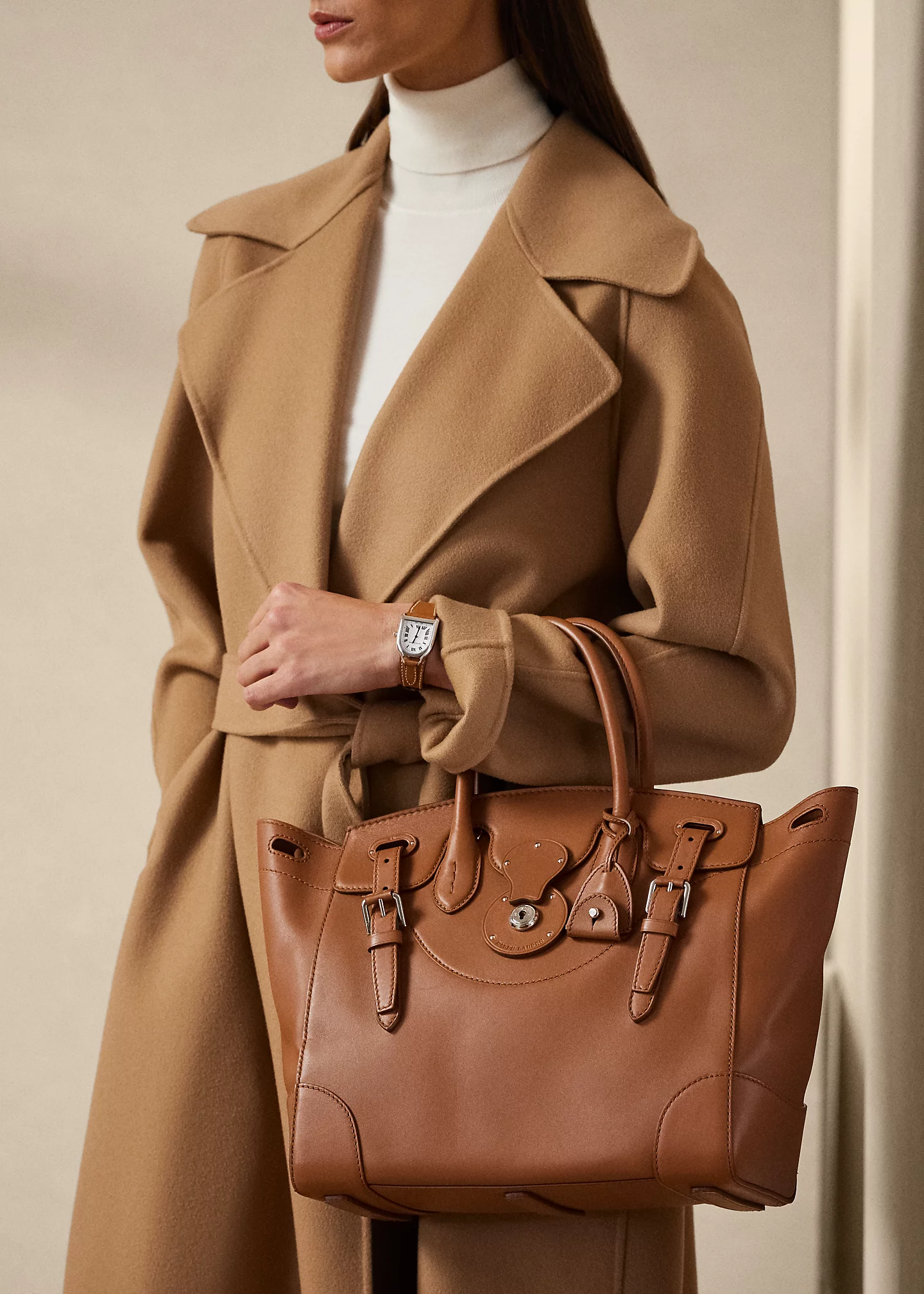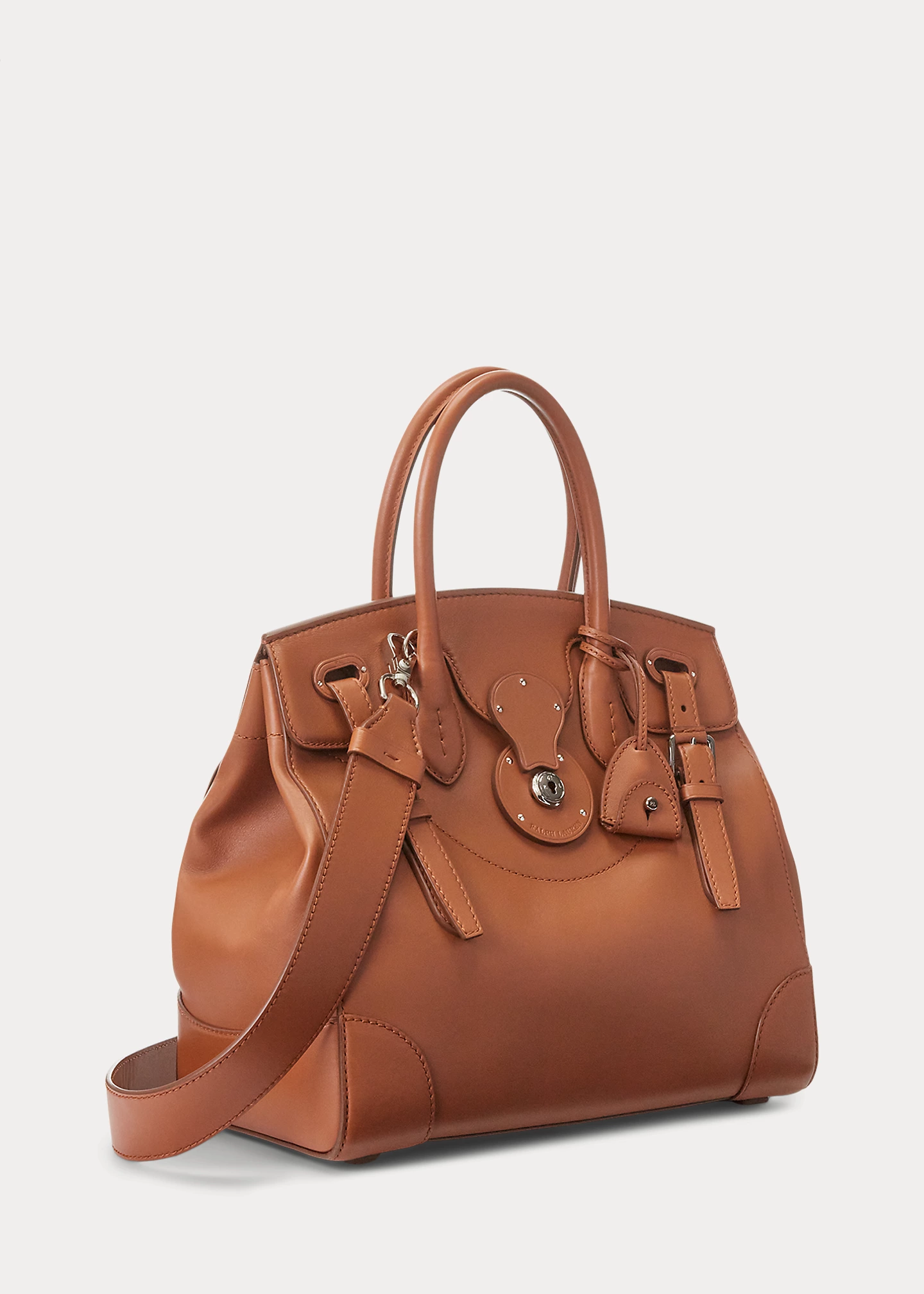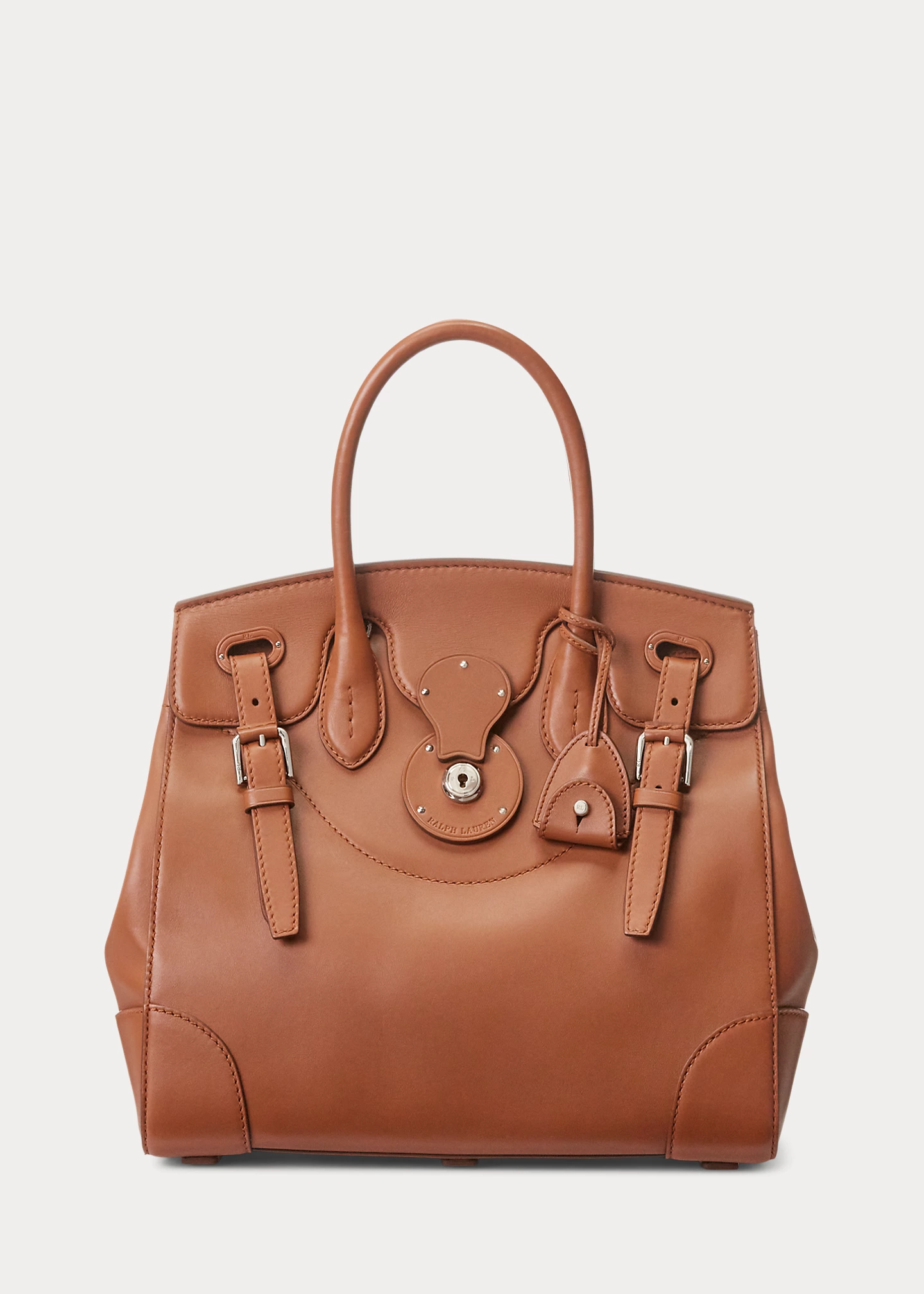 - Front flap secures with a calfskin-covered Ricky lock debossed with “Ralph Lauren.” Two calfskin straps loop through the front and secure with palladium-plated roller buckles. Two attached keys in a removable calfskin key bell.