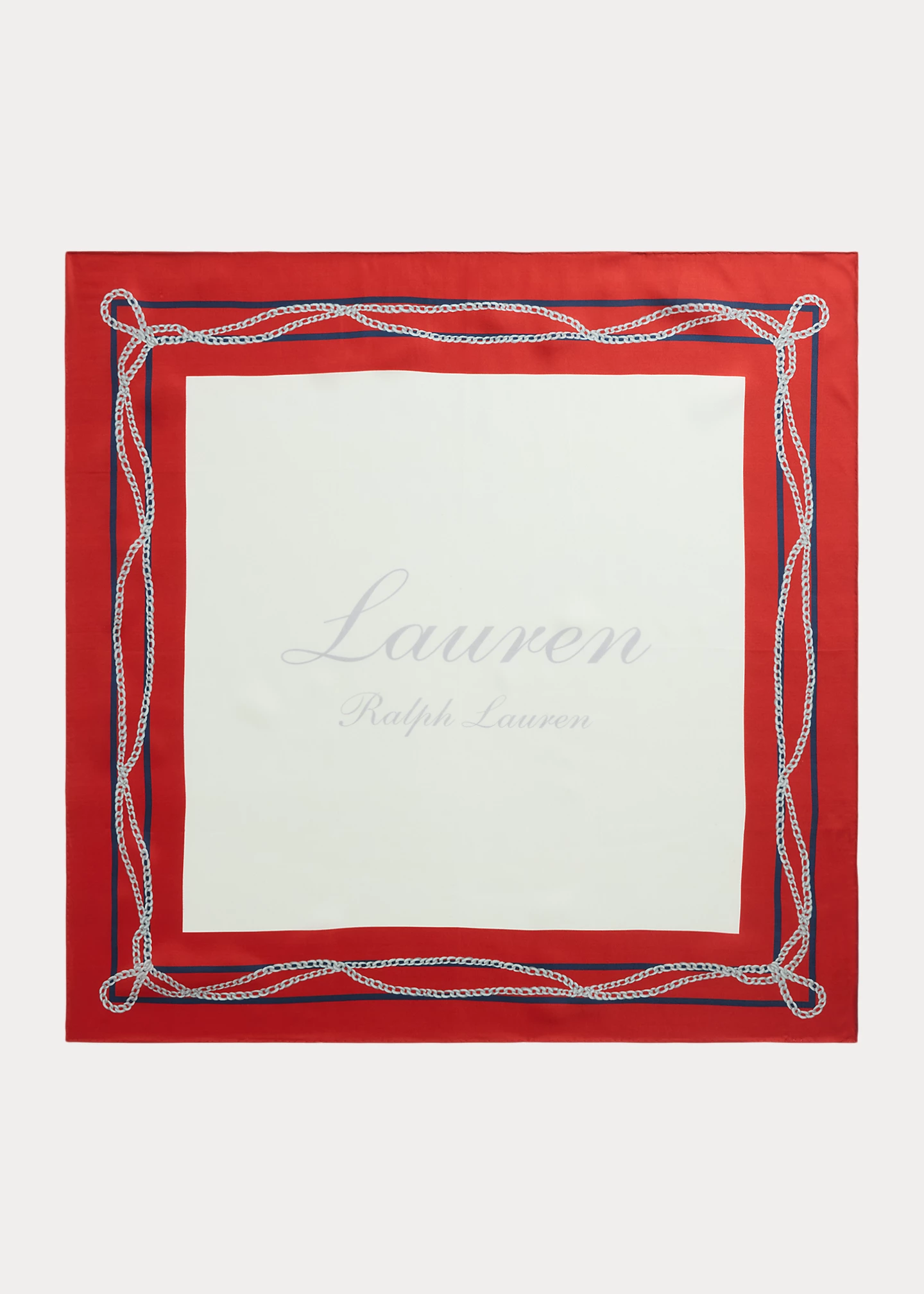 - Oversize, script “Lauren Ralph Lauren” printed at the center.