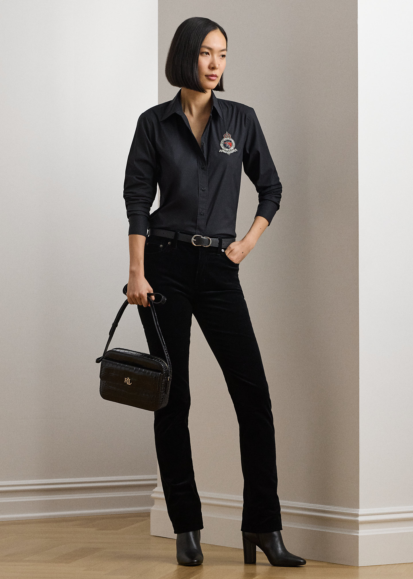 - Long sleeves with buttoned barrel cuffs. “Lauren Ralph Lauren”–engraved buttons. “LRL LXVII LRL Ralph Lauren est. 1967 Lauren RL” beaded crest at the left chest. Shirttail hem.