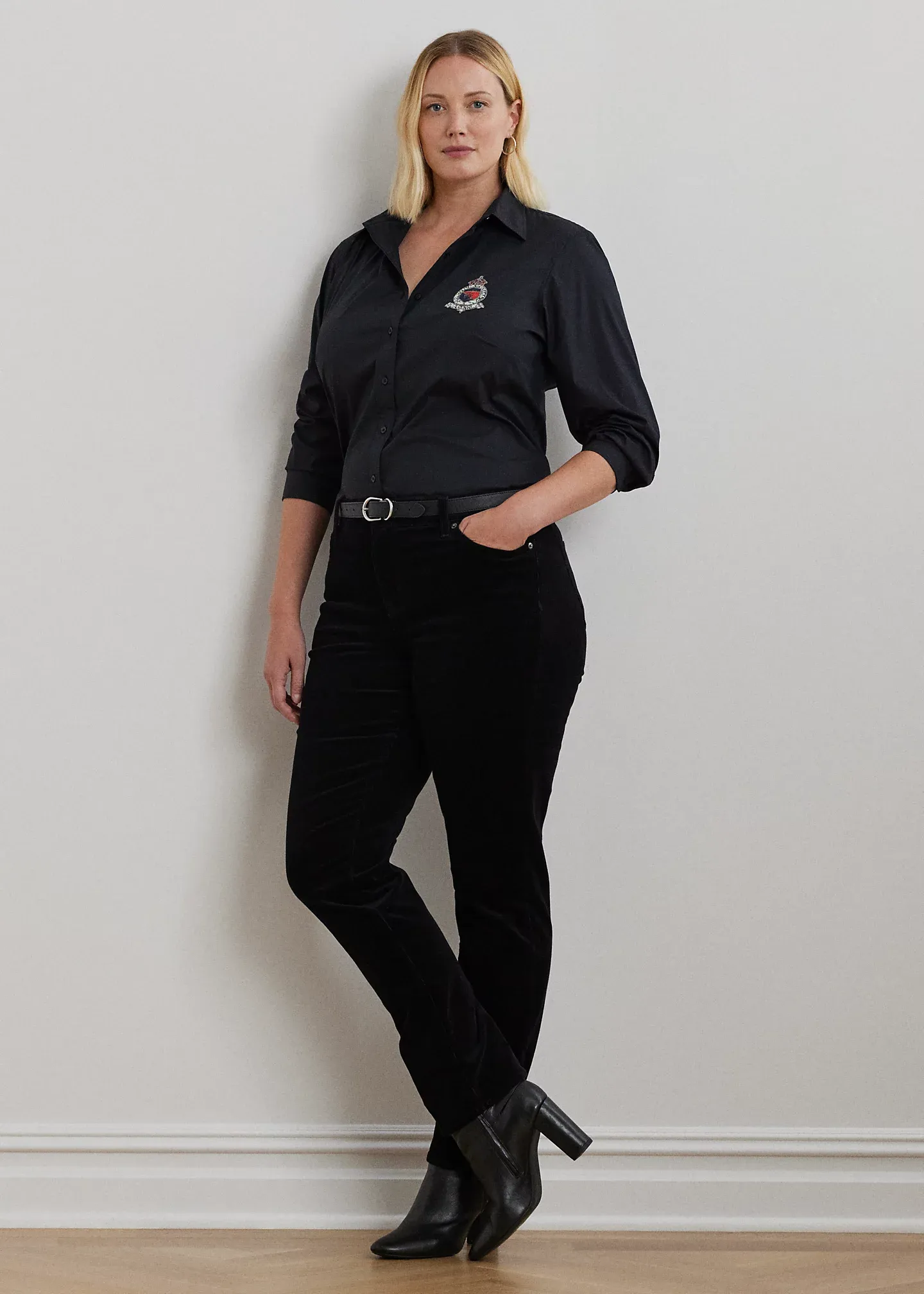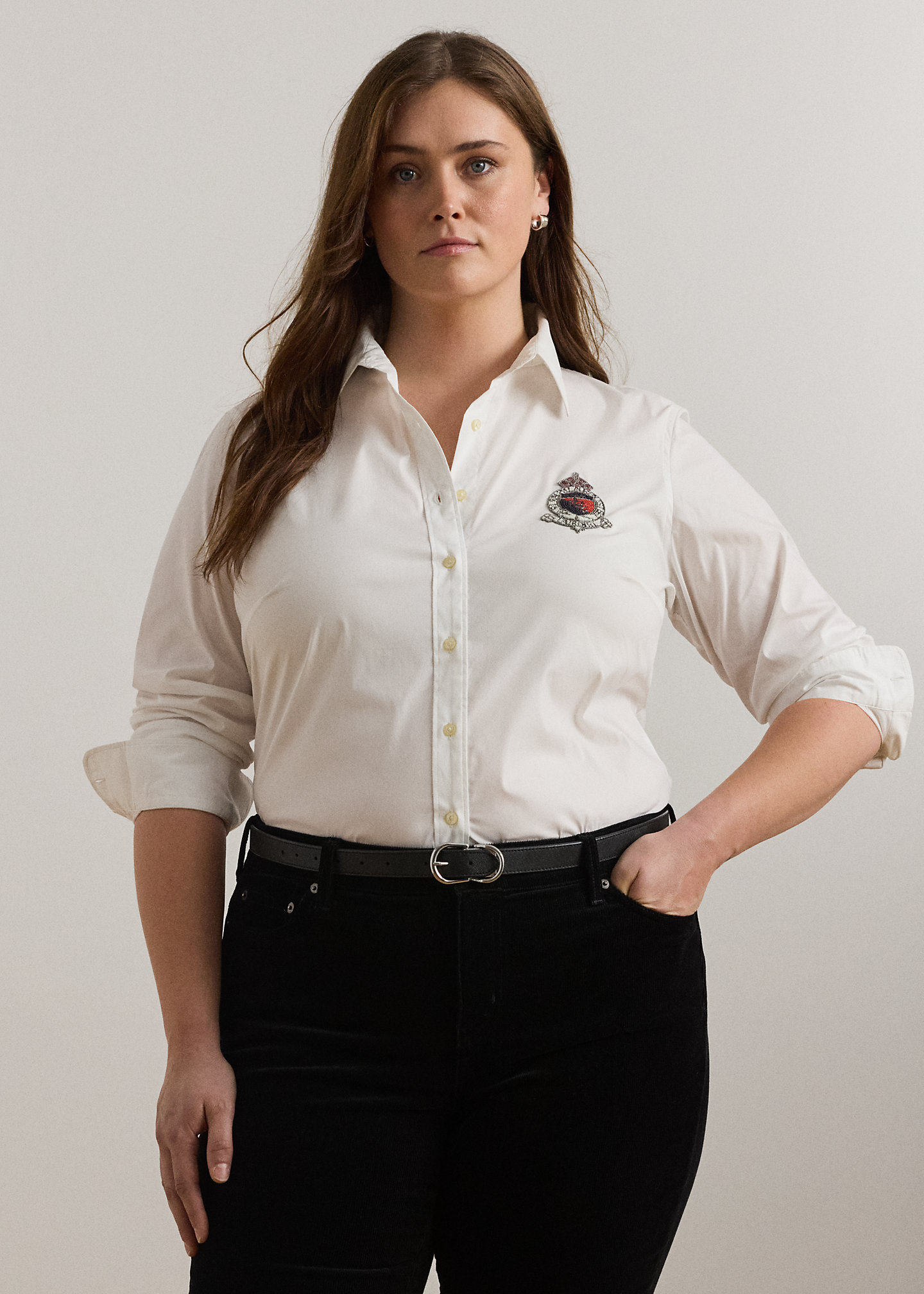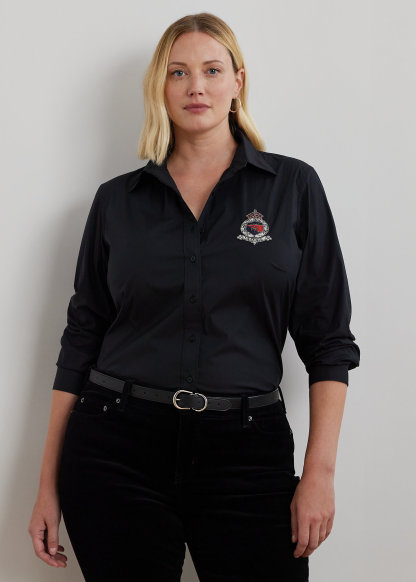 - Long sleeves with buttoned barrel cuffs. “Lauren Ralph Lauren”–engraved buttons. “LRL LXVII LRL Ralph Lauren est. 1967 Lauren RL” beaded crest at the left chest. Shirttail hem.