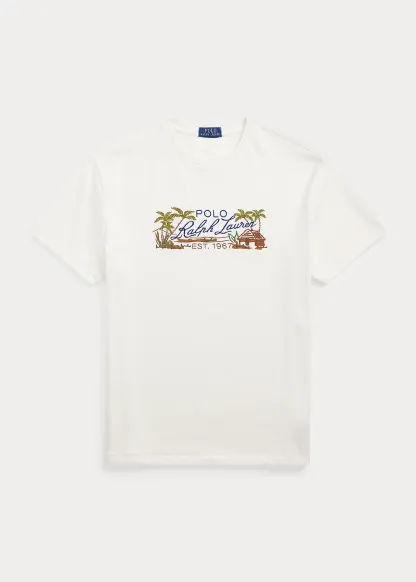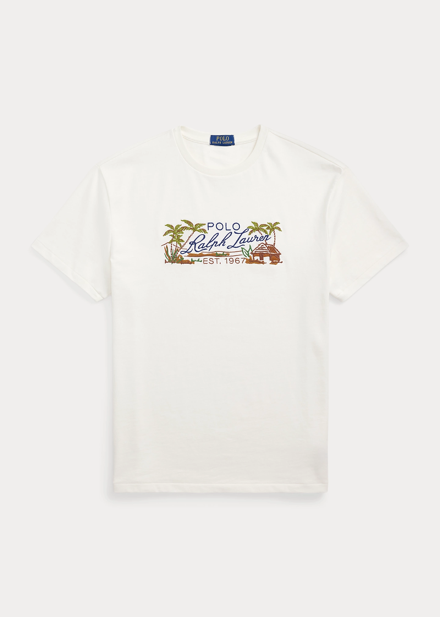 - “Polo Ralph Lauren Est. 1967” and a tropical graphic embroidered at the center front.