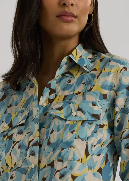 - Long sleeves with buttoned barrel cuffs. Two chest box-pleated buttoned-flap patch pockets. “Lauren Ralph Lauren”–engraved buttons. Box-pleated back yoke. Shirttail hem.