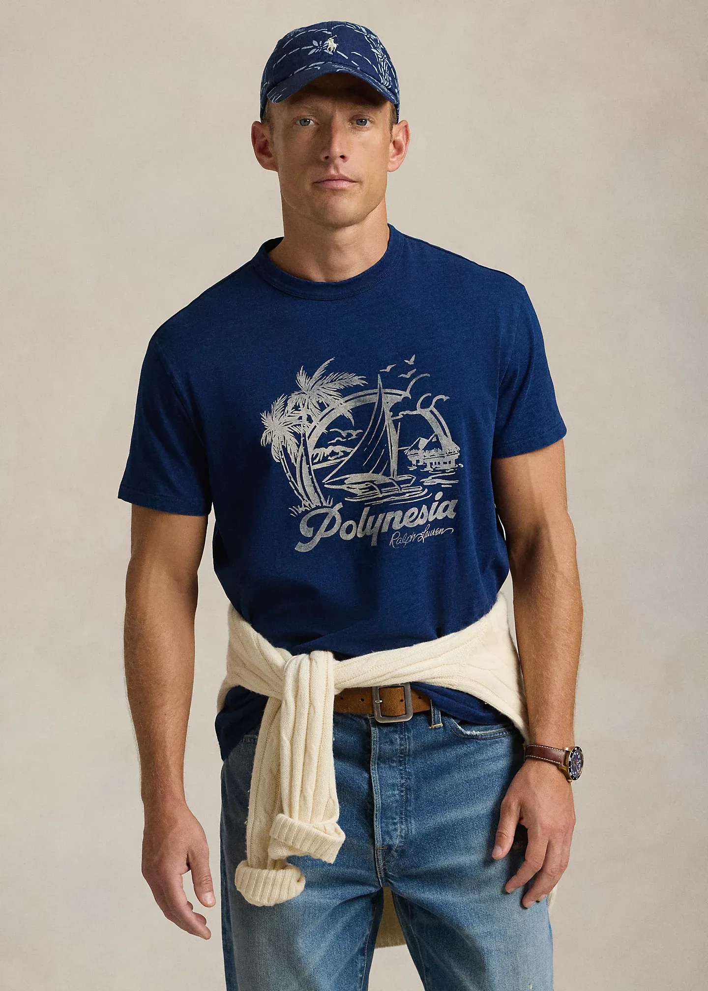 - Tropical sailing graphic and "Polynesia Ralph Lauren" printed at the center front.