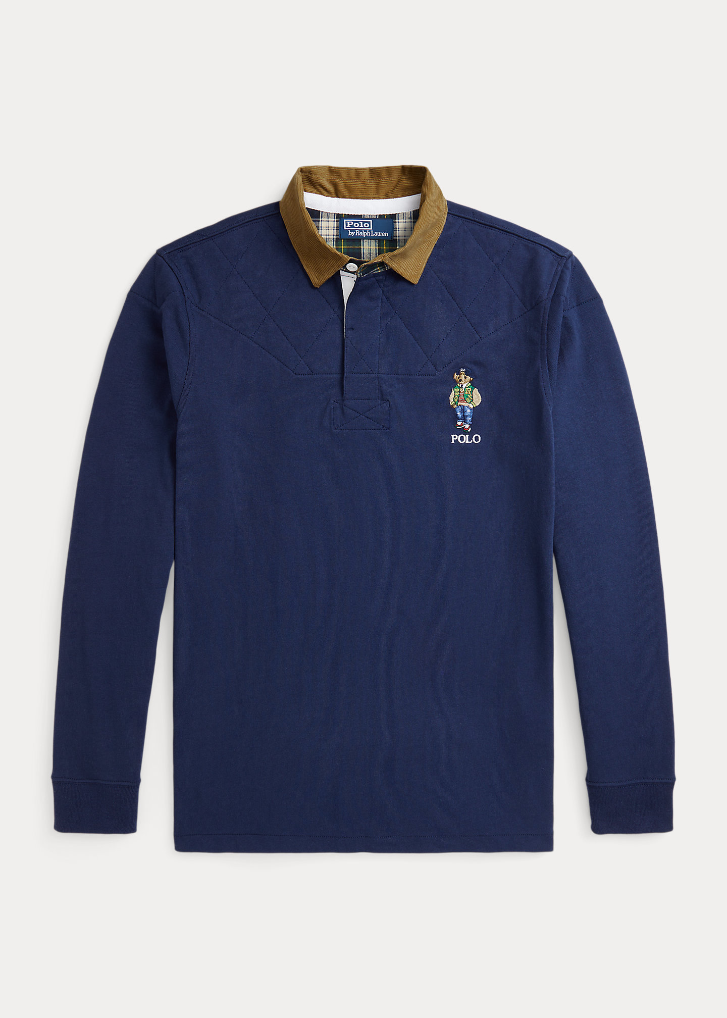 - Corduroy rugby collar. Plaid oxford undercollar and half-moon lining. Three-button placket. Rubber buttons.