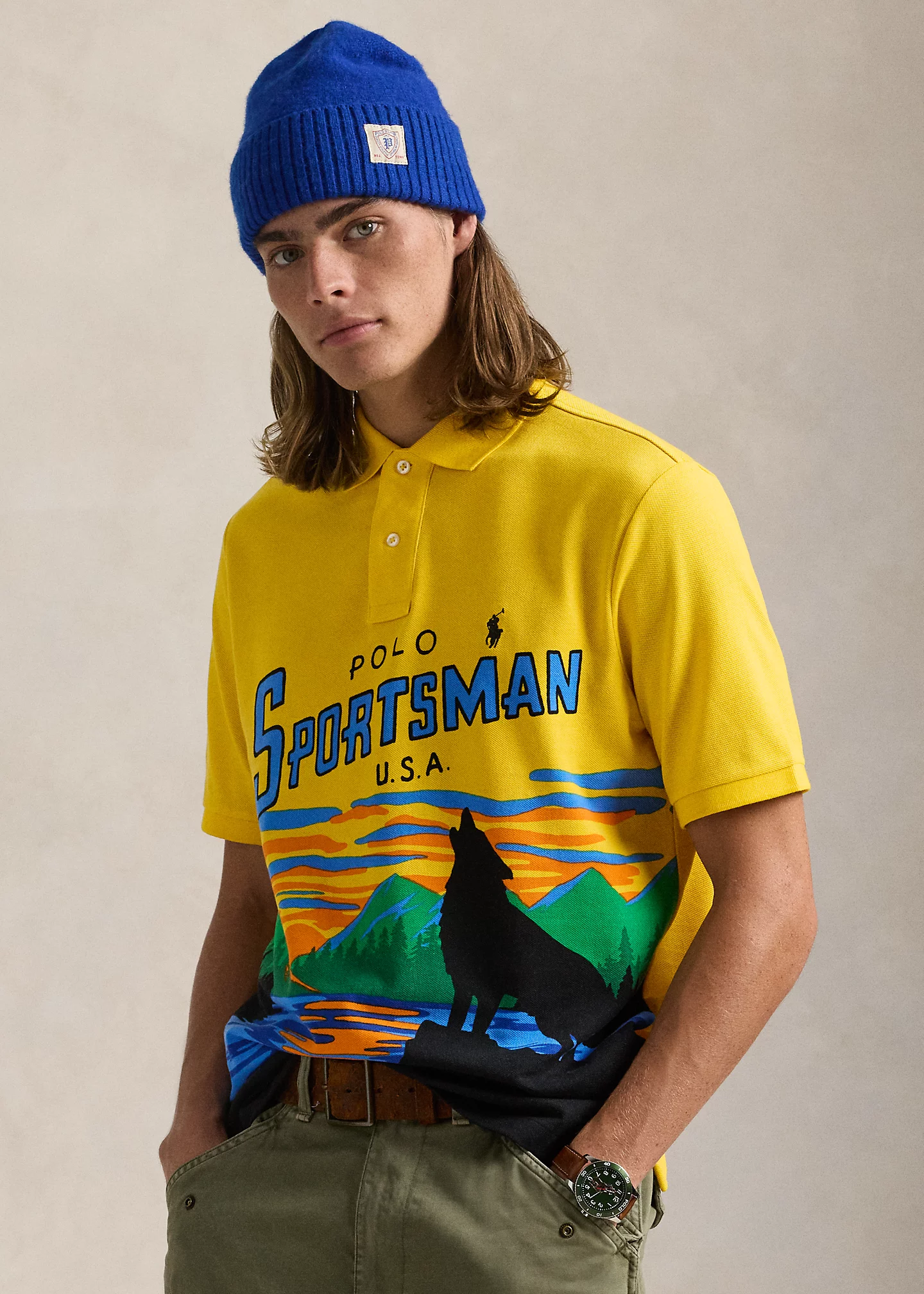 - Short sleeves with ribbed armbands. “Polo Sportsman U.S.A.” and a wolf graphic printed at the front. Even vented hem.