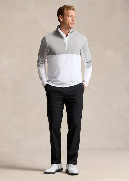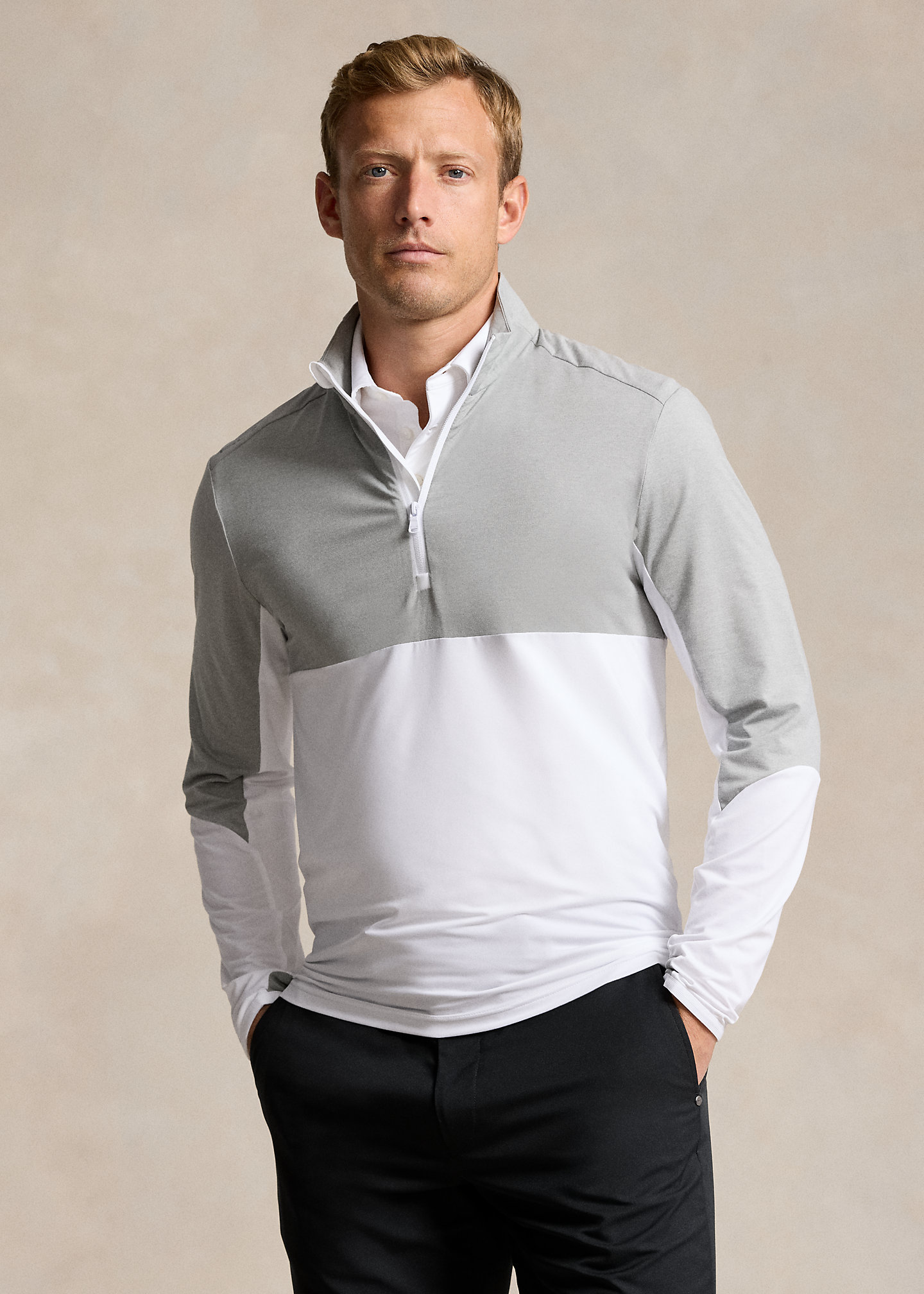 - Mockneck. Quarter-zip placket with a flap at the top that prevents chafing.