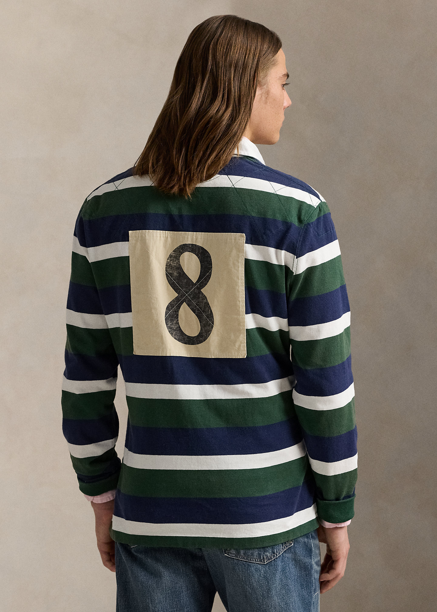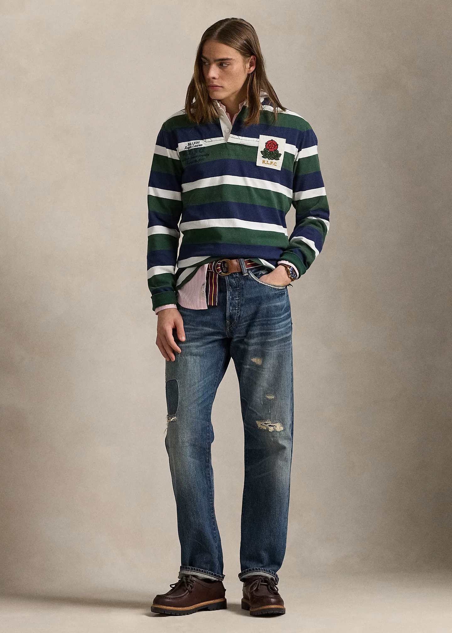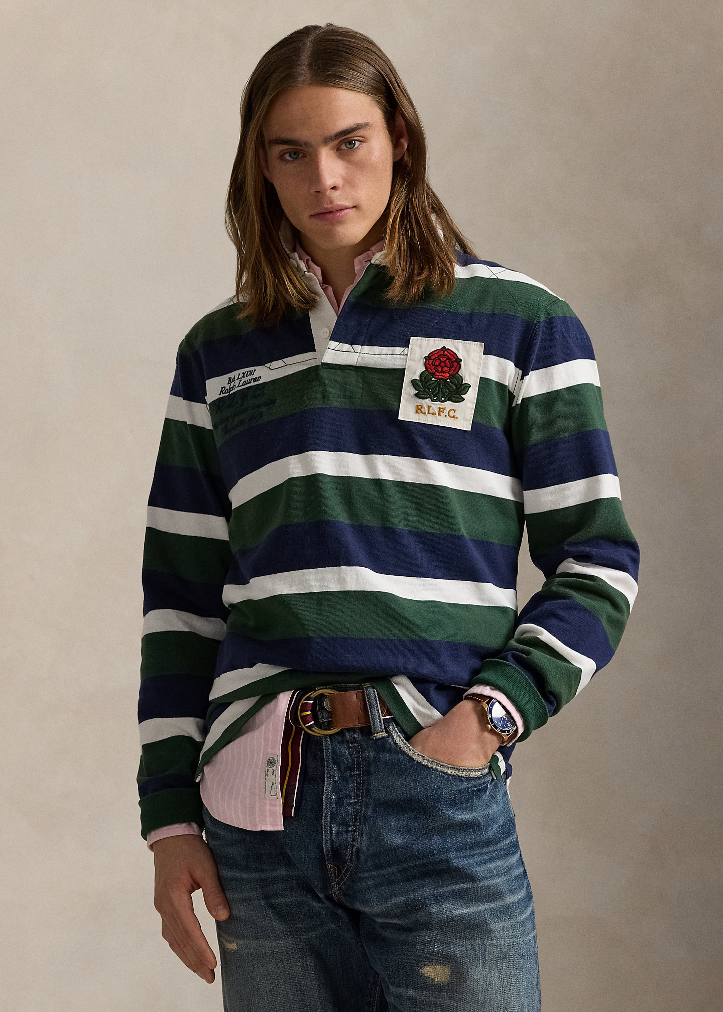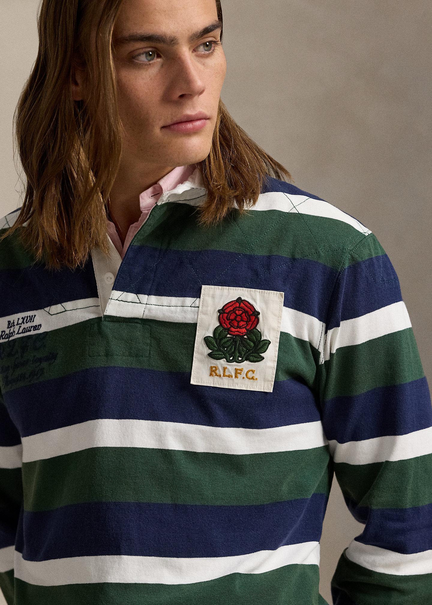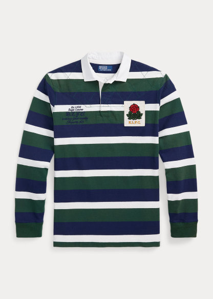- “Est. LXVII Ralph Lauren R.L.F.C. tradition honor loyalty August 24, 1915.” embroidered at the right chest. “R.L.F.C.” rose patch at the left chest. “8” patch at the center back. Vented Hem.