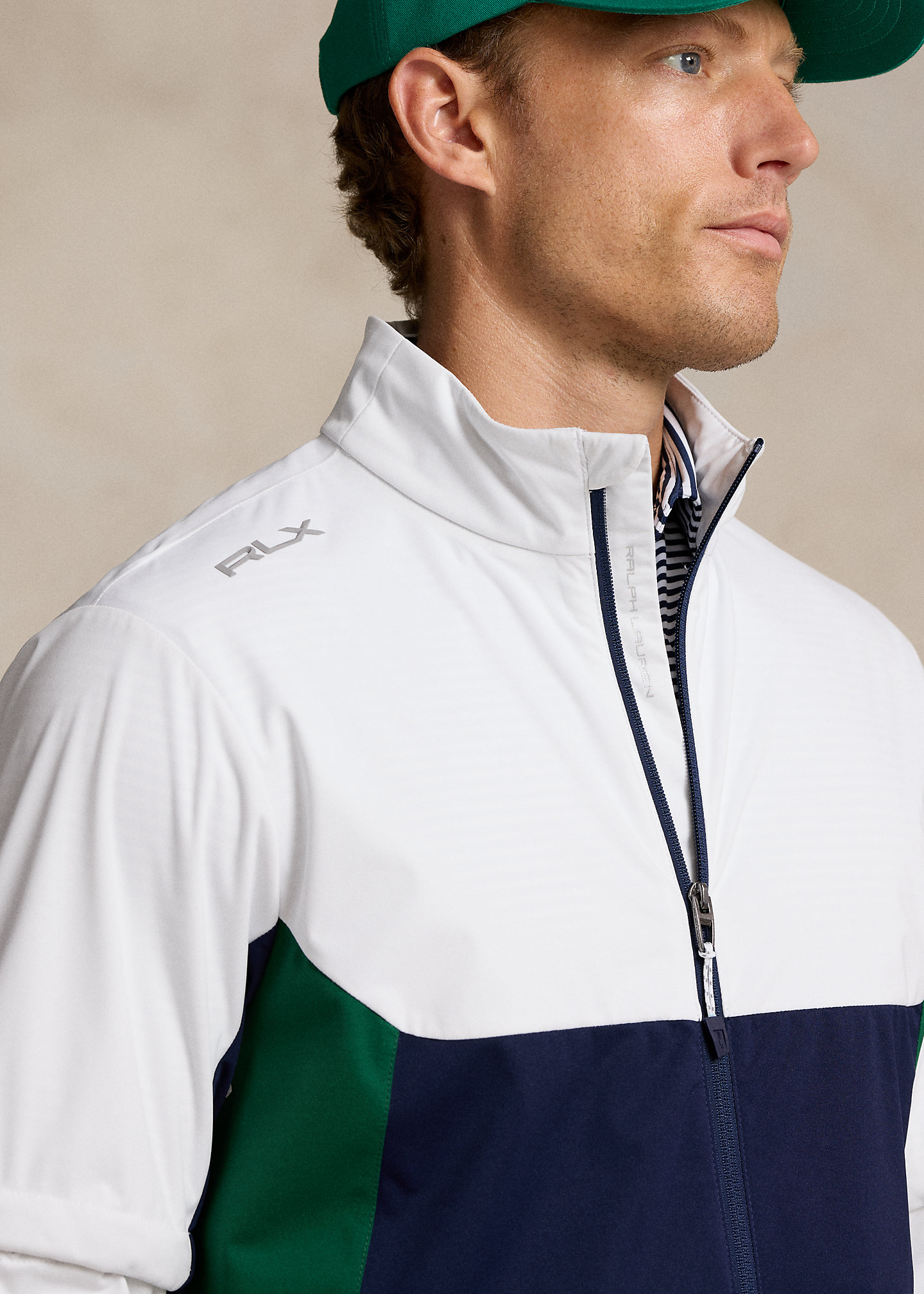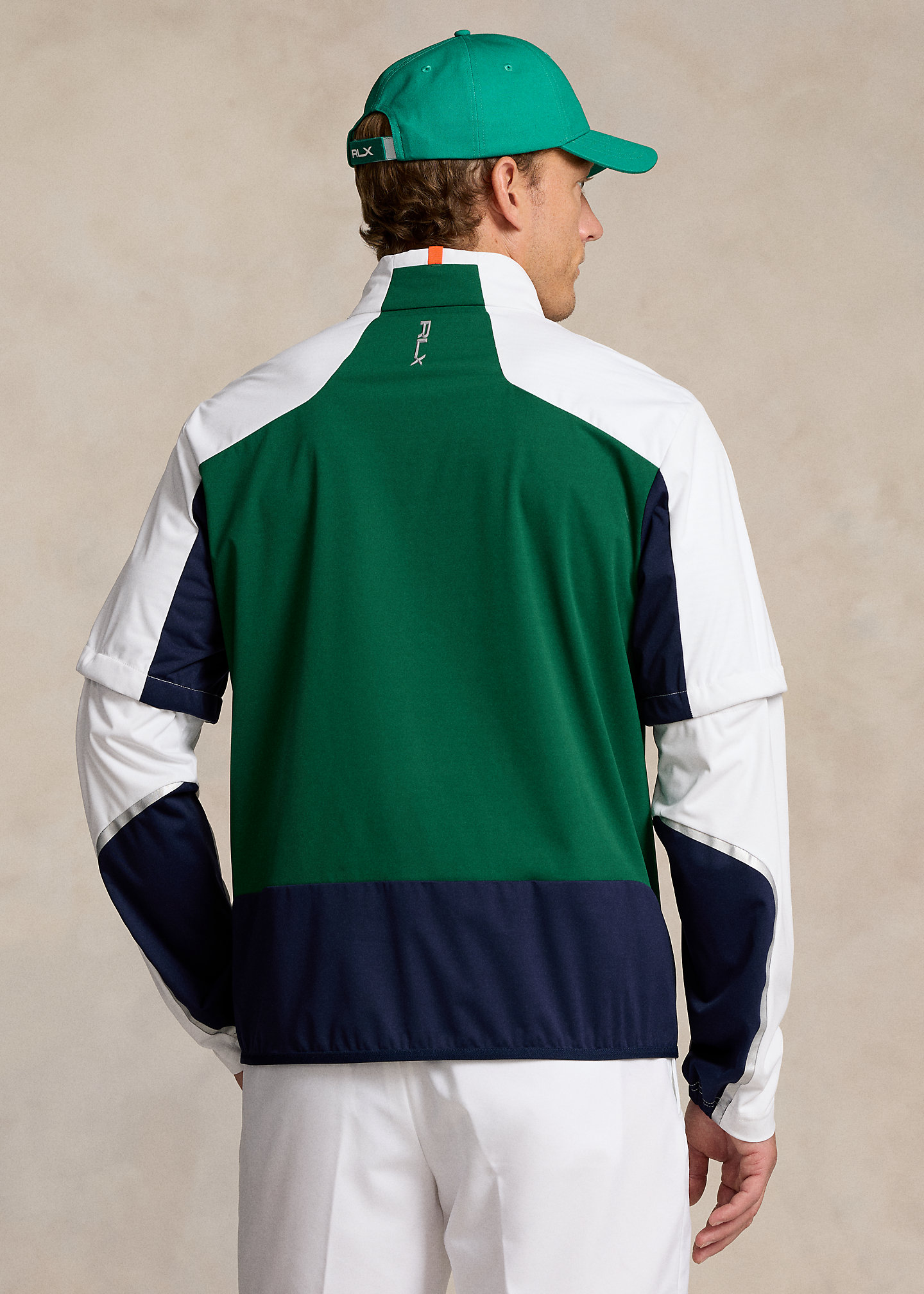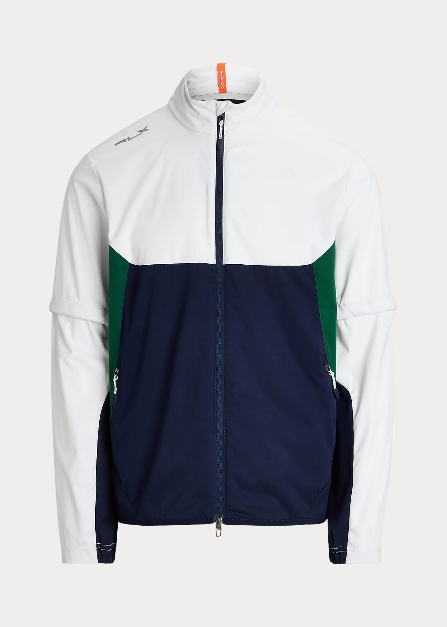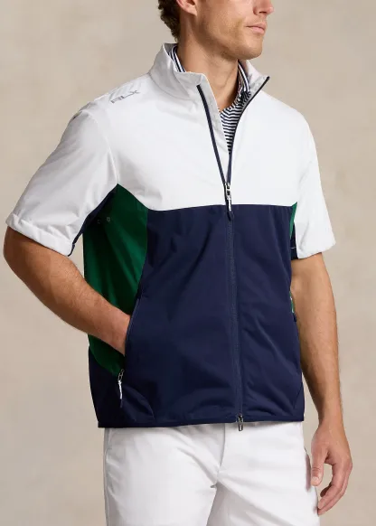 - "RLX" logo at the right shoulder and center back of the neck. "Packable" and "RLX" printed at the packable bag.