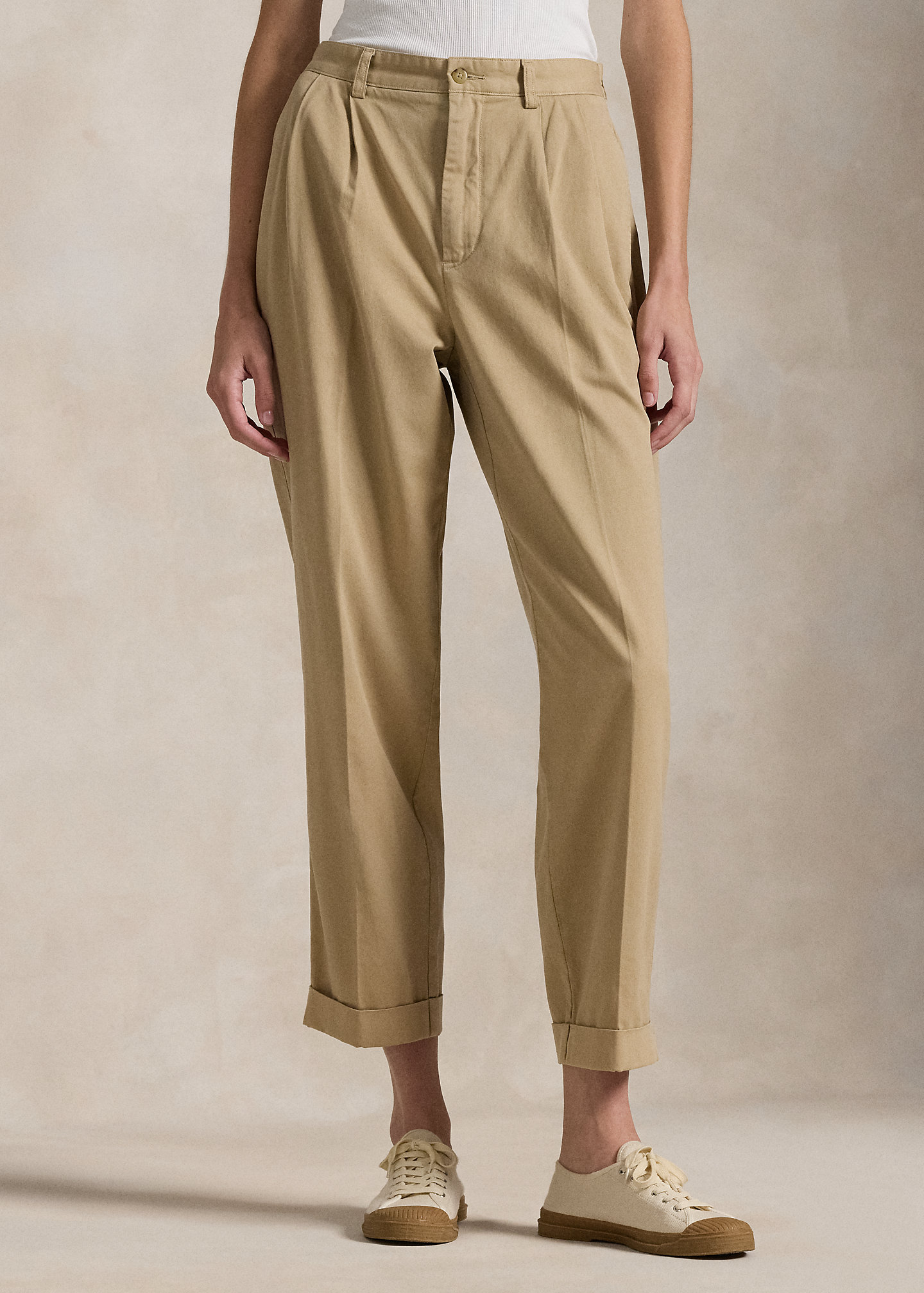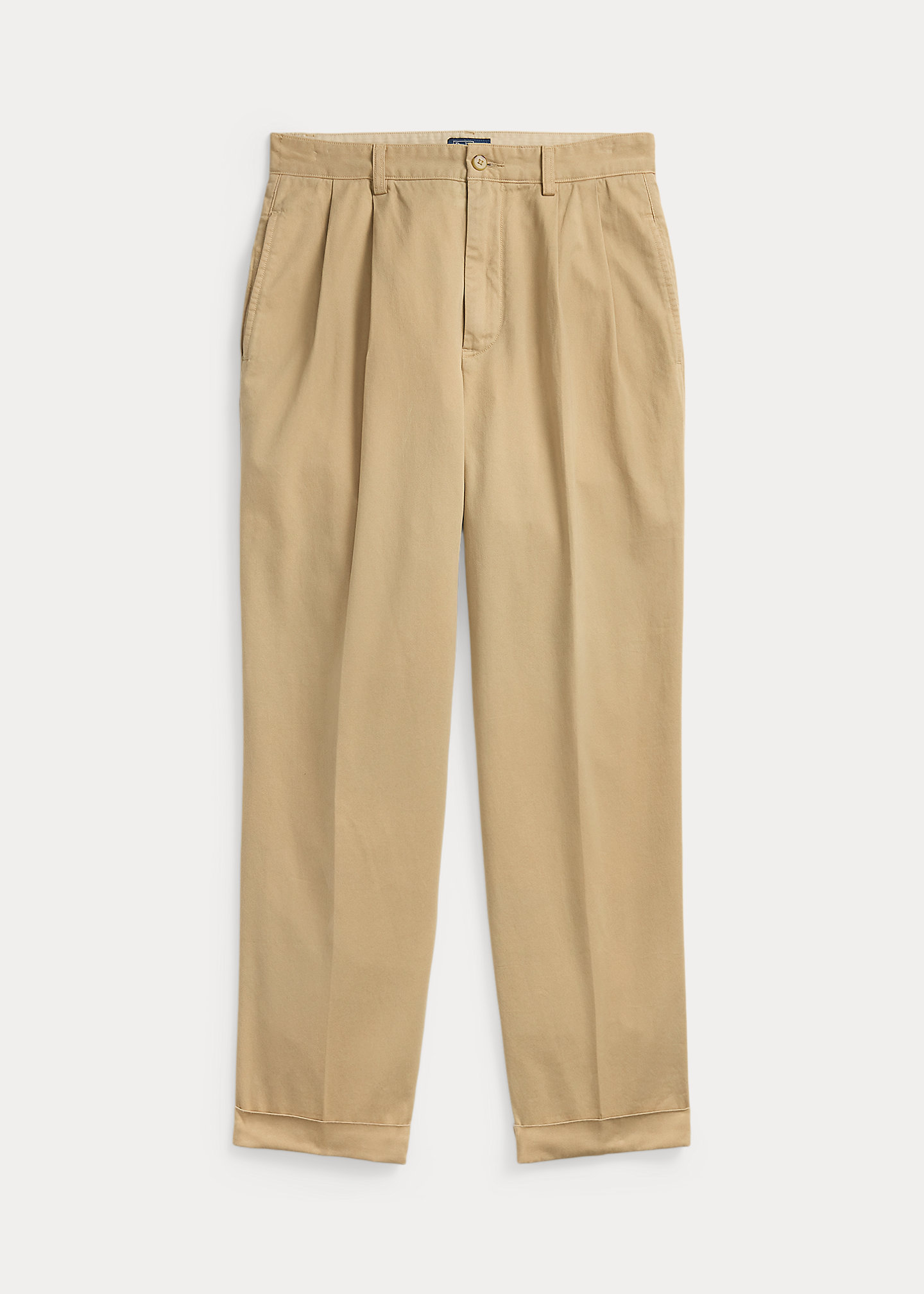 - Pleated front waist. Creases along the front and back waist. Back waist darts. Folded cuffs.