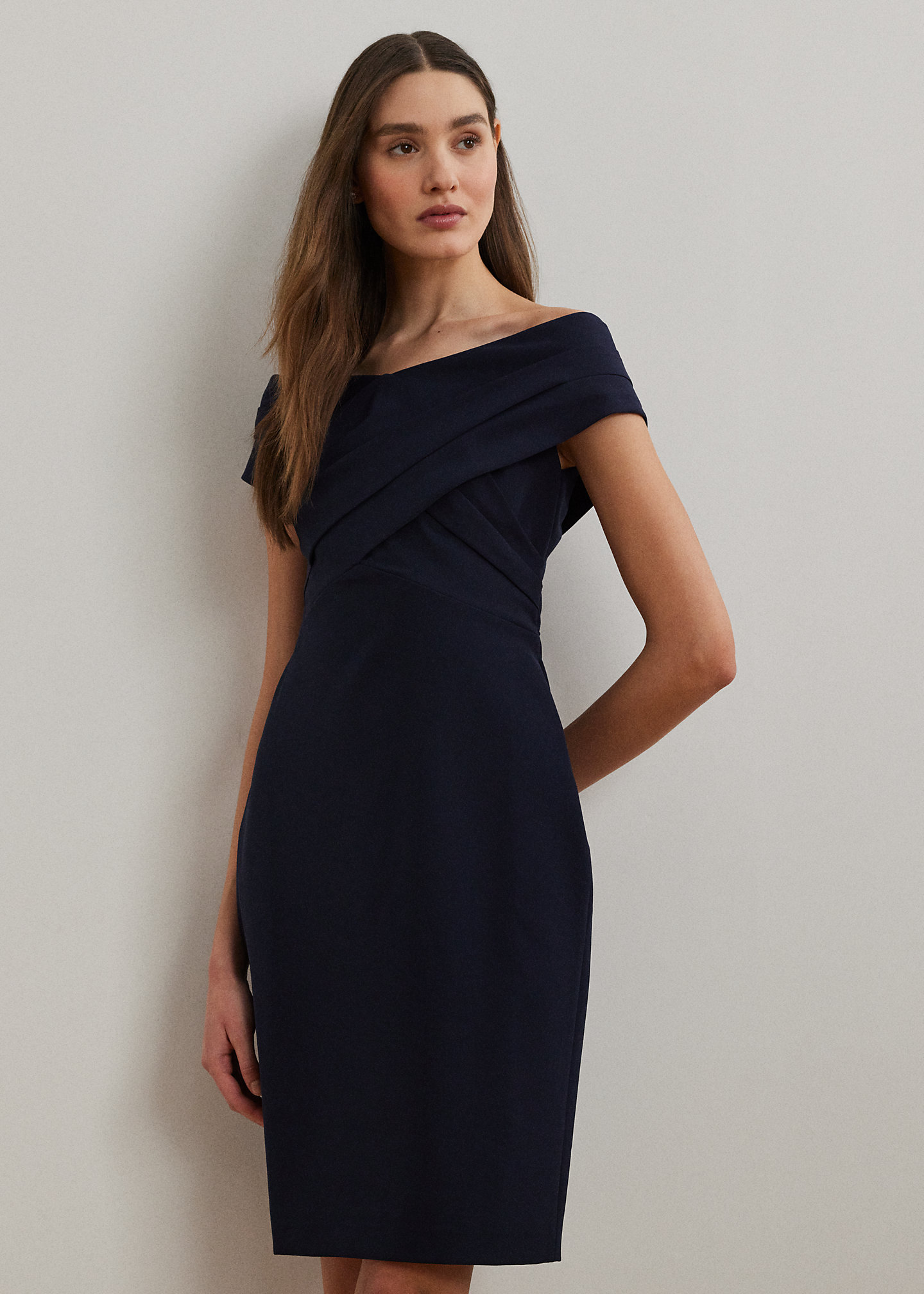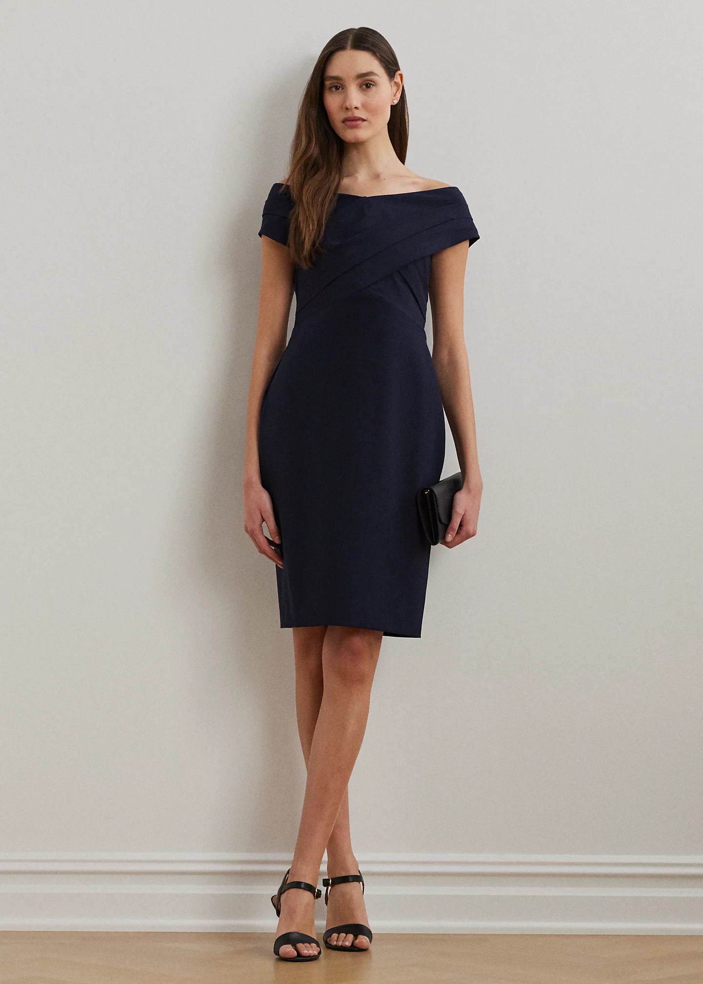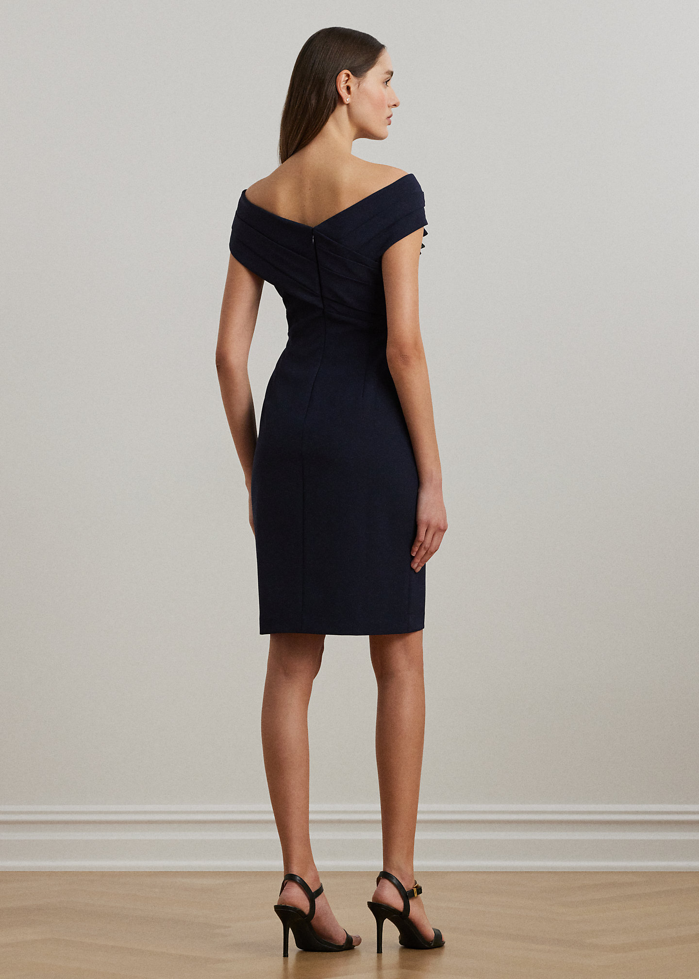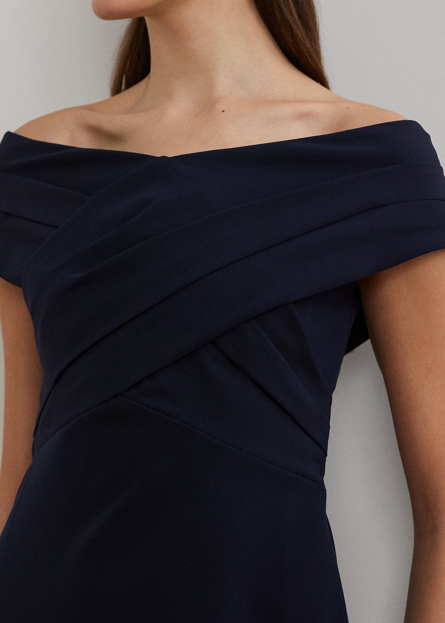 - Off-the-shoulder silhouette. Concealed center back zipper with a hook-and-eye closure.