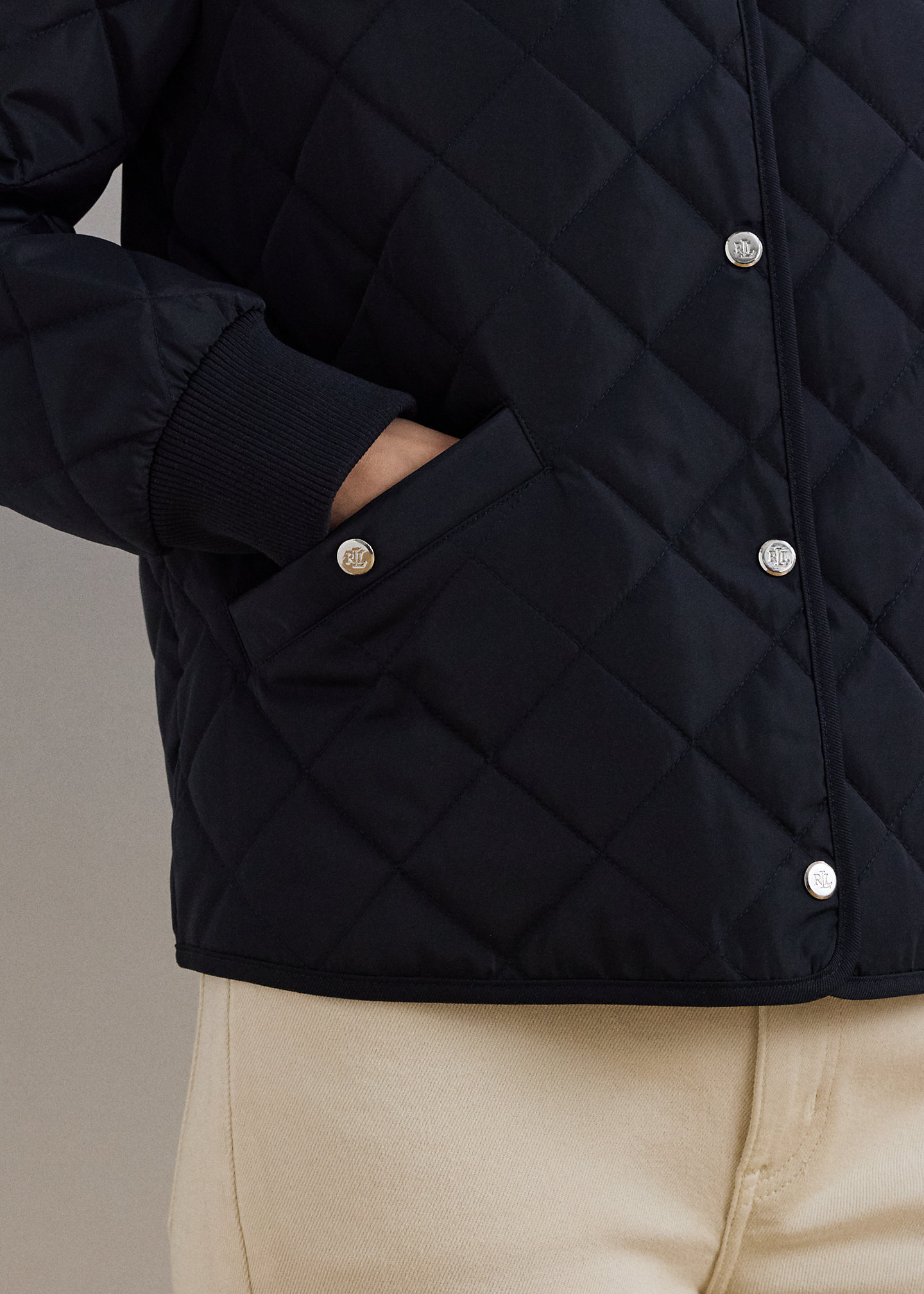 - Ribbed baseball collar. Snapped placket. “LRL”-engraved metal snaps.