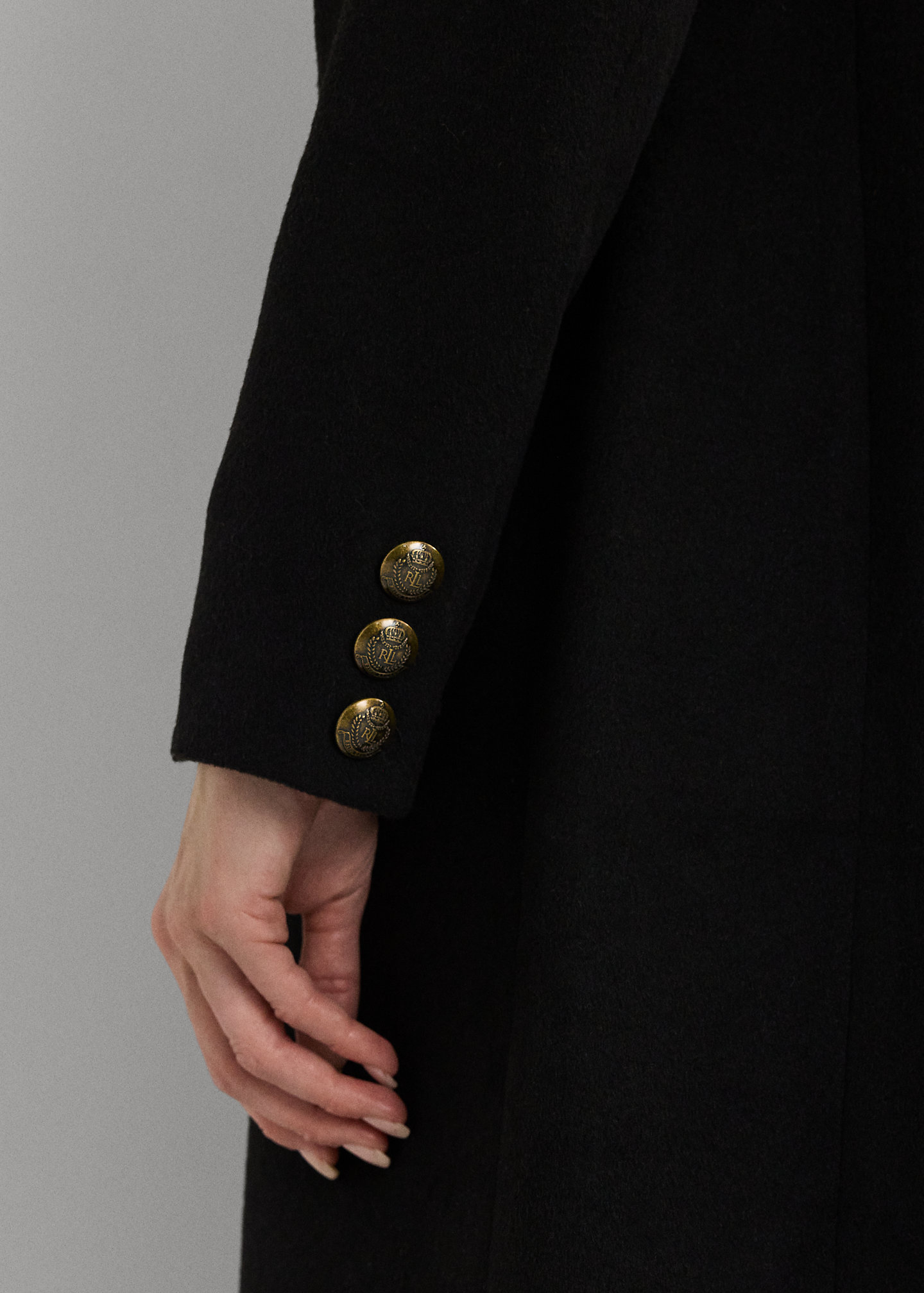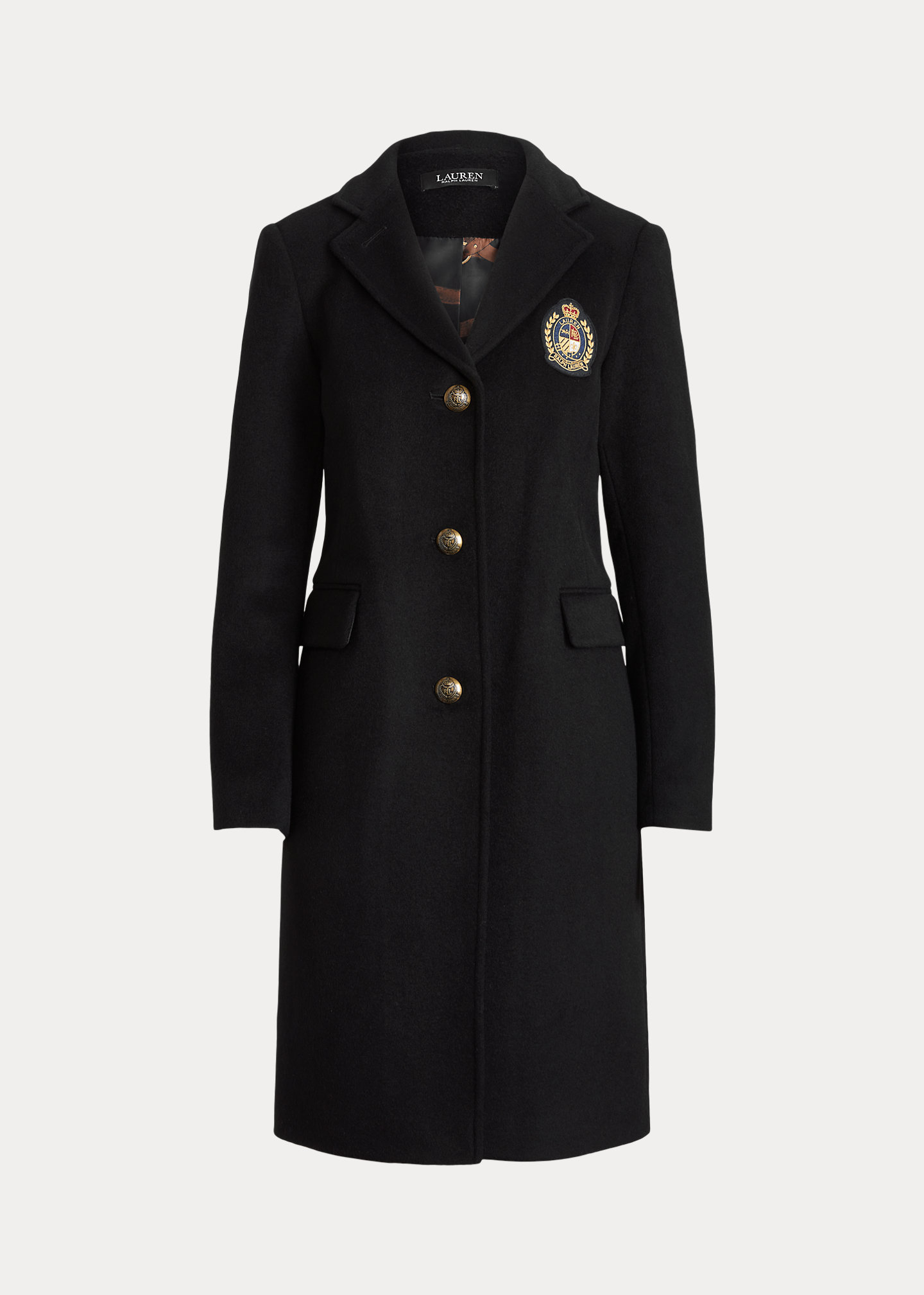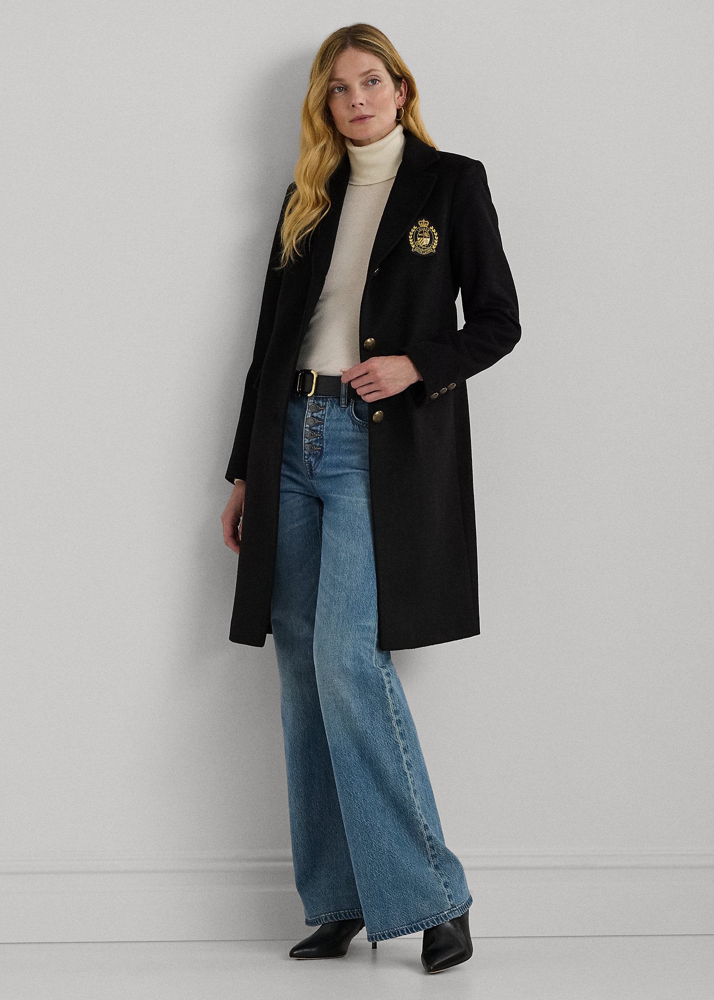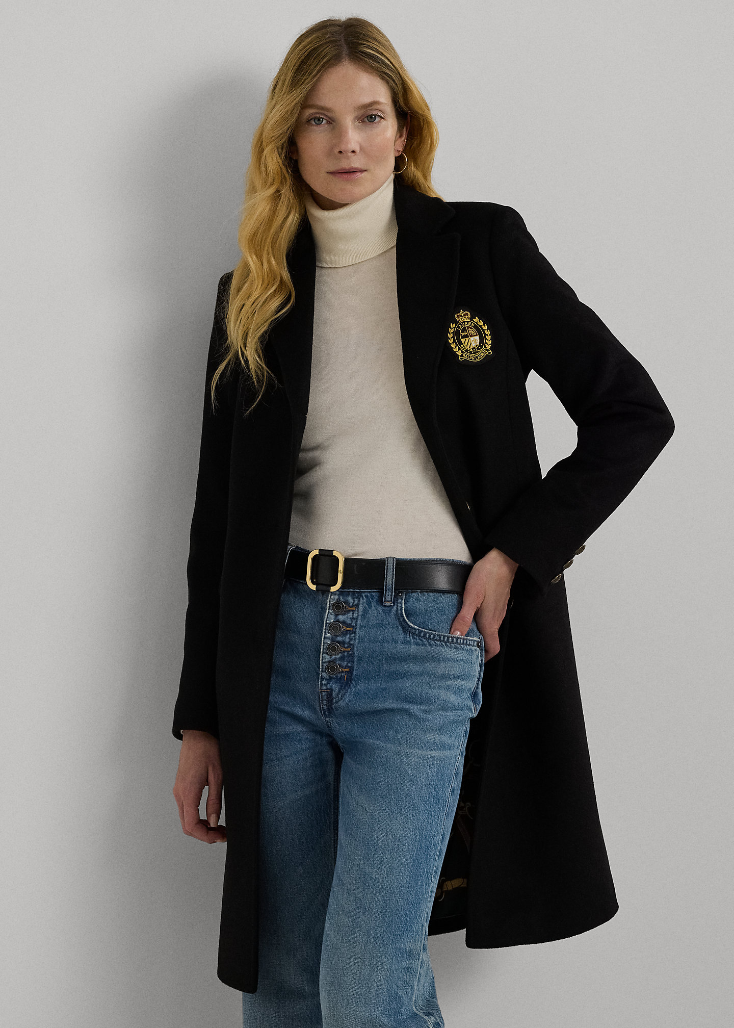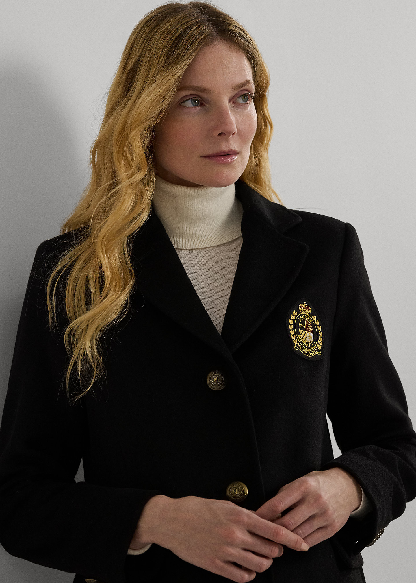 - Notch lapels. Two-button silhouette. Crest-embossed buttons.