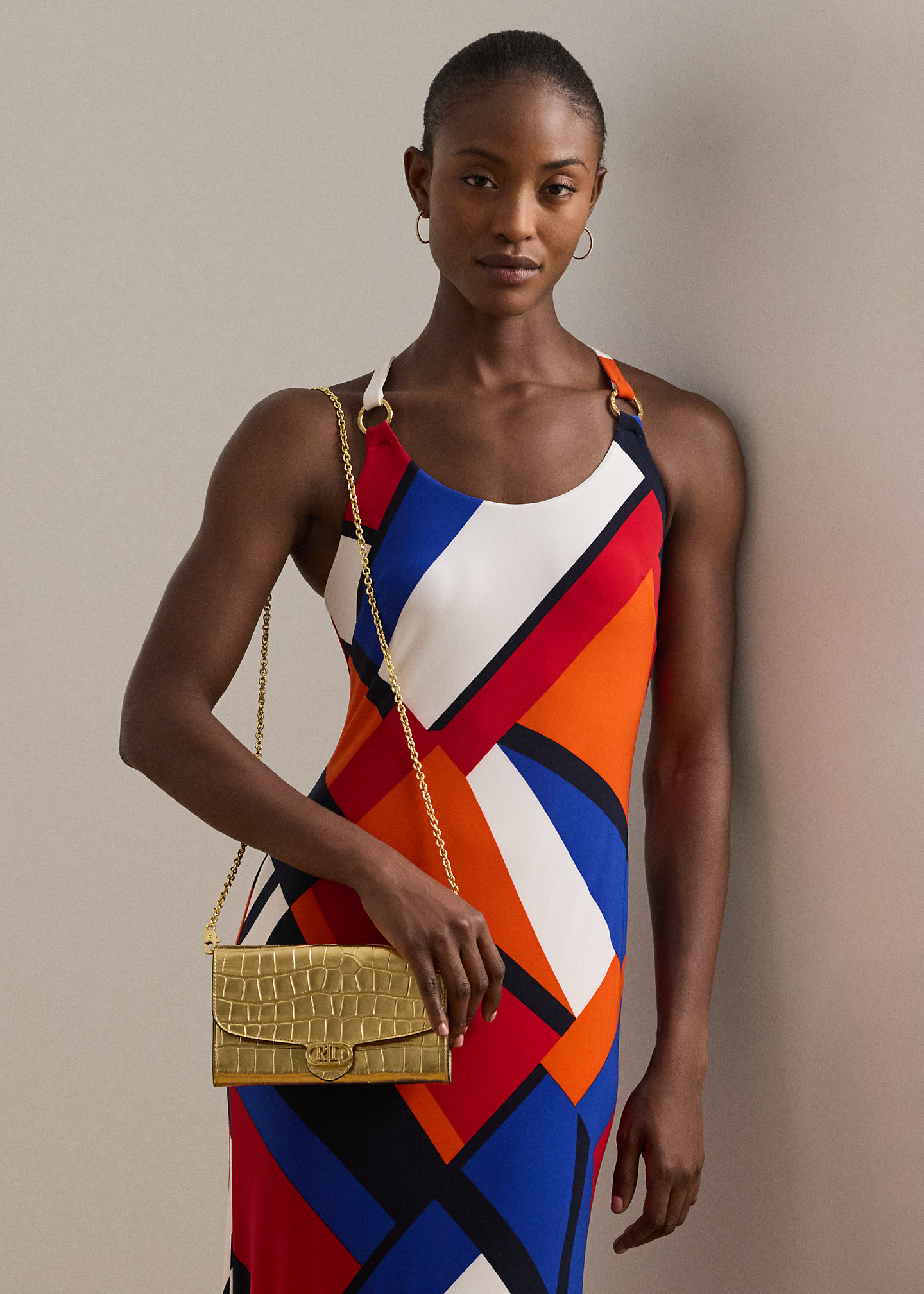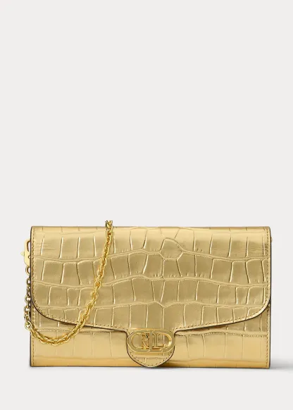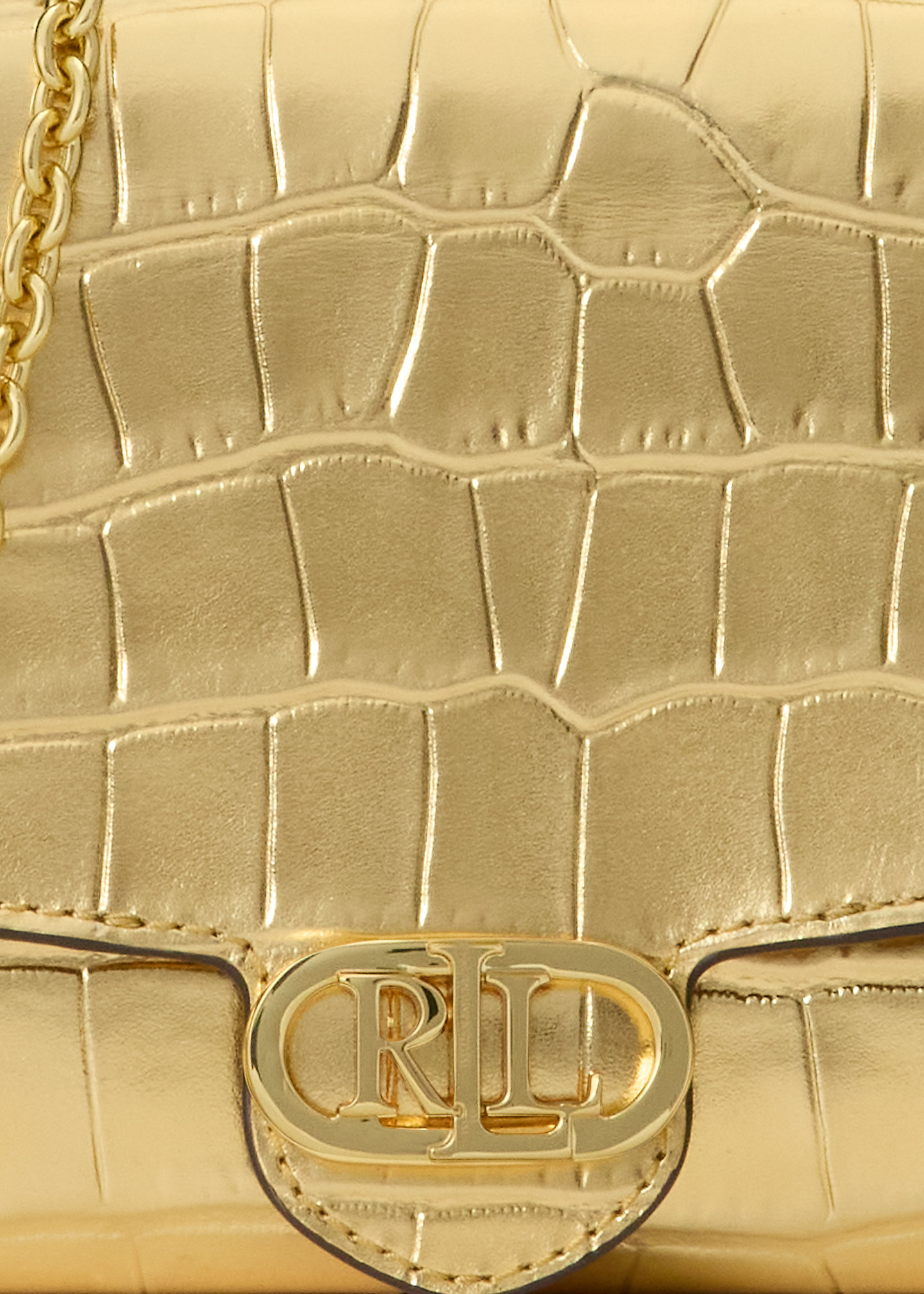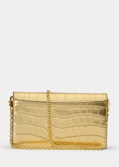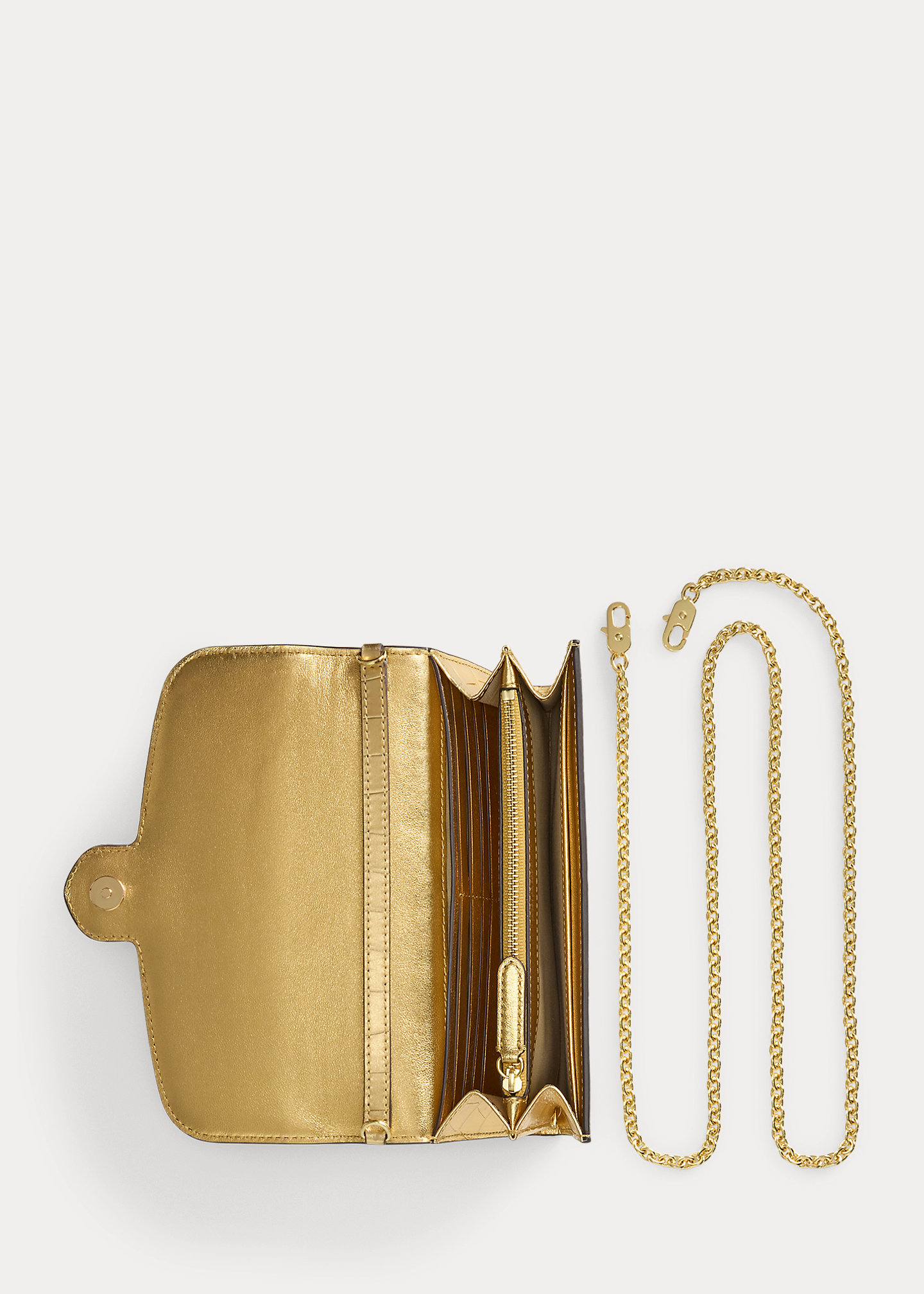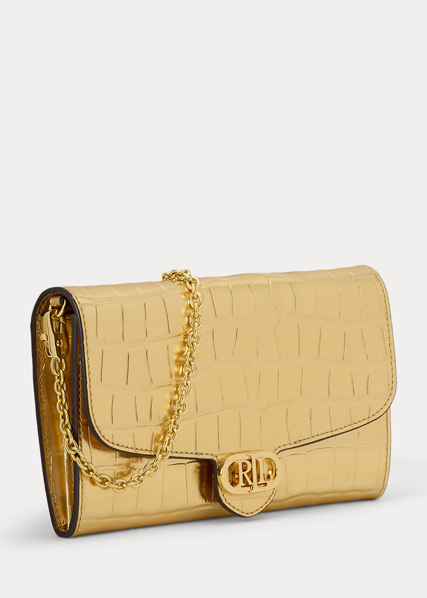 - Removable brass-finished chain crossbody strap with a 22" maximum drop.