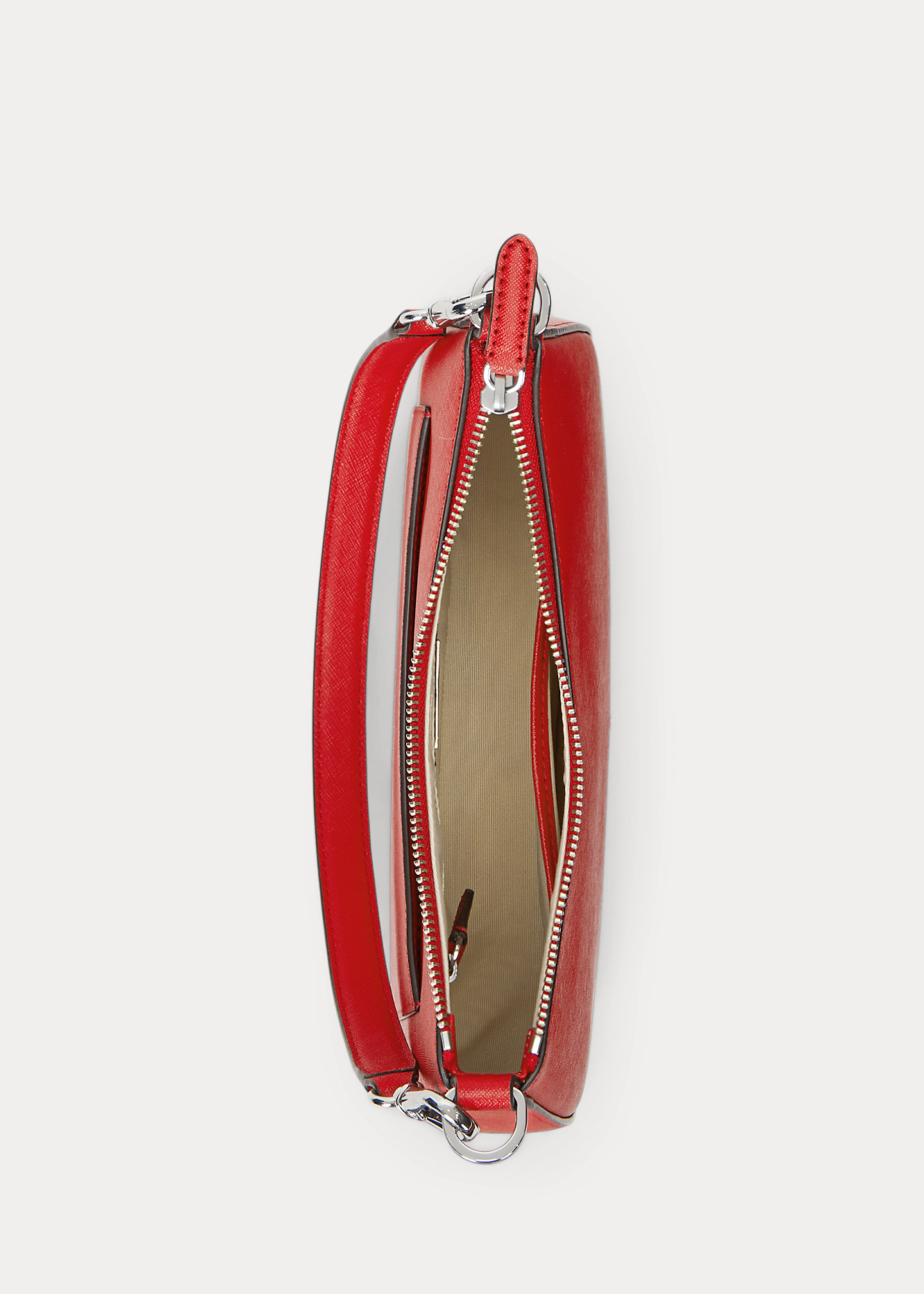 - Top zip closure. Polished "LRL" metal logo at the front.