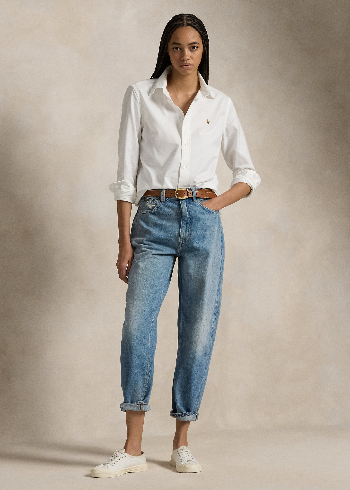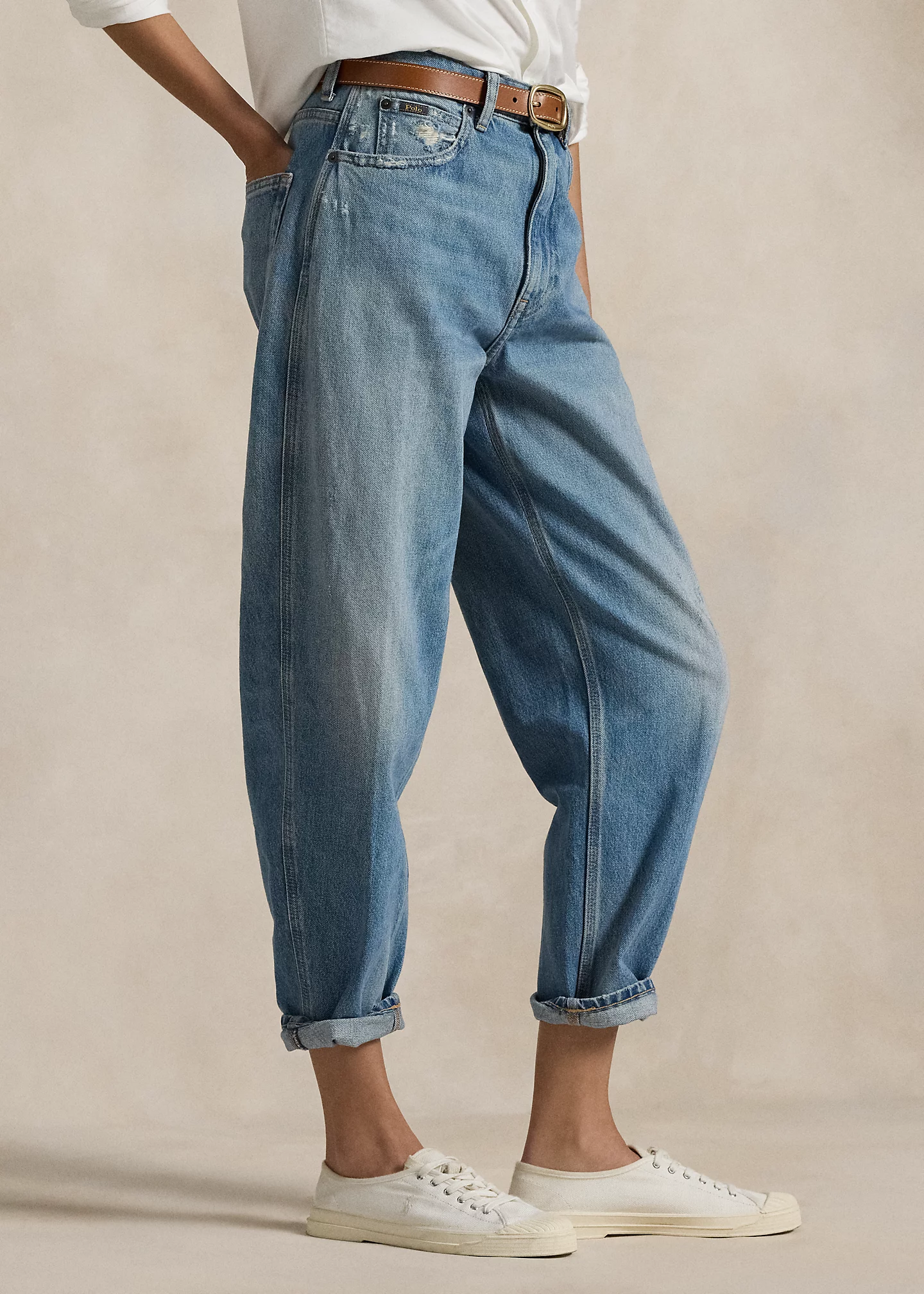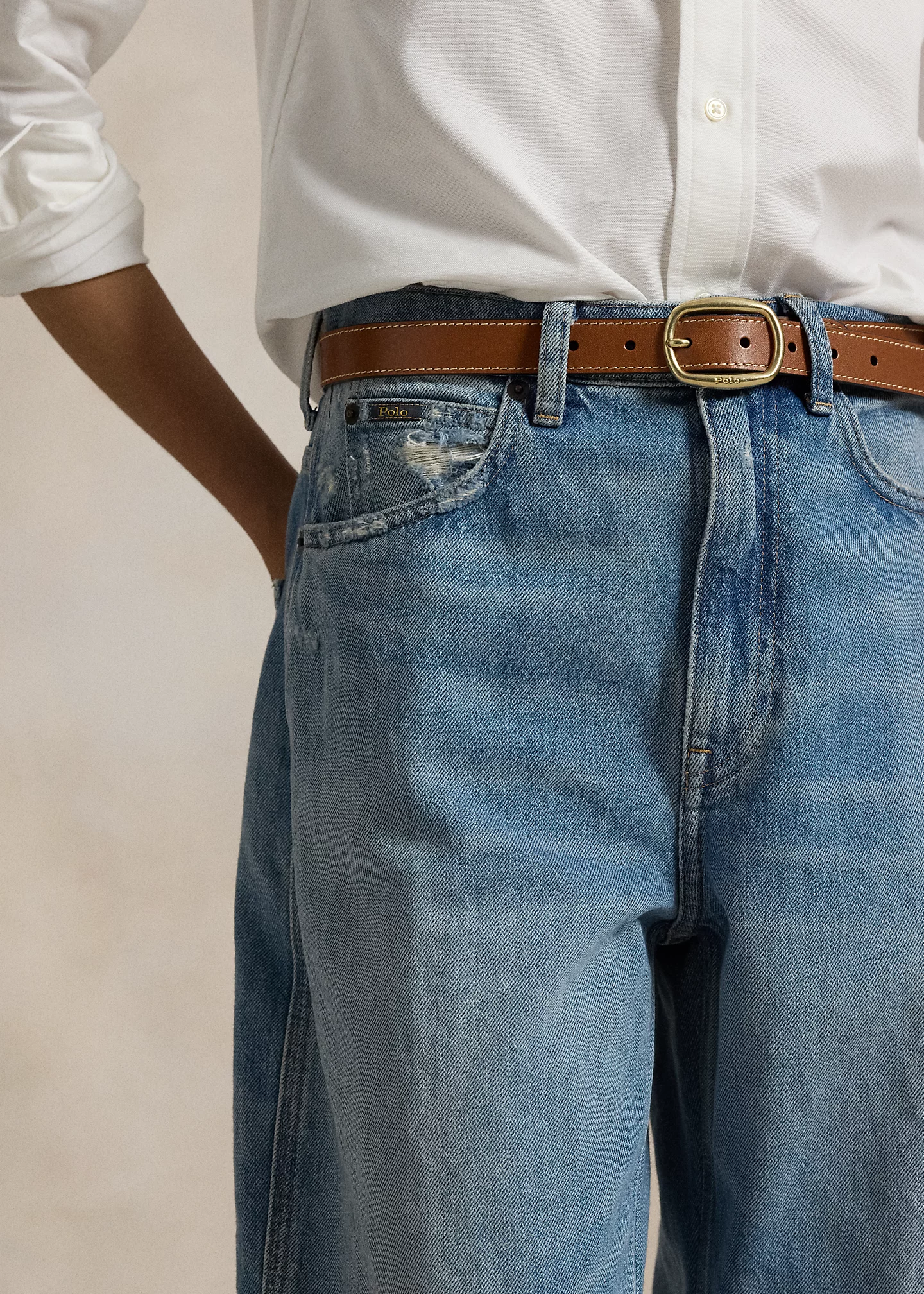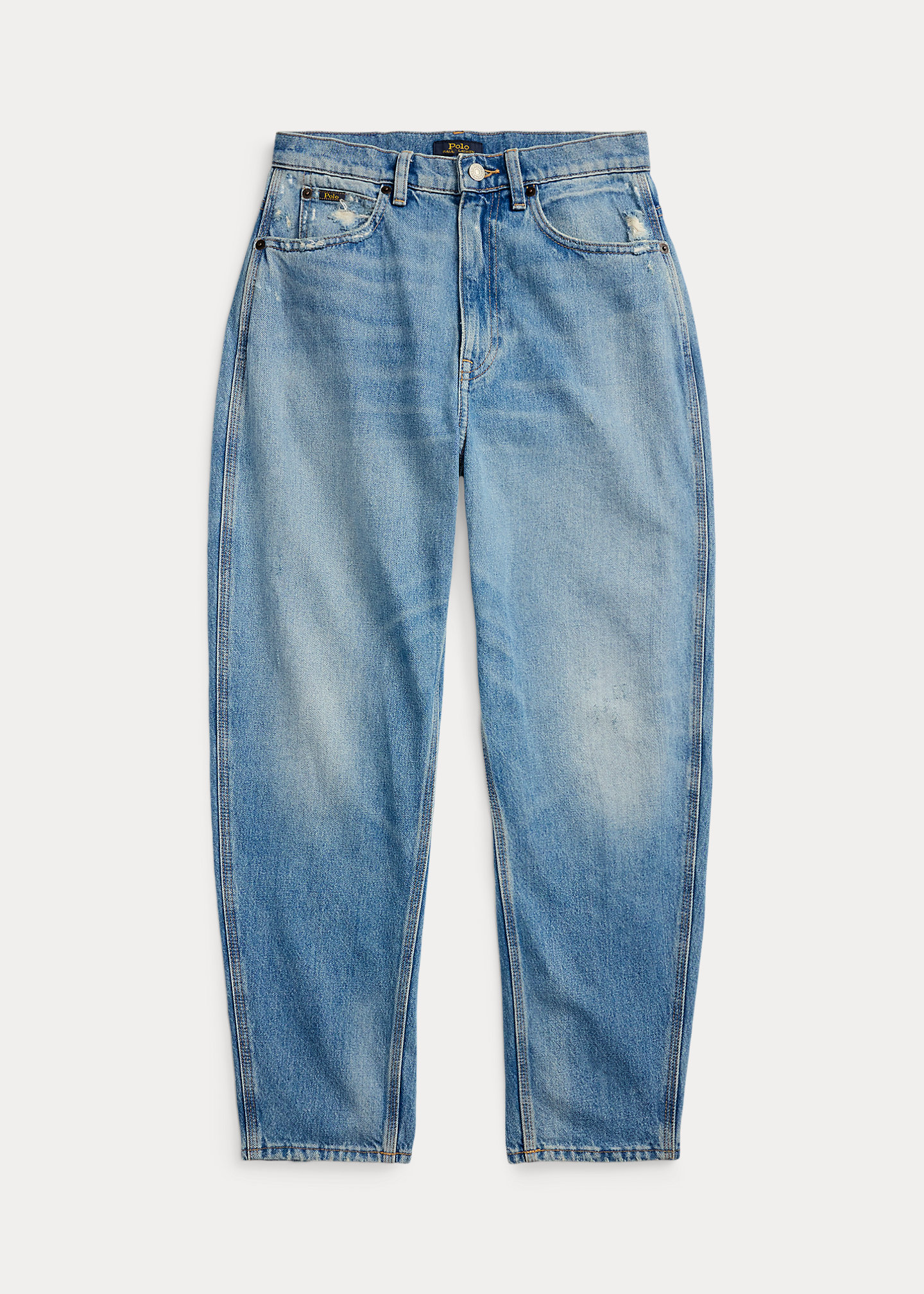- Belt loops. Zip fly with a signature buttoned closure. Five-pocket styling with signature “P.R.L. 67”–engraved metal rivets.