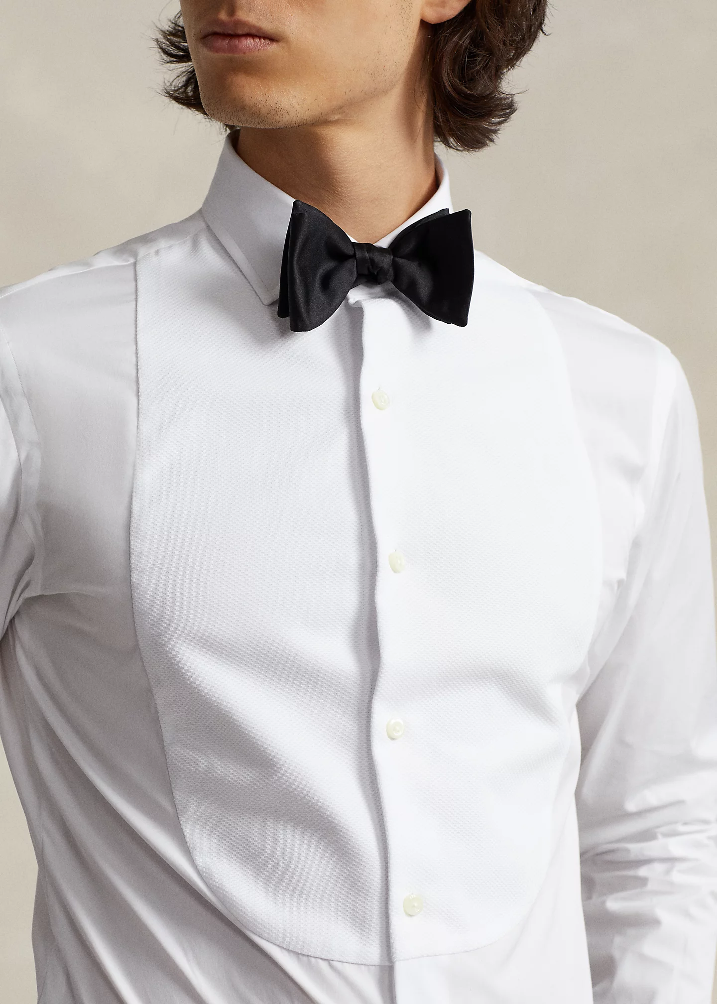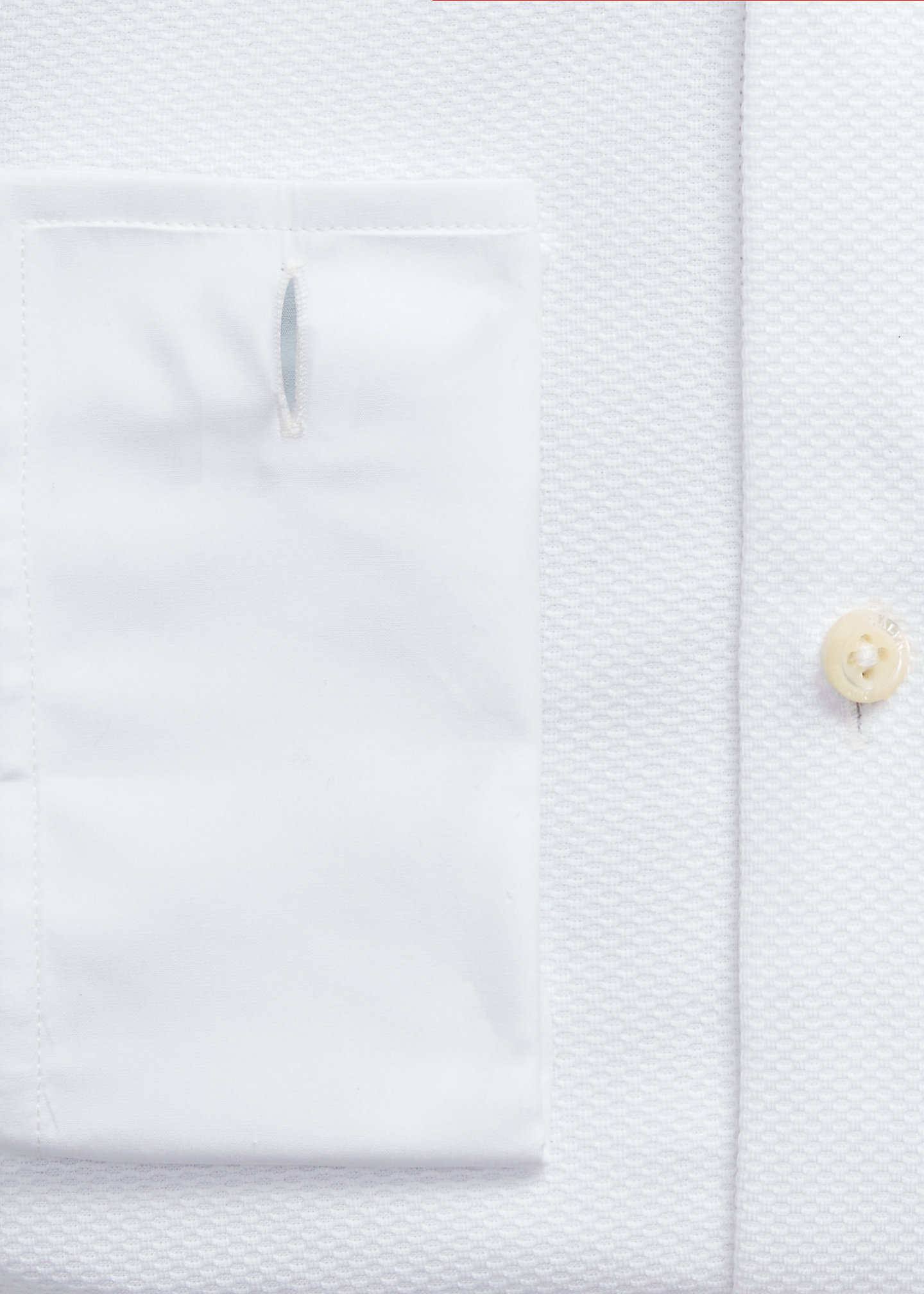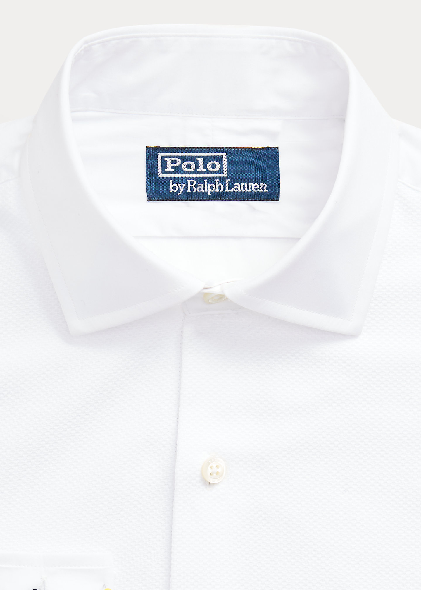 - Medium-spread collar. Stitched bib. Buttoned placket. Genuine mother-of-pearl buttons. Last buttonhole is stitched horizontally for a superior hold.