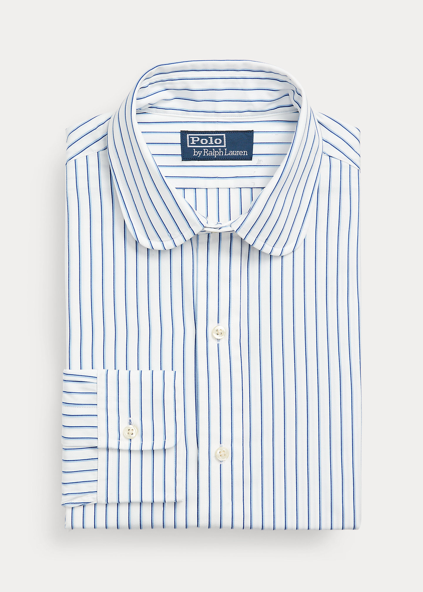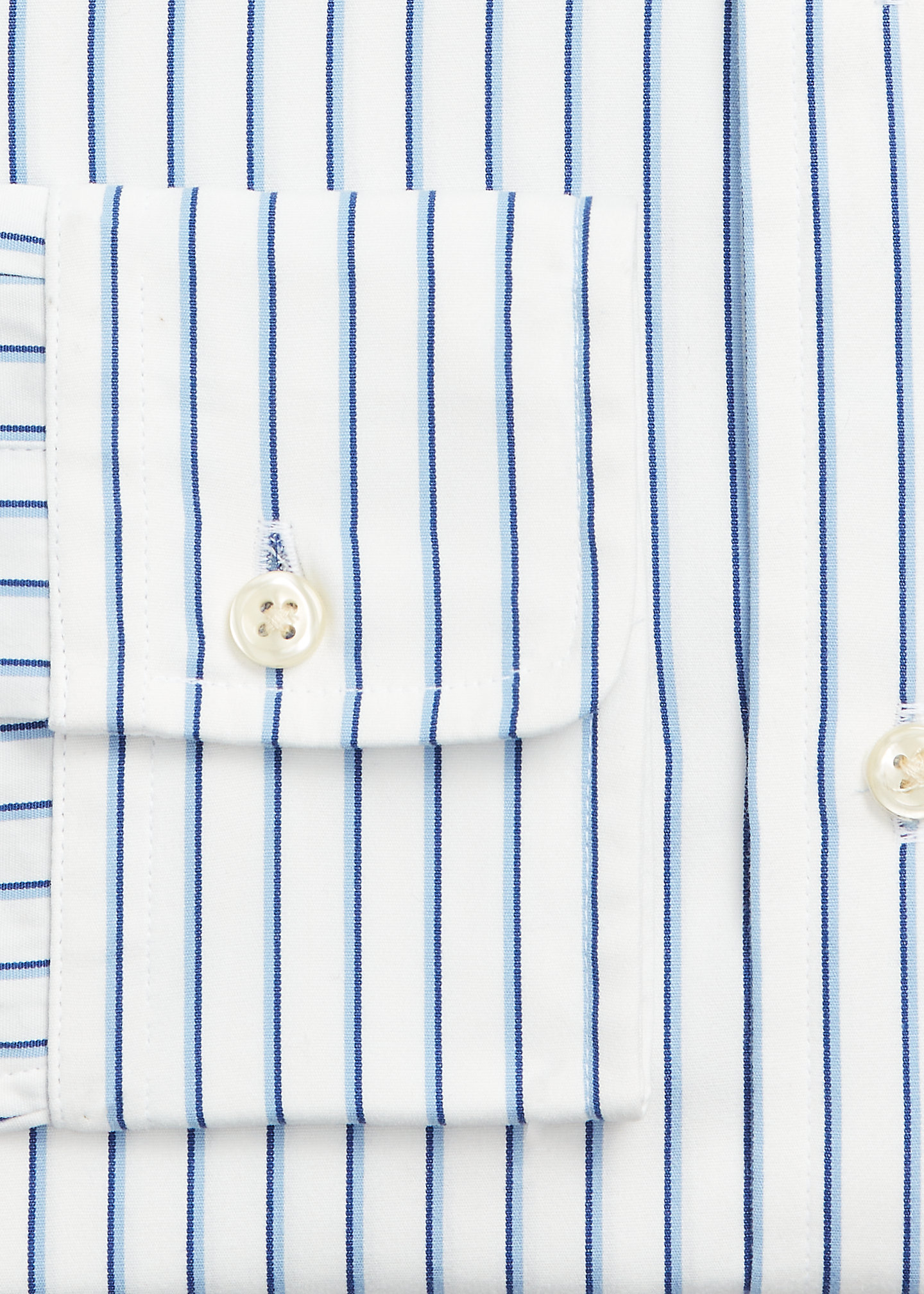 - Long sleeves with buttoned barrel cuffs. Split pleated back yoke ensures smooth, contoured shoulders.