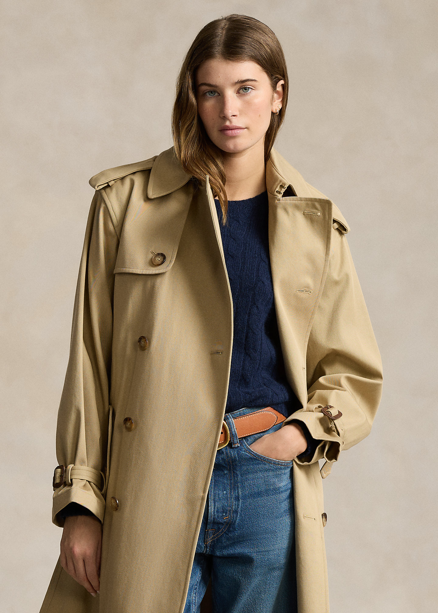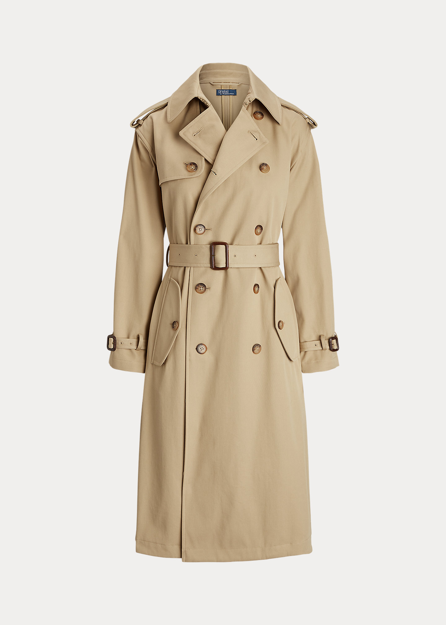 - Double-breasted silhouette. Signature engraved buttons. Long sleeves with belted tabs at the cuffs. Buttoned shoulder epaulets. Two front waist welt pockets. Left chest and back storm flaps. Belt loops. Comes with a self-belt. Vented back hem. Unlined.