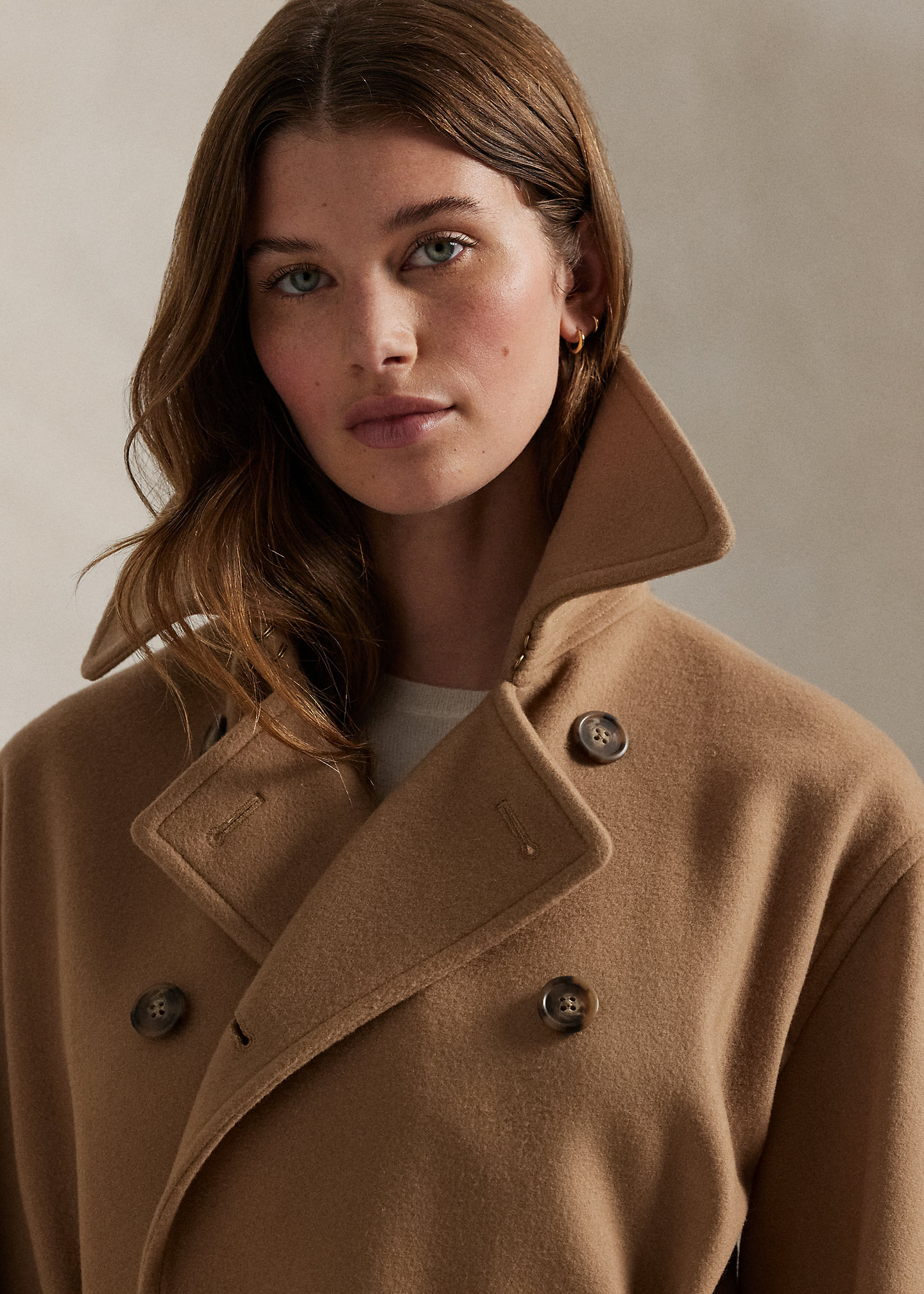 - Double-breasted silhouette. Spread collar. Two hook-and-eye closures at the collar stand.