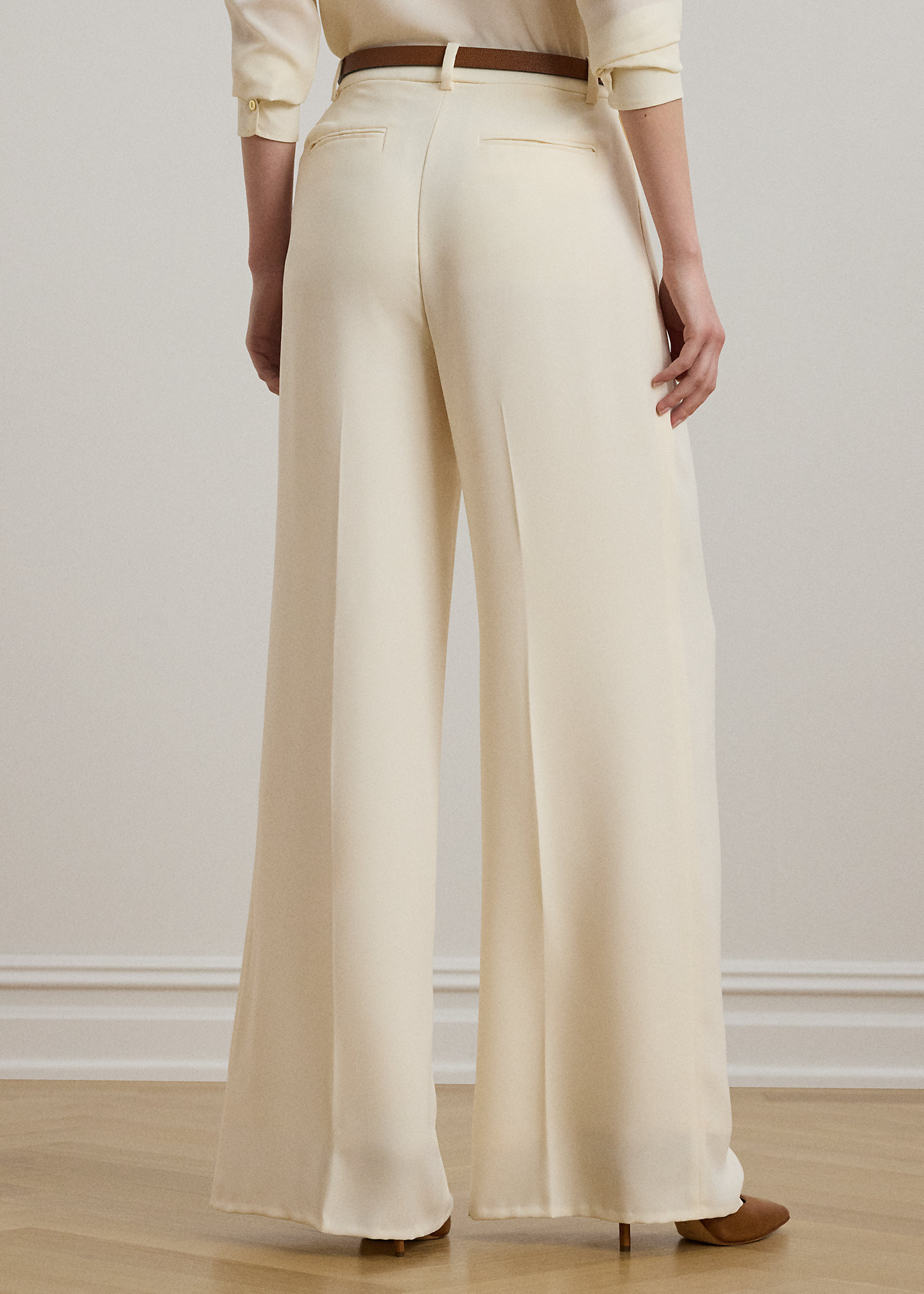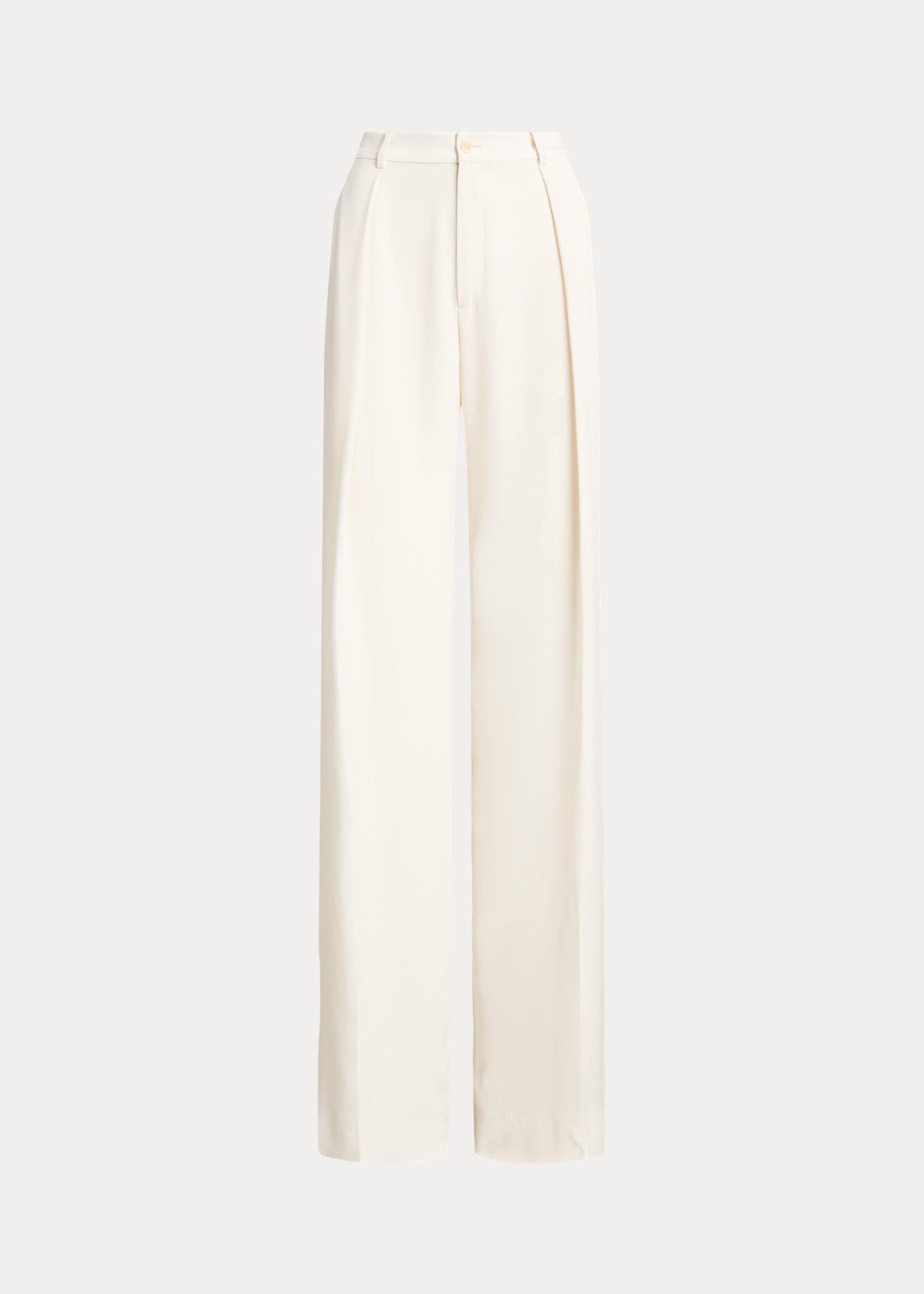 - Pleating at the front waist. Creases run down the front and back of each leg.
