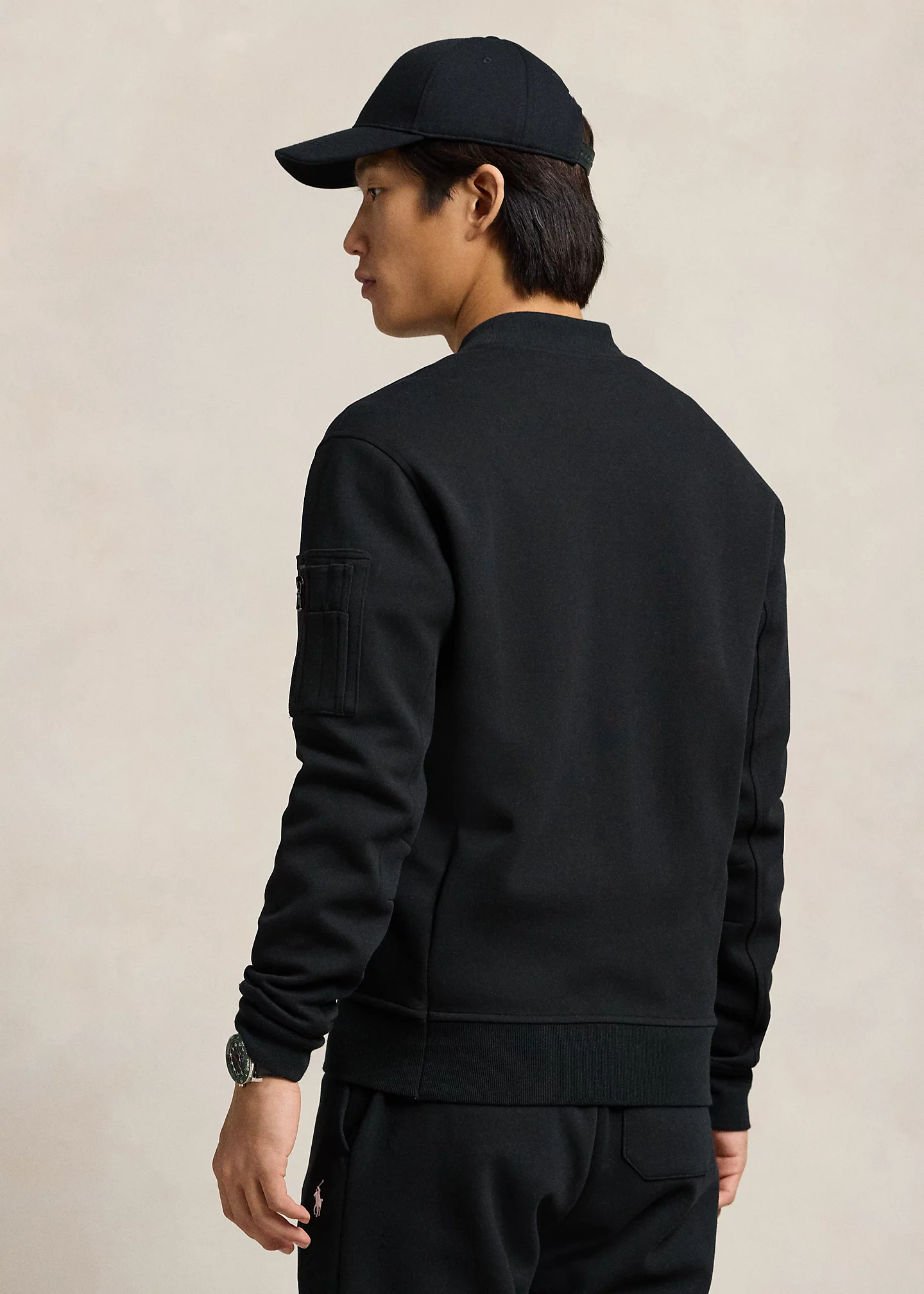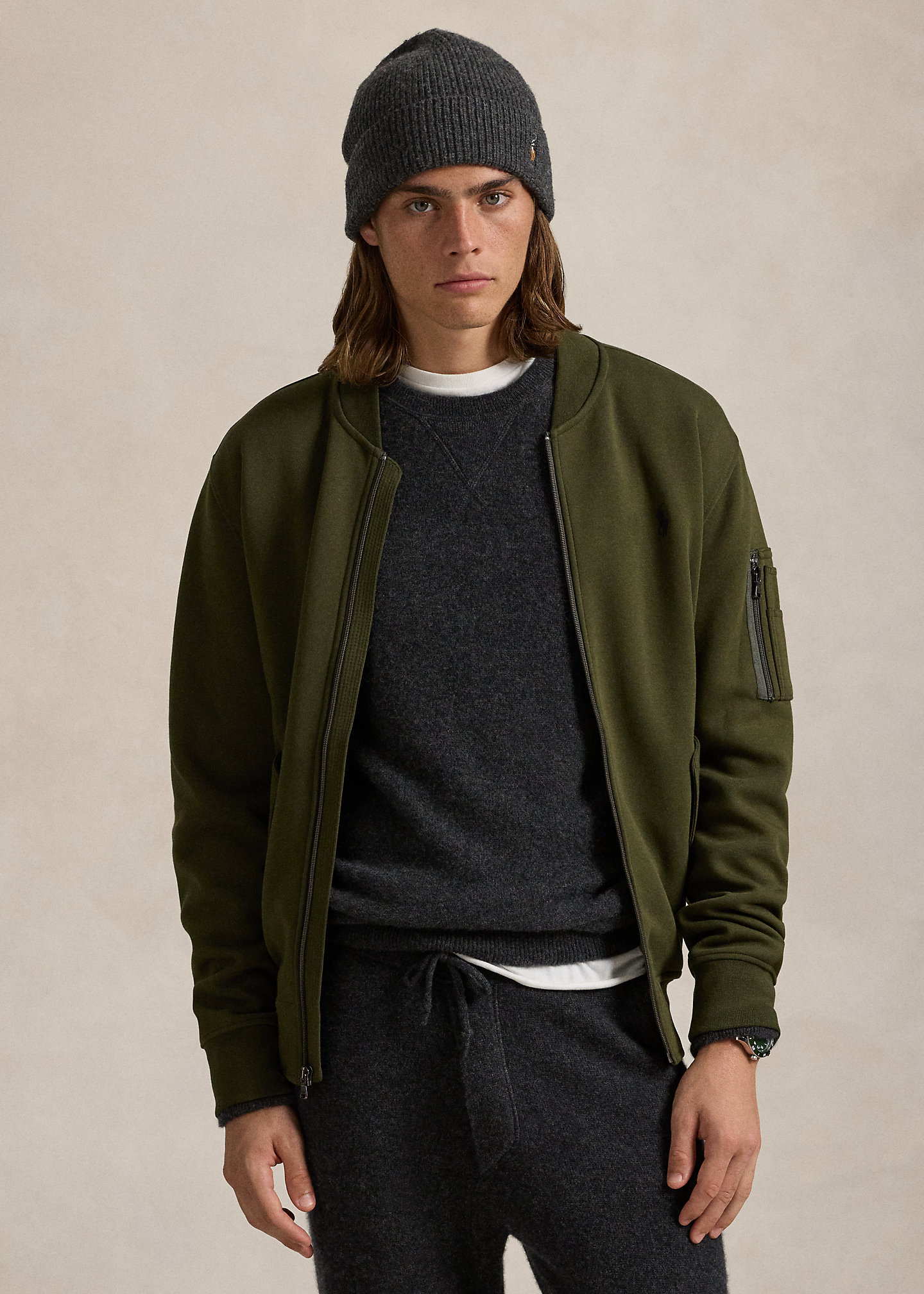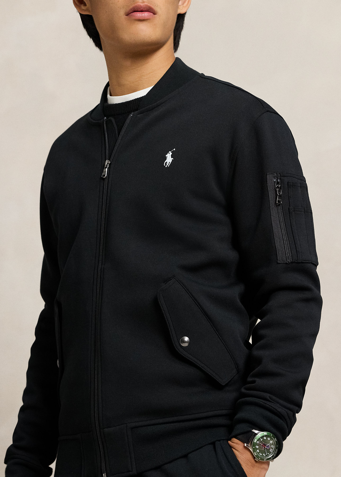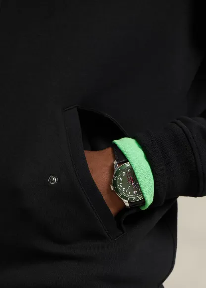 - Long sleeves with ribbed cuffs. Left sleeve zip pocket.