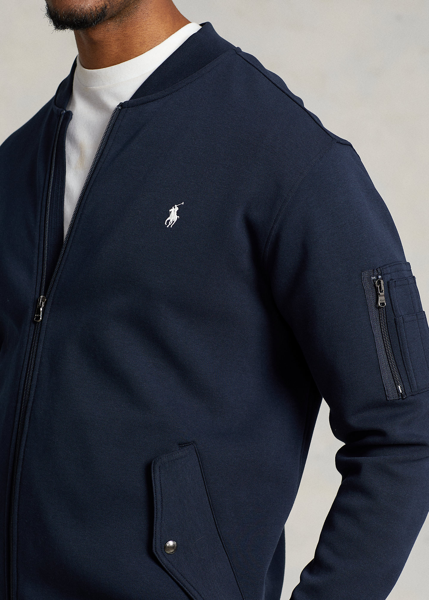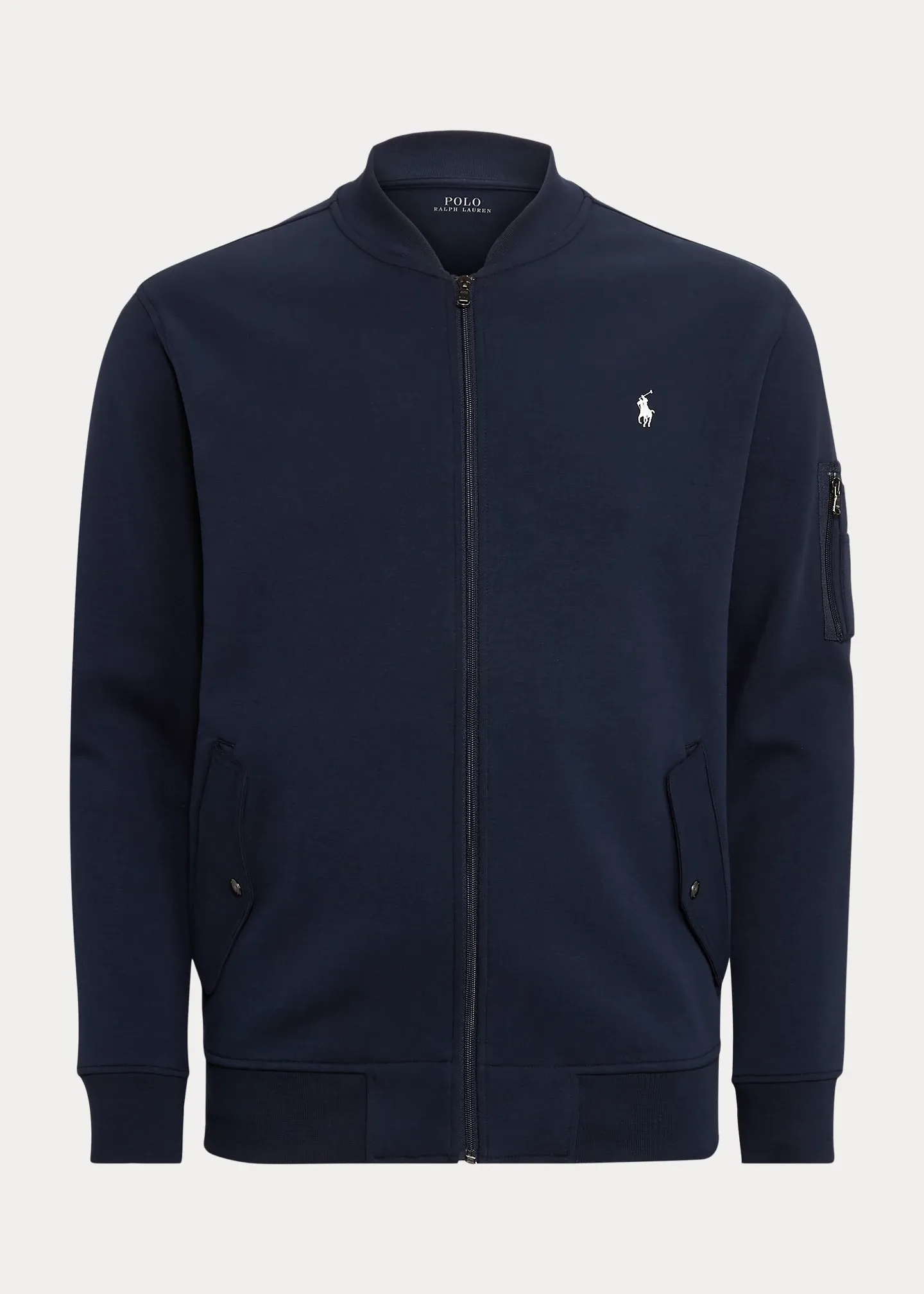 - Ribbed baseball collar. Full-zip front. Long sleeves with ribbed cuffs. Left sleeve zip pocket.