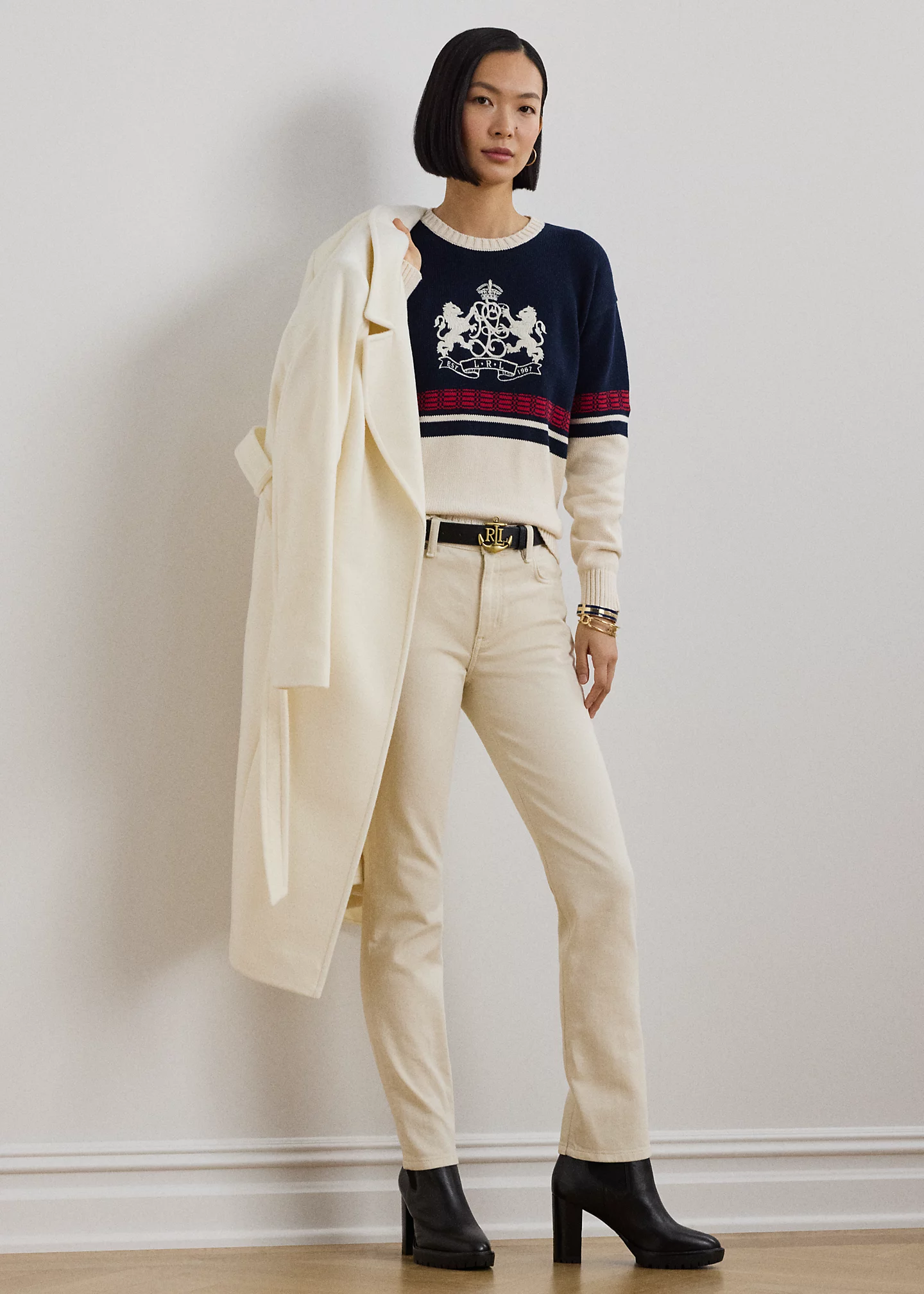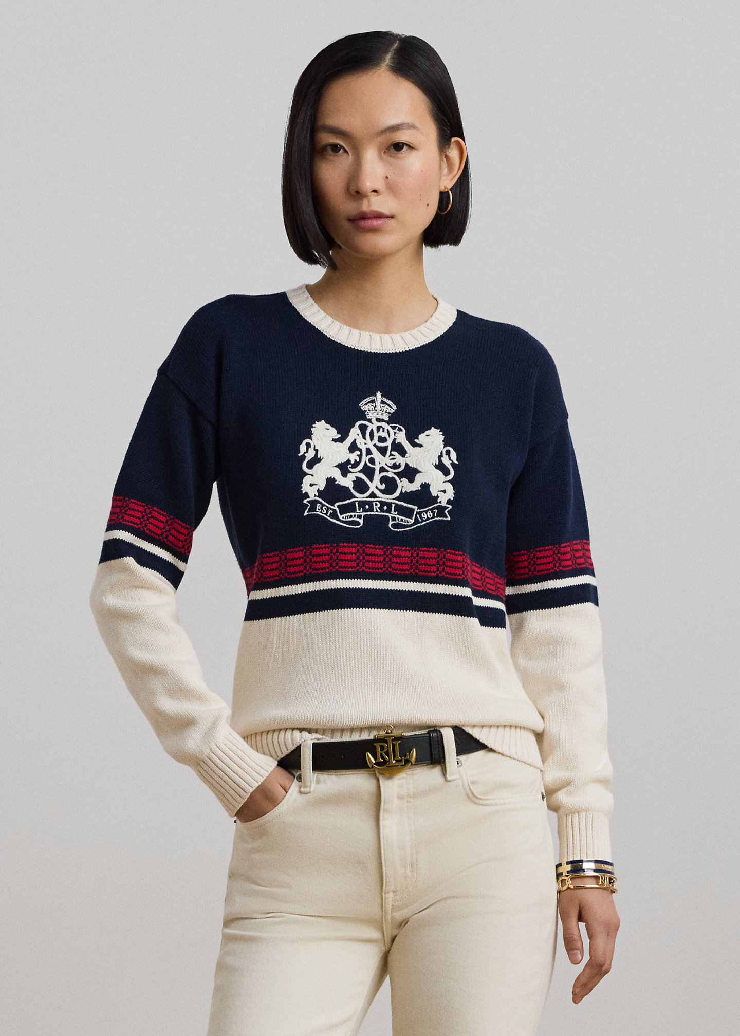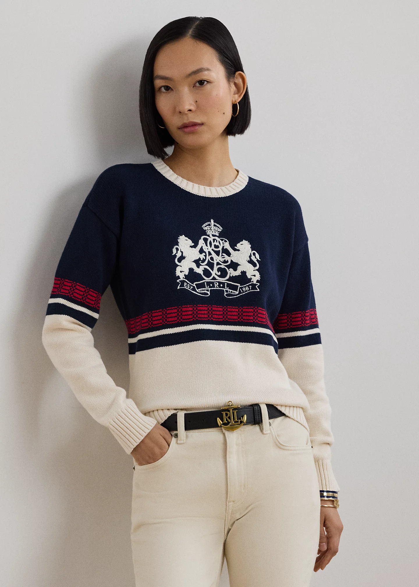 - Long sleeves with ribbed cuffs. "LRL est. 1967" lion crest embroidered at the chest. Ribbed hem.