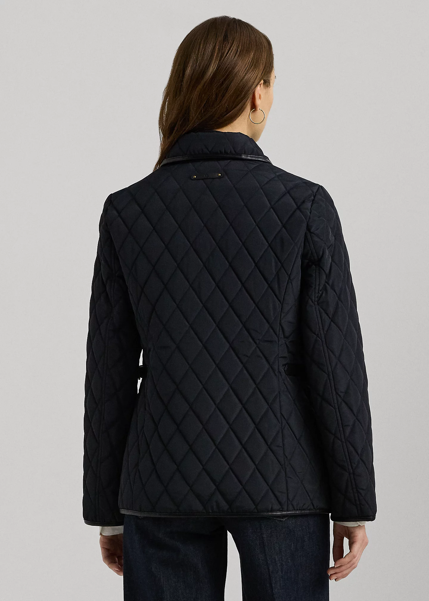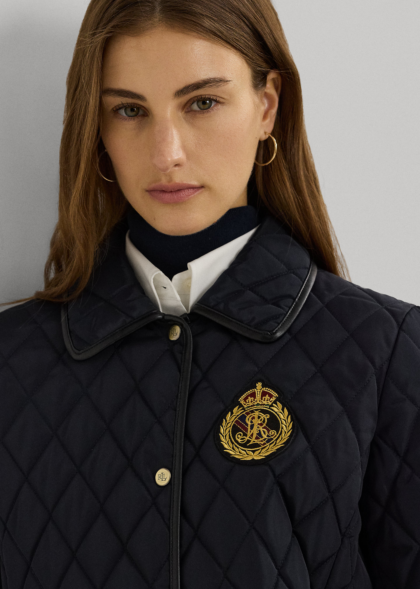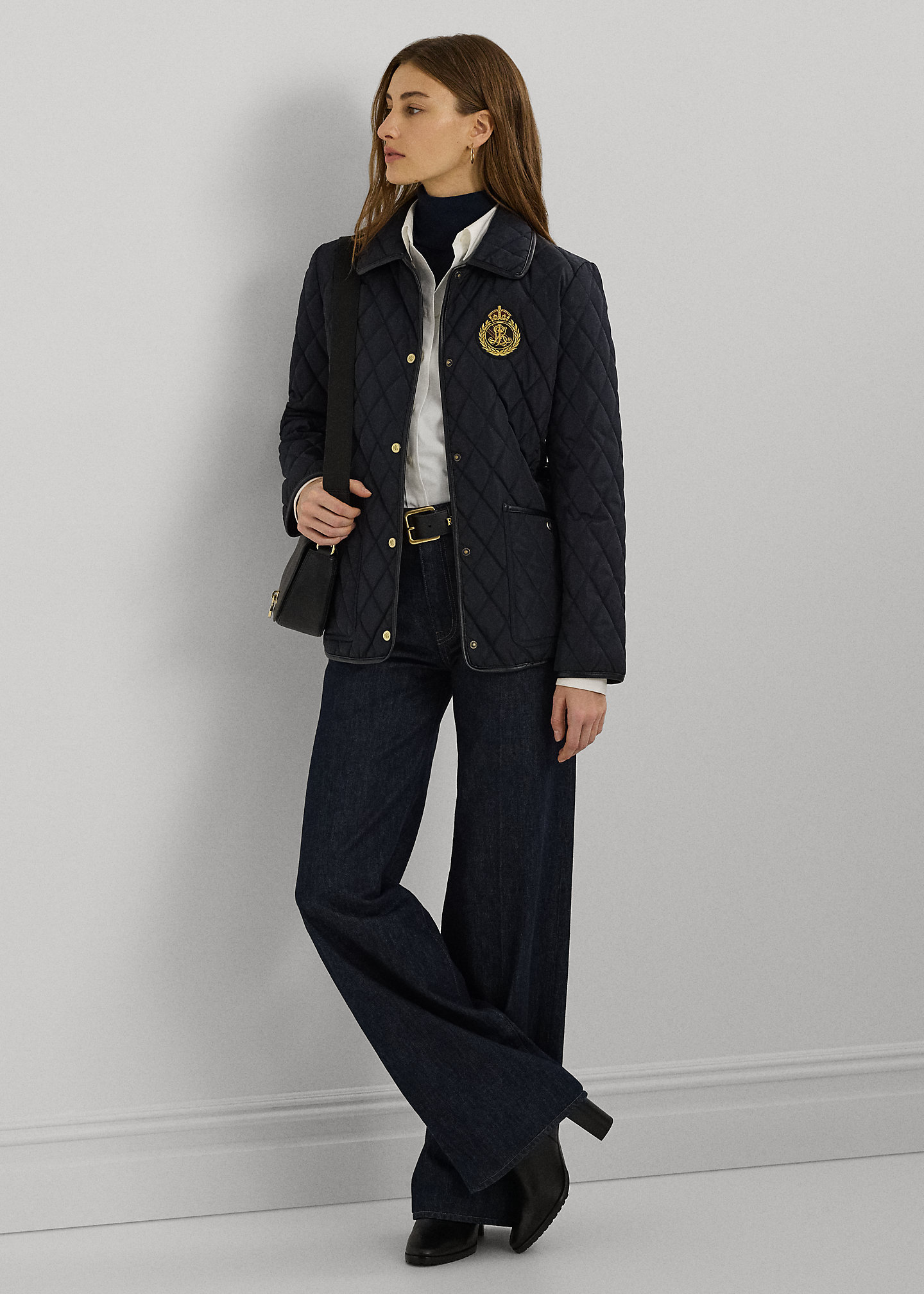 - Signature embroidered crest patch at the left chest. Adjustable faux-leather buckled tab at each side of the waist. Back princess seams. Fully lined and lightly filled.