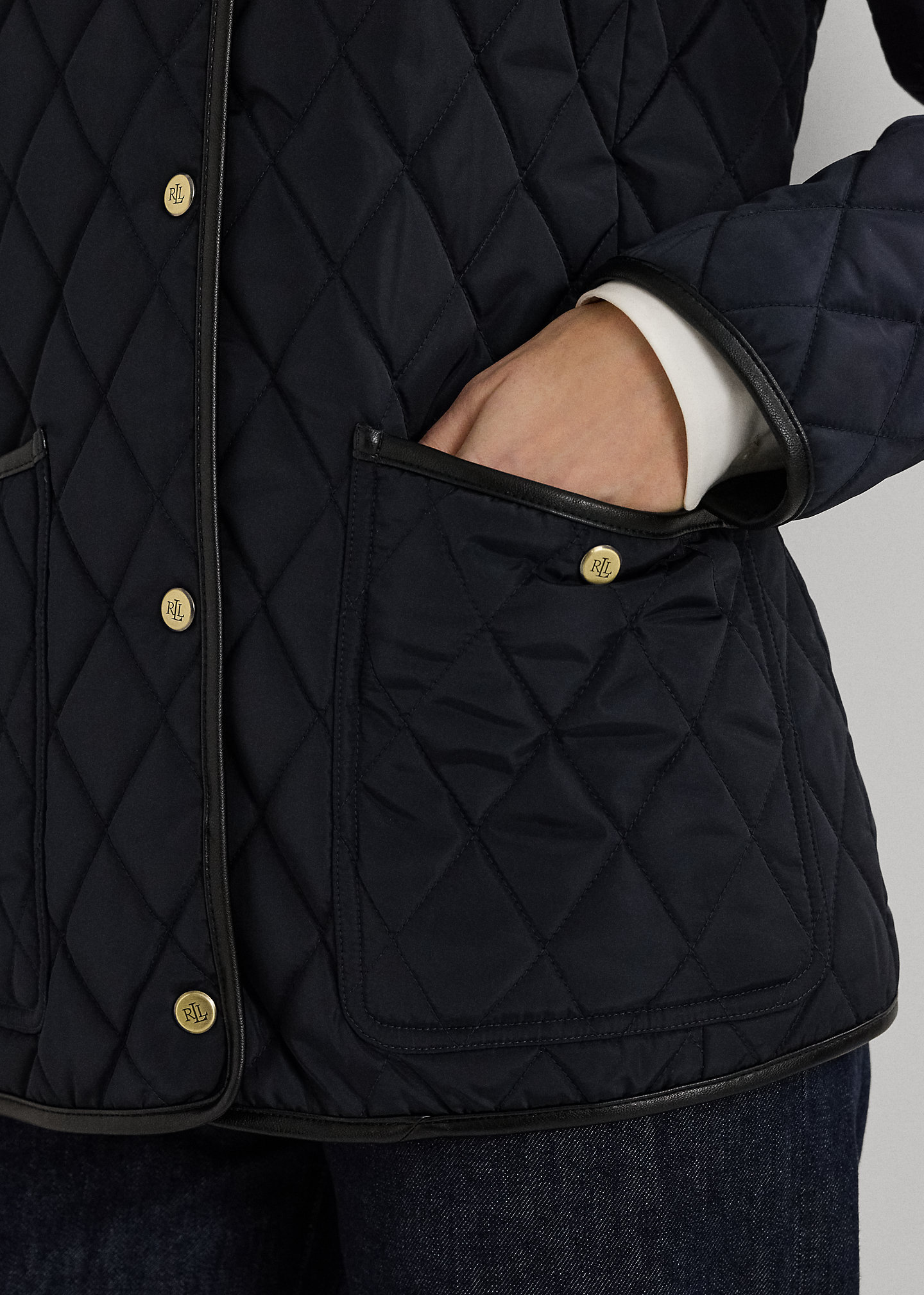 - Faux leather–trimmed spread collar. Snapped placket. “LRL”-engraved metal snaps.