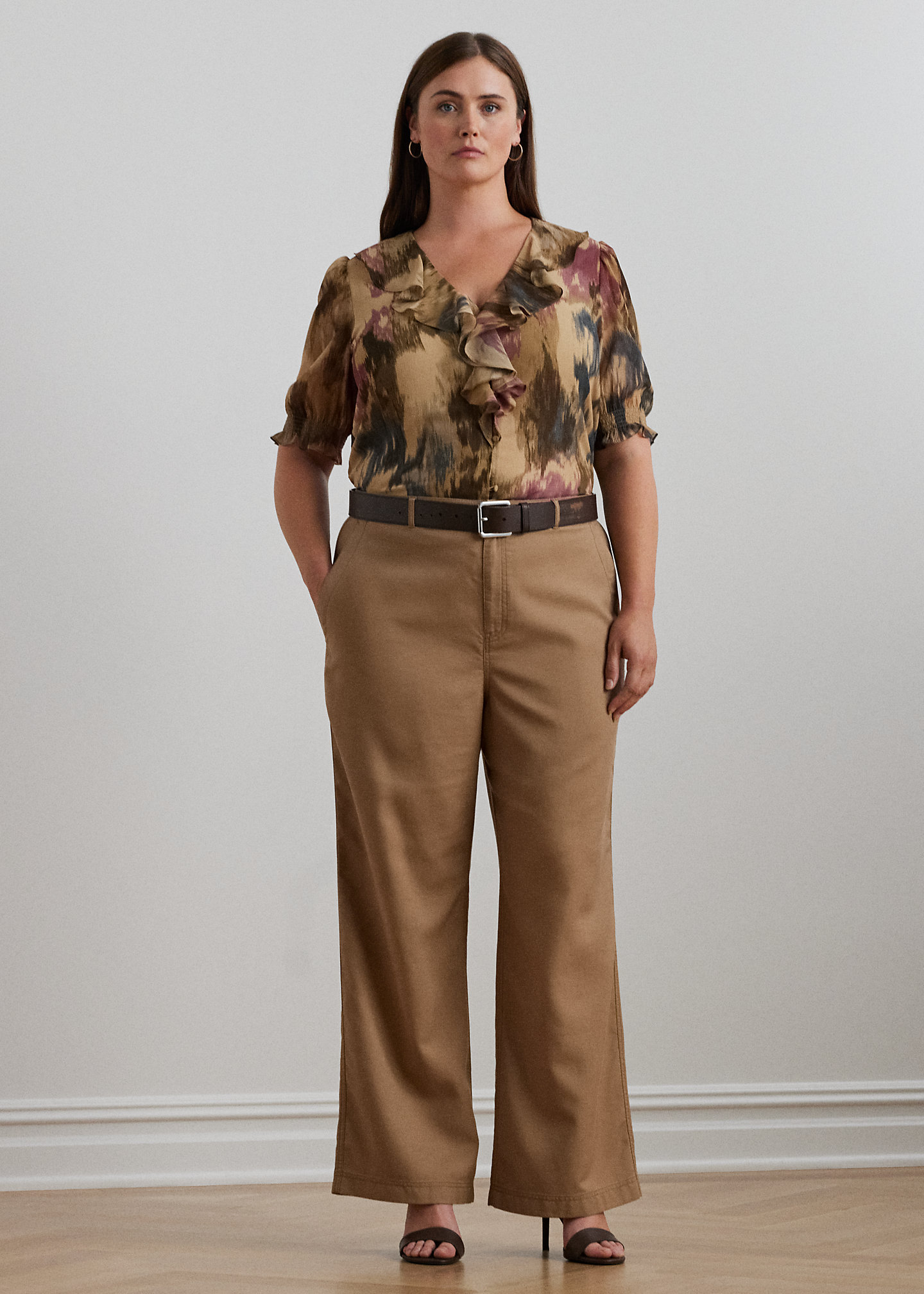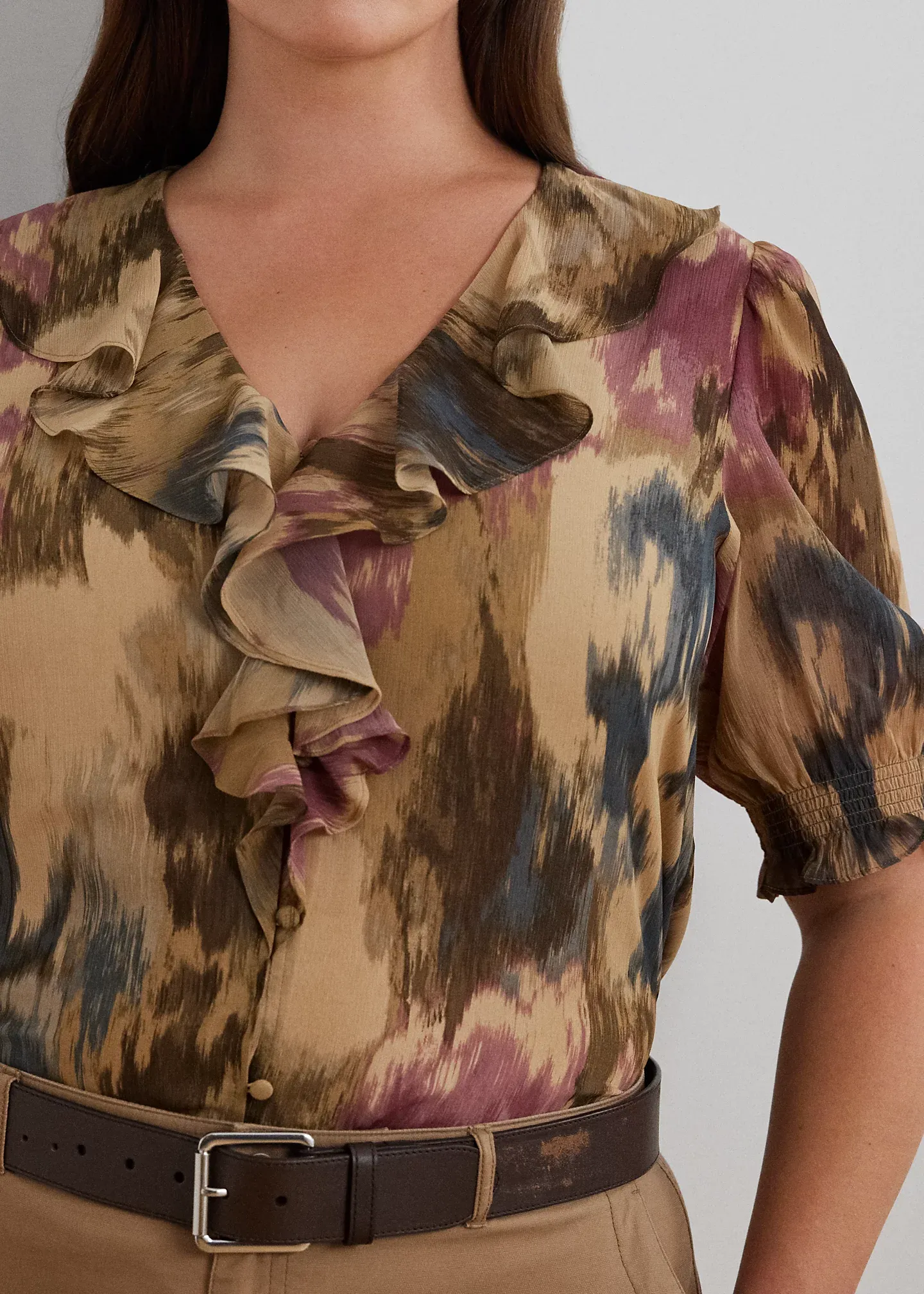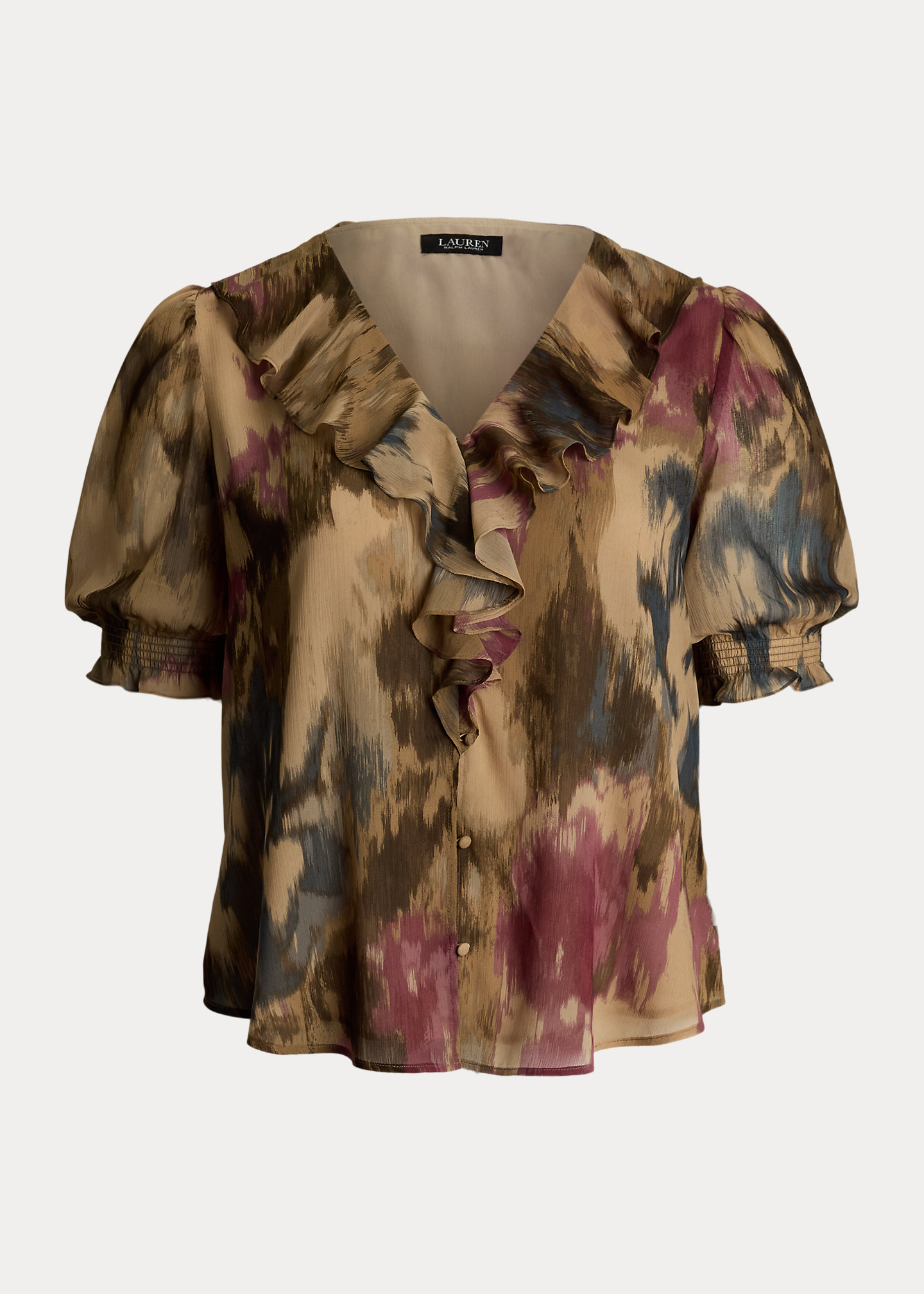 - Ruffle-trimmed V-neck. Button-and-loop placket.