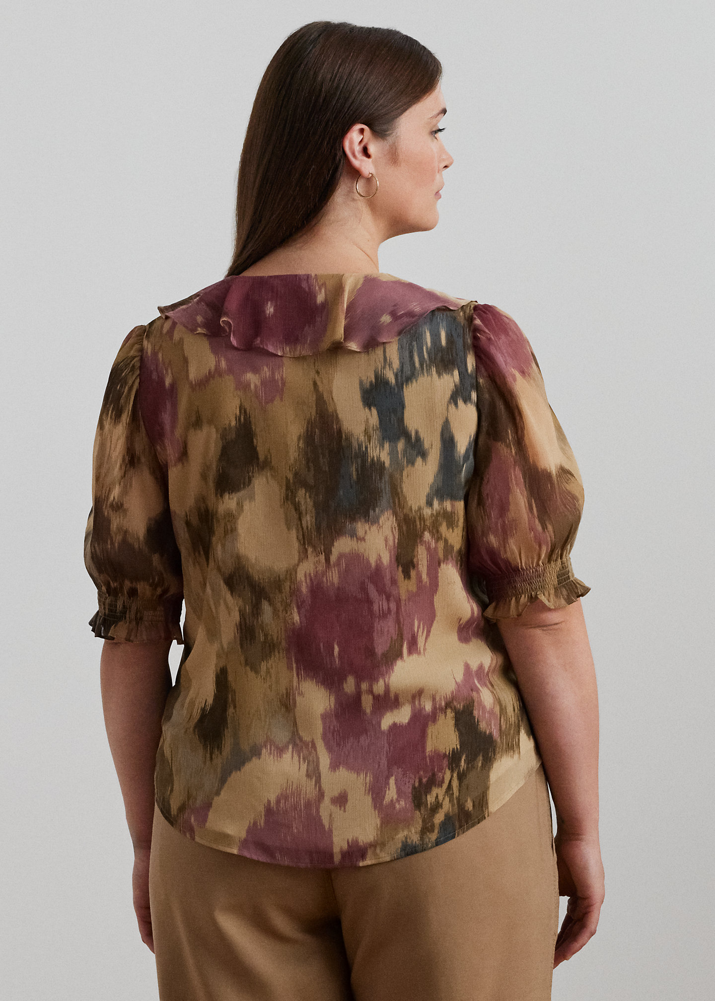 - Elbow-length blouson sleeves with ruffle-trimmed smocked cuffs. Shirring into the sleeve caps.