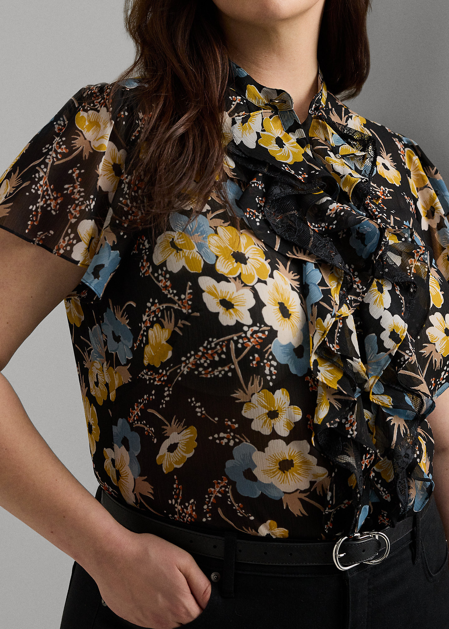 - Cascading lace-and-georgette ruffles inset at the placket. Shirttail hem.