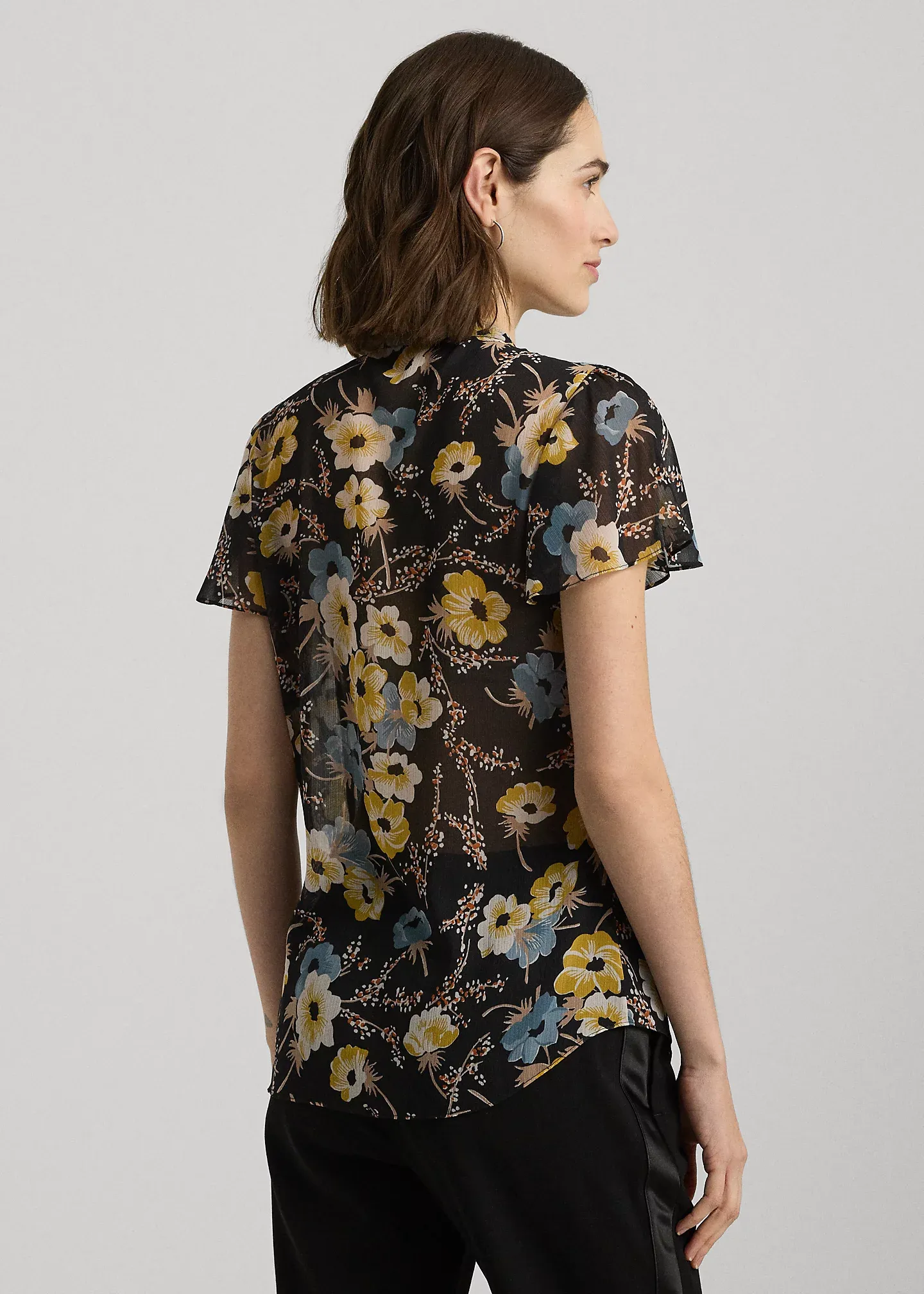 - Cascading lace-and-georgette ruffles inset at the placket. Shirttail hem.