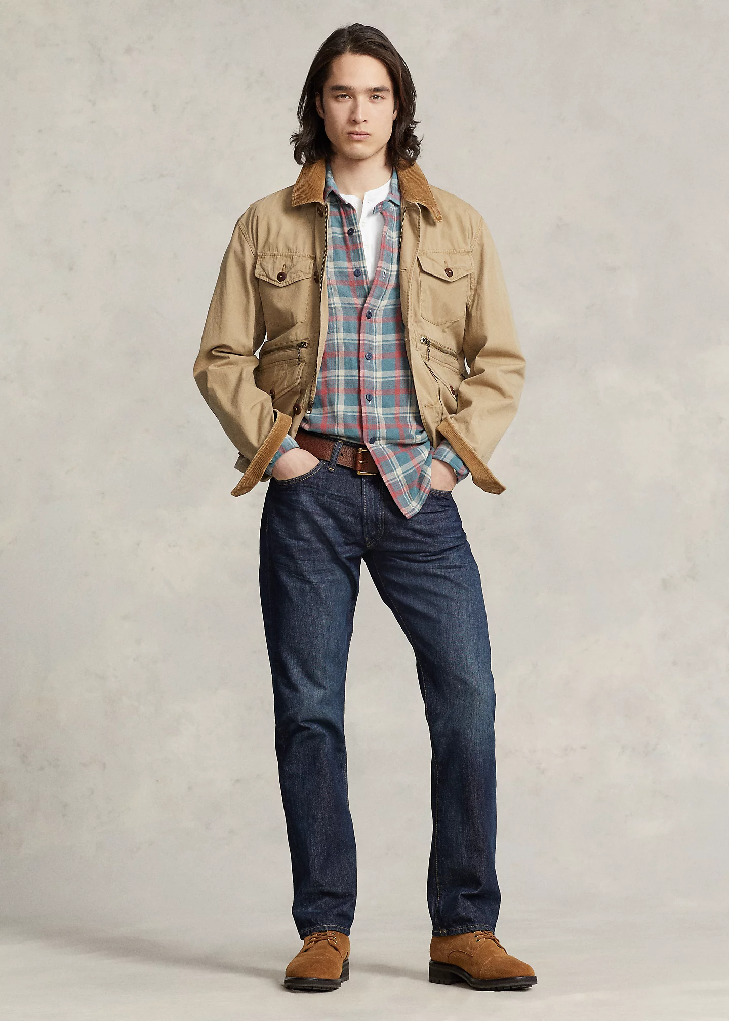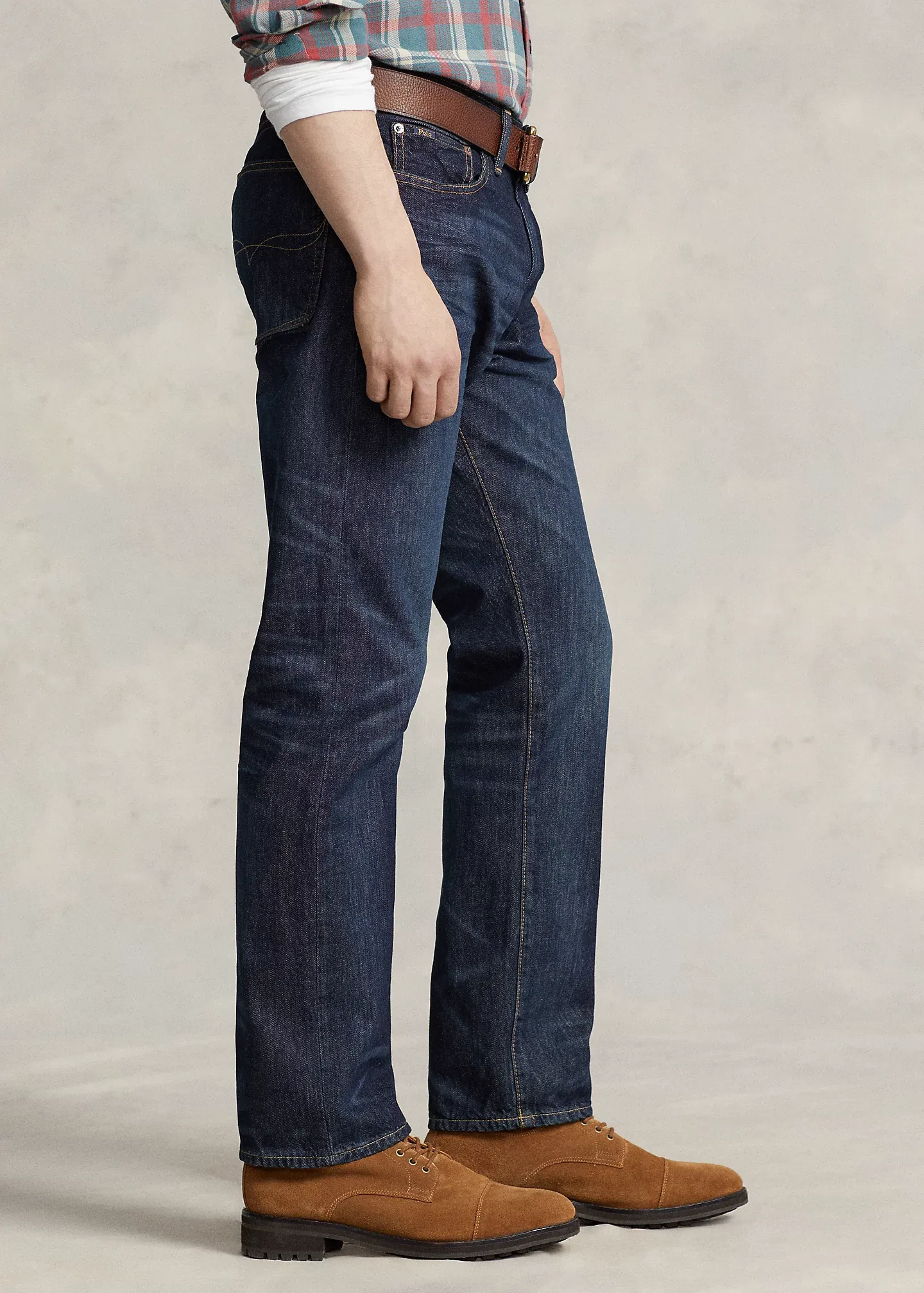 - Five-pocket styling with signature metal rivets. “Polo" label at the coin pocket.